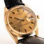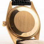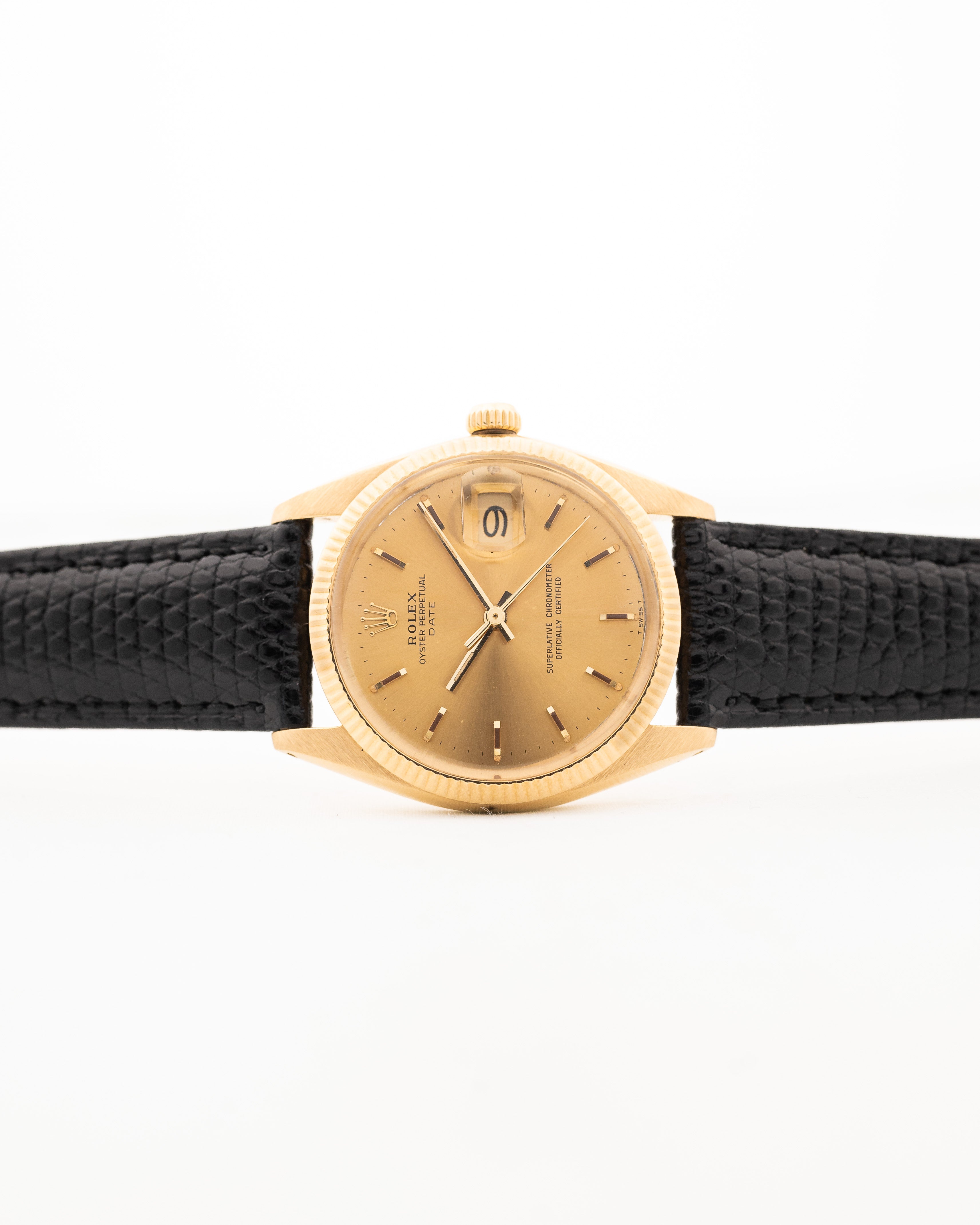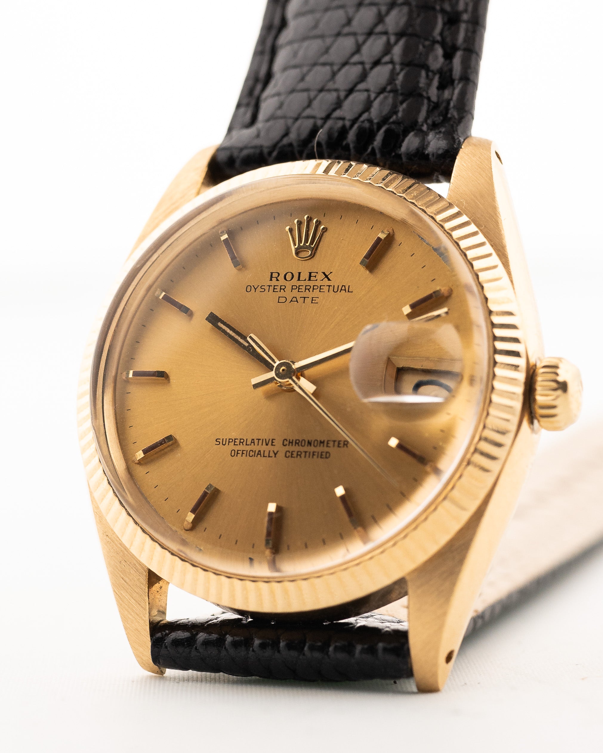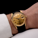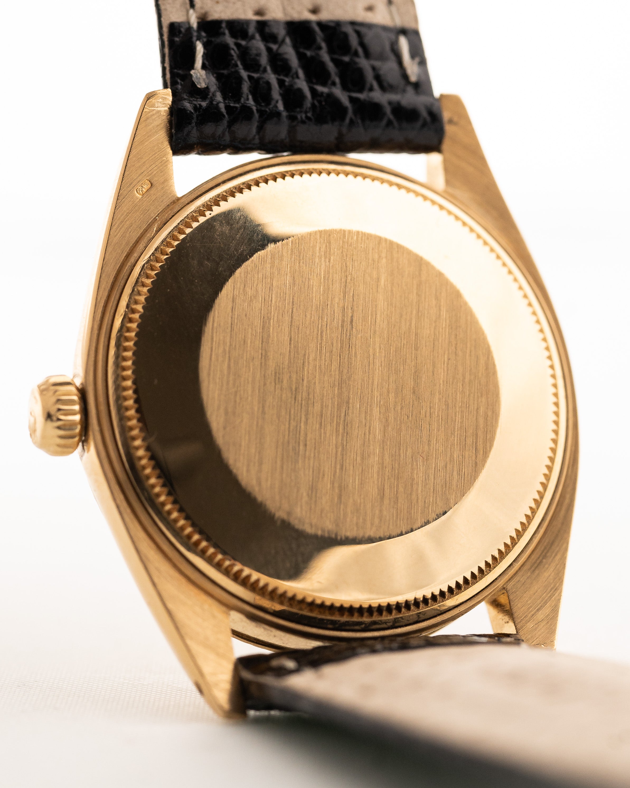 A solid yellow gold case with a fluted bezel and a beautiful and very rare golden colored sunburst dial with diamond cut stick hour markers keep the appearance simple and elegant.