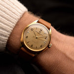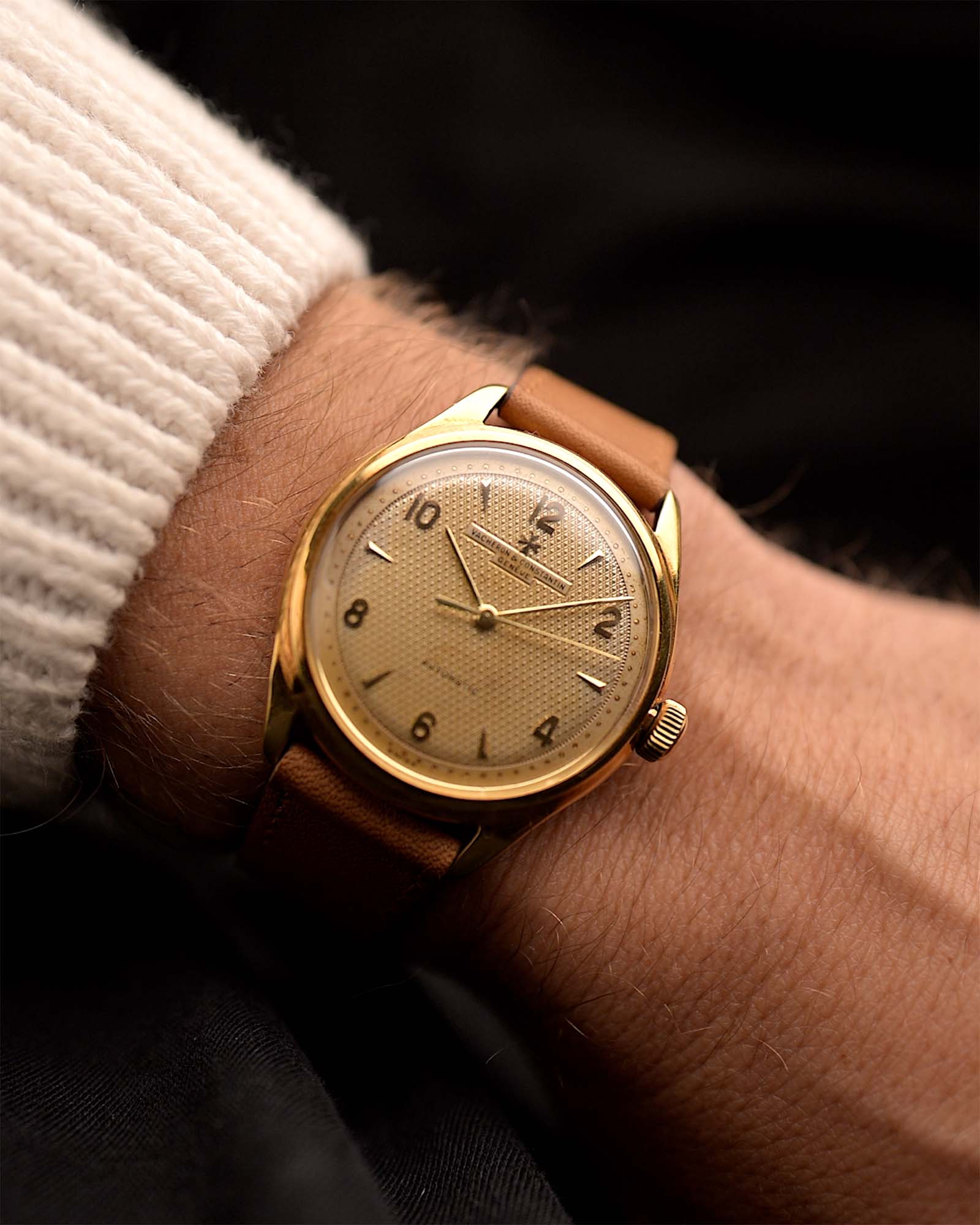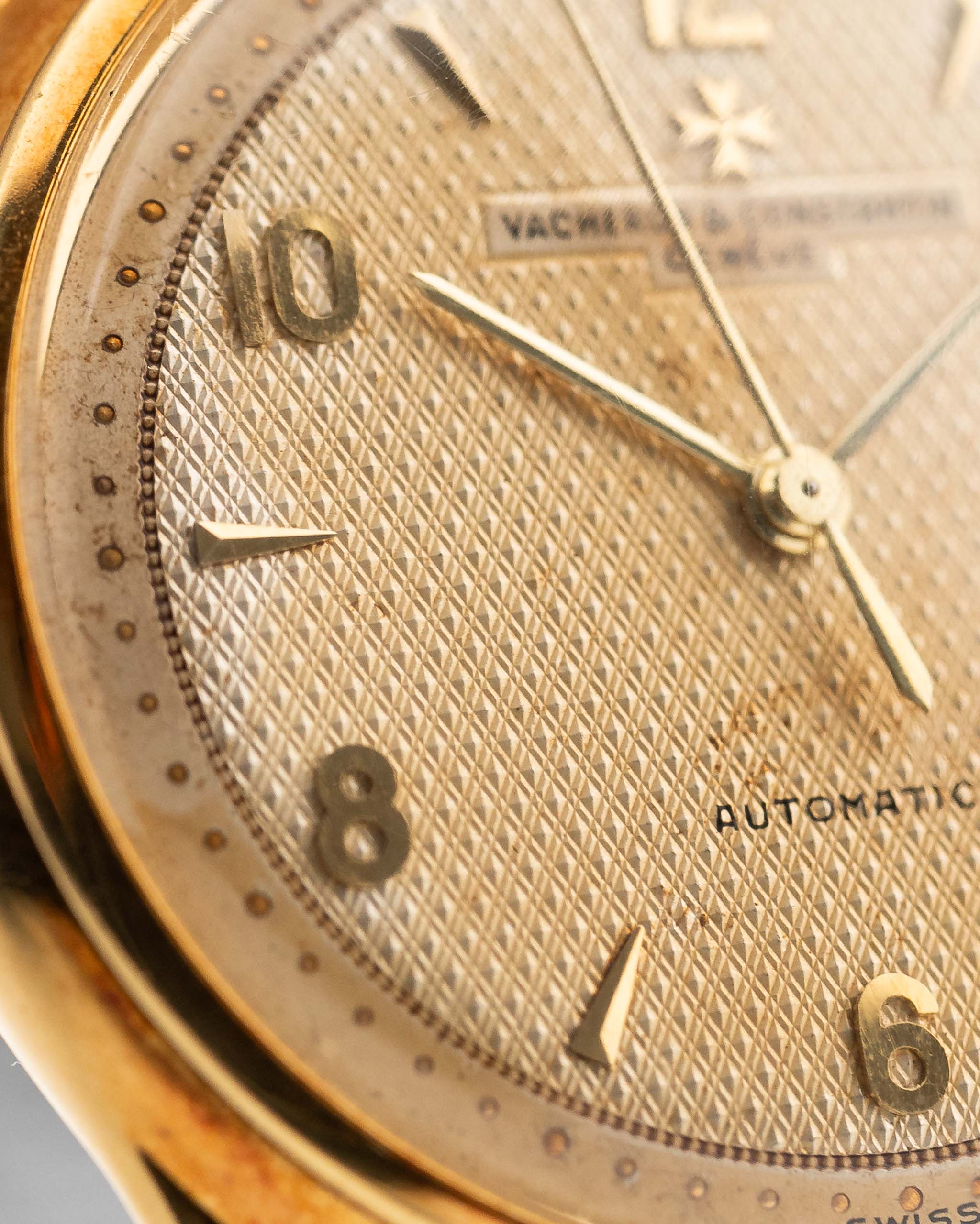 This exceptionally rare Vacheron Constantin dress watch from the 1950s represents the golden age of Swiss watchmaking. Housed in a robust 35 mm 18k yellow gold Spillman case, it balances strength with refinement. The dial features an exquisite cream Guilloché pattern, softly aged with a warm golden patina, and accented by elegant hands and applied indices.