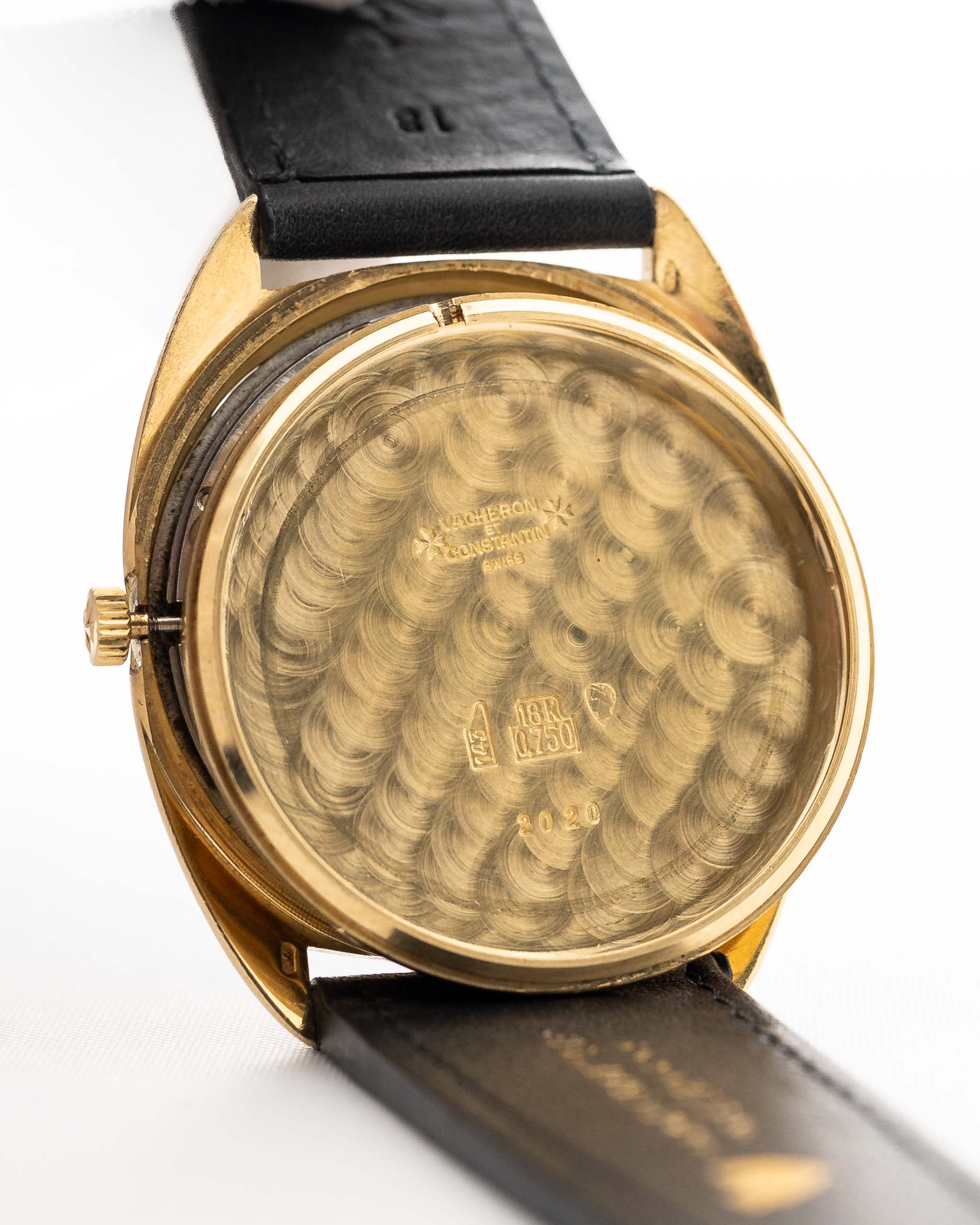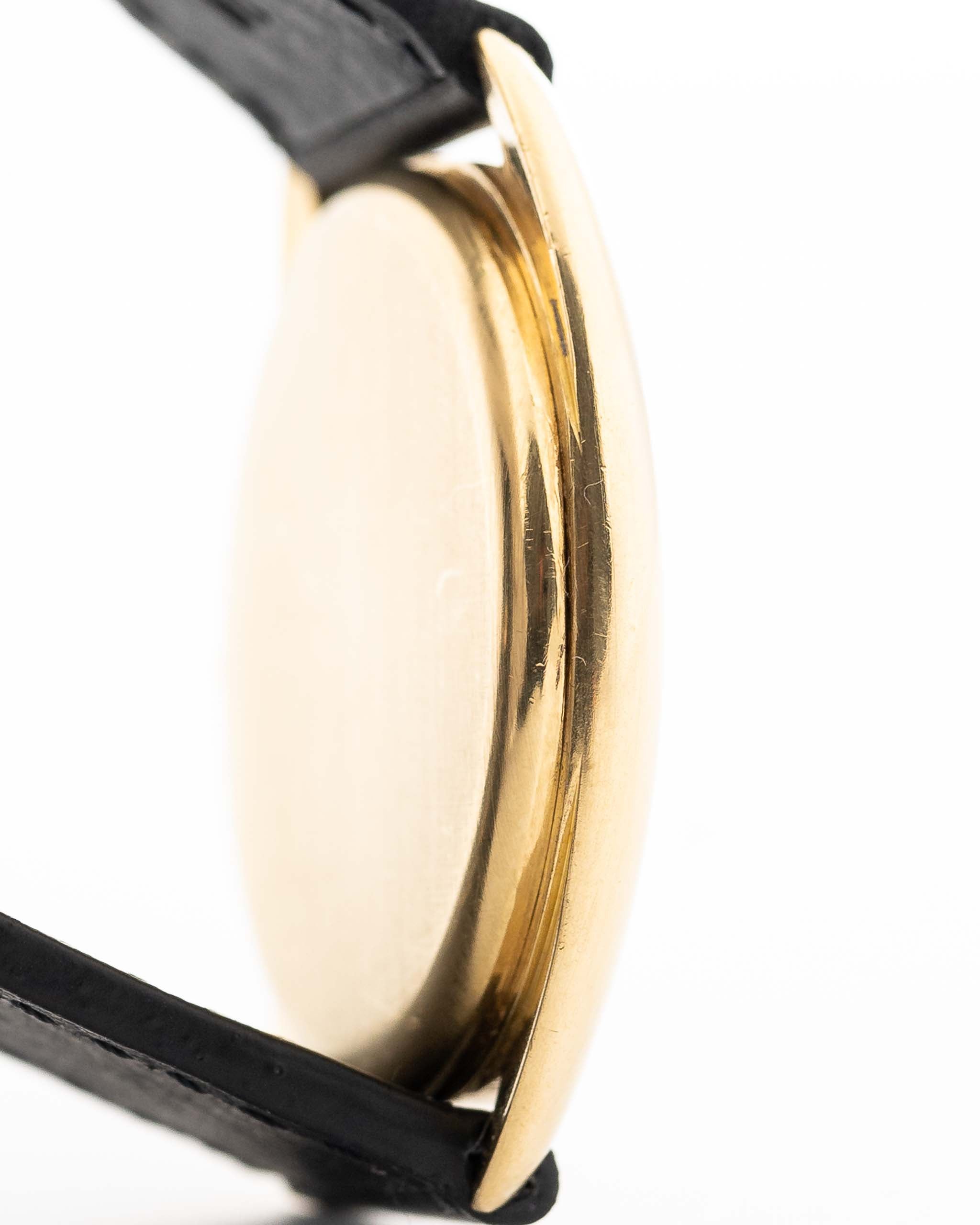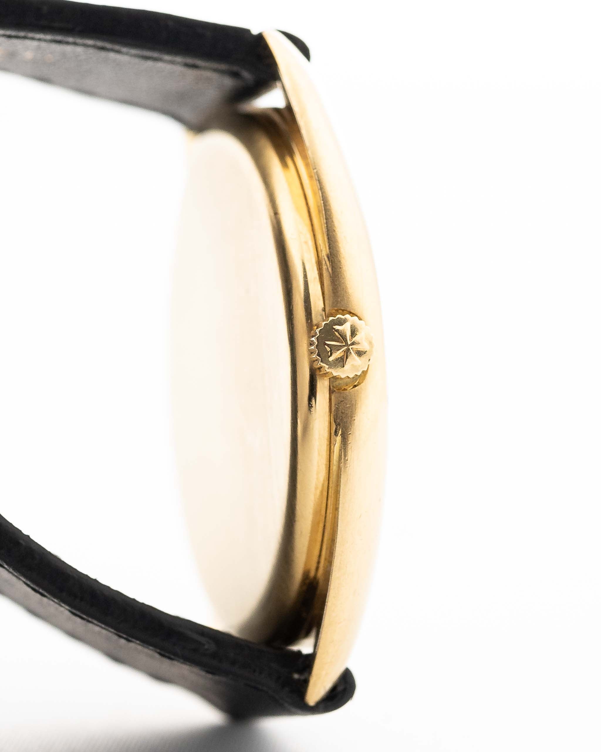 This Vacheron Constantin Ref. 2020 from the 1950s captures the charm of mid-century design with a bold twist: an elegant tonneau-shaped case in solid 18k yellow gold paired with a deep matte black dial — a combination rarely seen and effortlessly striking.