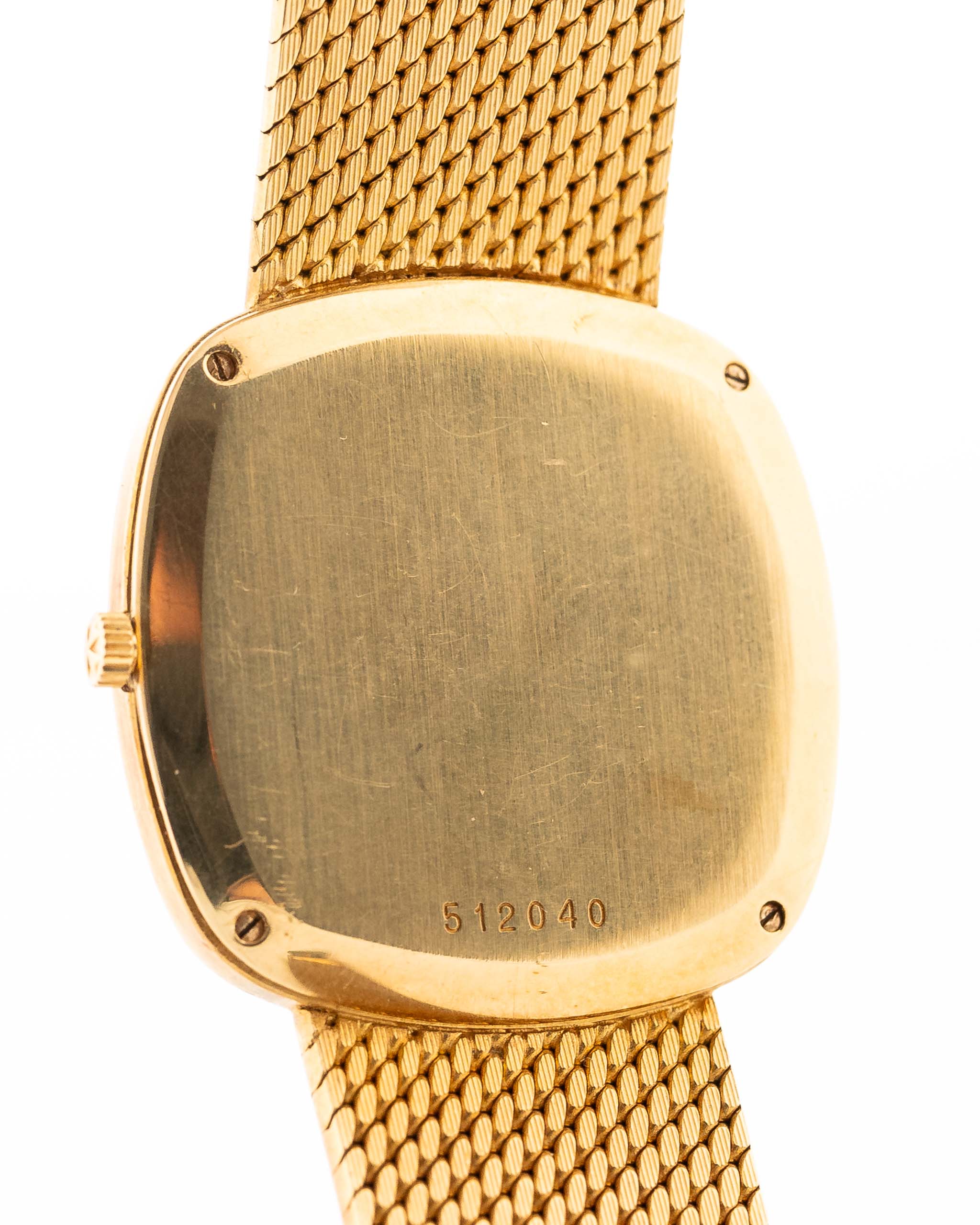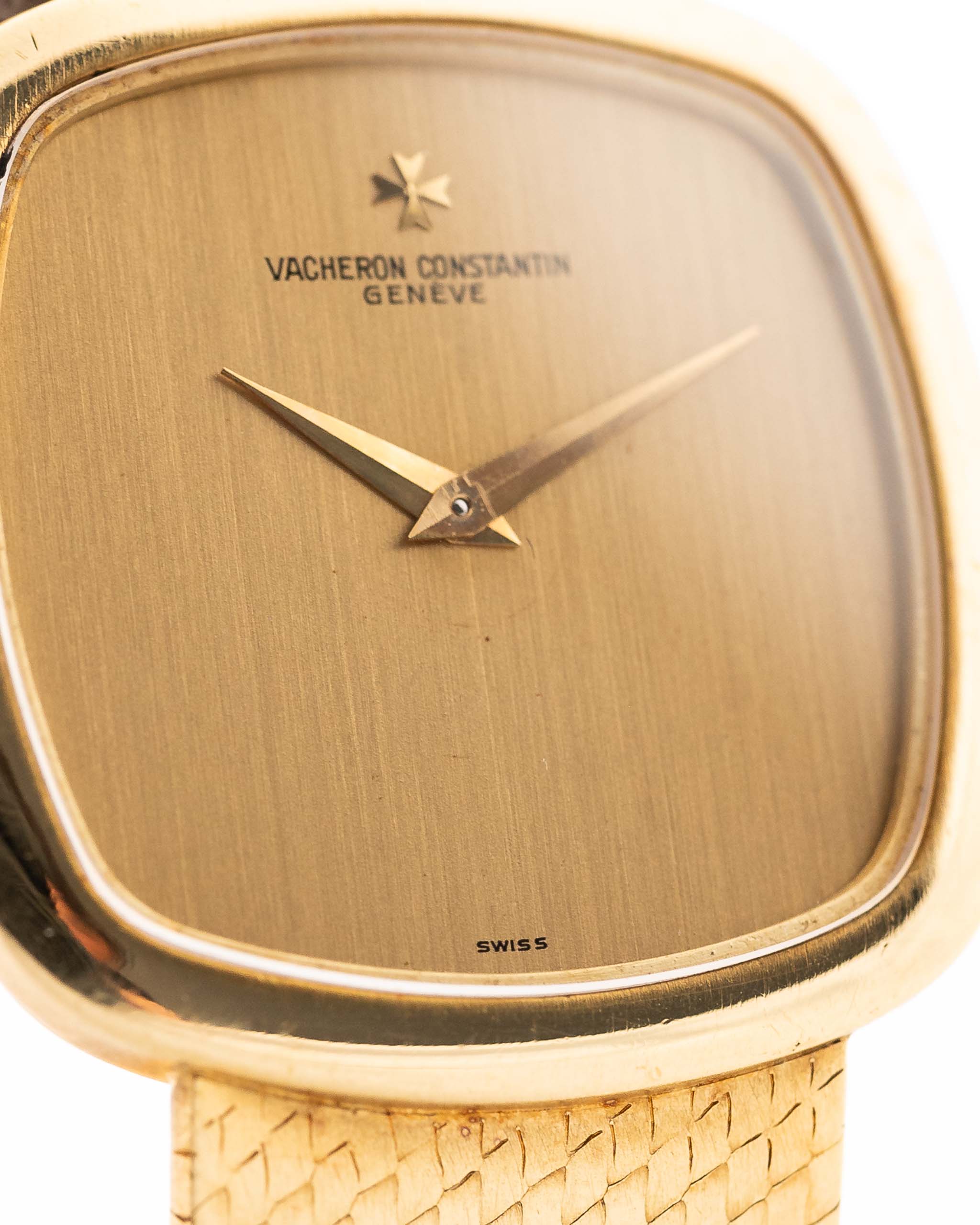 This 1970s Vacheron Constantin Reference 2099 is a masterclass in minimalist luxury. Housed in a cushion-shaped 18k yellow gold case, the watch features a vertically brushed golden dial that exudes quiet sophistication. The applied Maltese cross logo and original gold hands elevate the clean design with signature VC refinement.