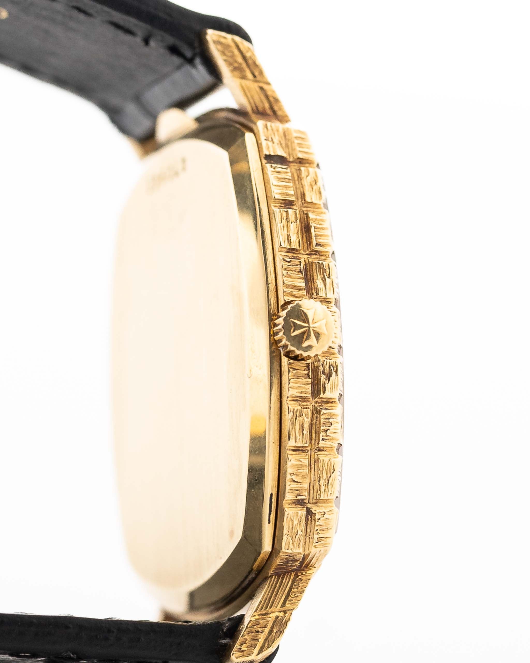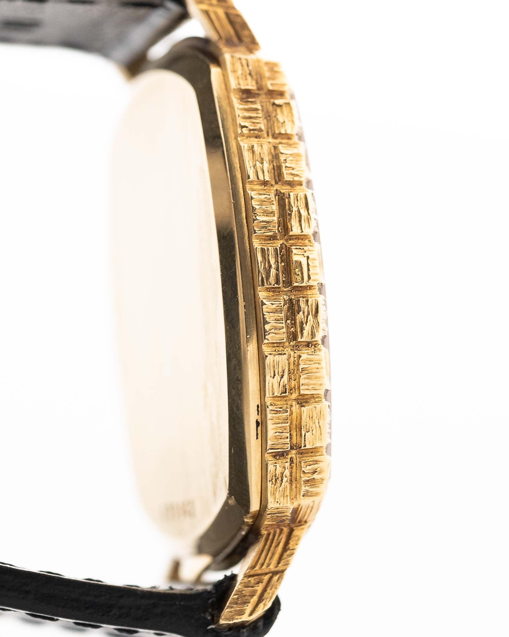 Here we have a beautifully finished 18k yellow gold Vacheron Constantin dress watch in a square case design from the 1970s. This particular piece is notable for its all over punched basket finishing on the case. It´s a true flagship for Swiss craftsmanship of the 1970s. The golden Ombre dial with stick handset and hour markers is sticking a figure at any occasion.