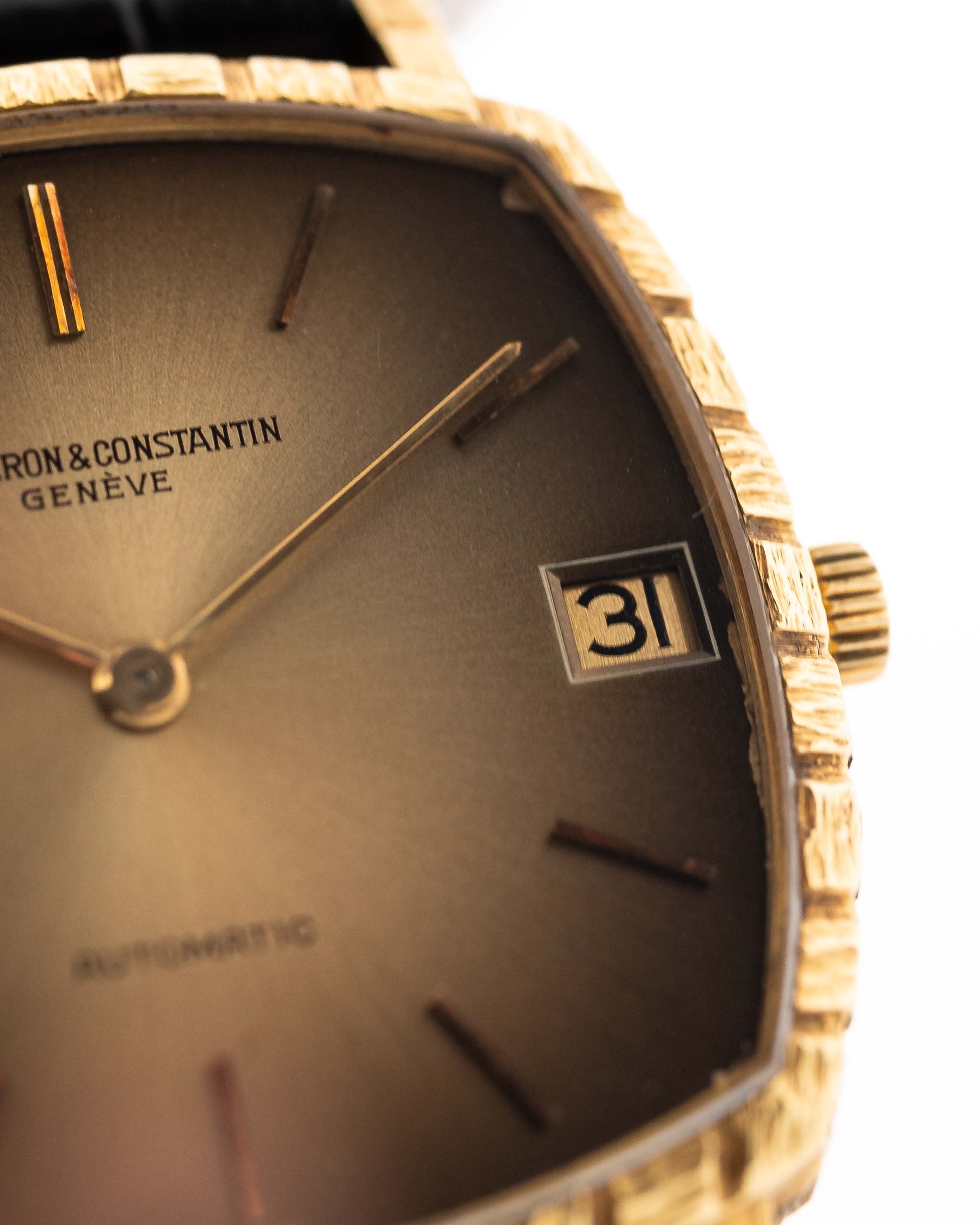 Closeup Photo of a Vacheron Constantin 7390 Basket Ombre from the 1970s. 32mm case in 18k Yellow Gold with Automatic Cal. K1121, Original golden ombre dial and Leather Strap.
