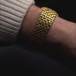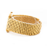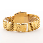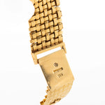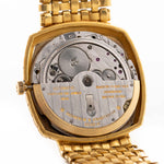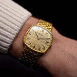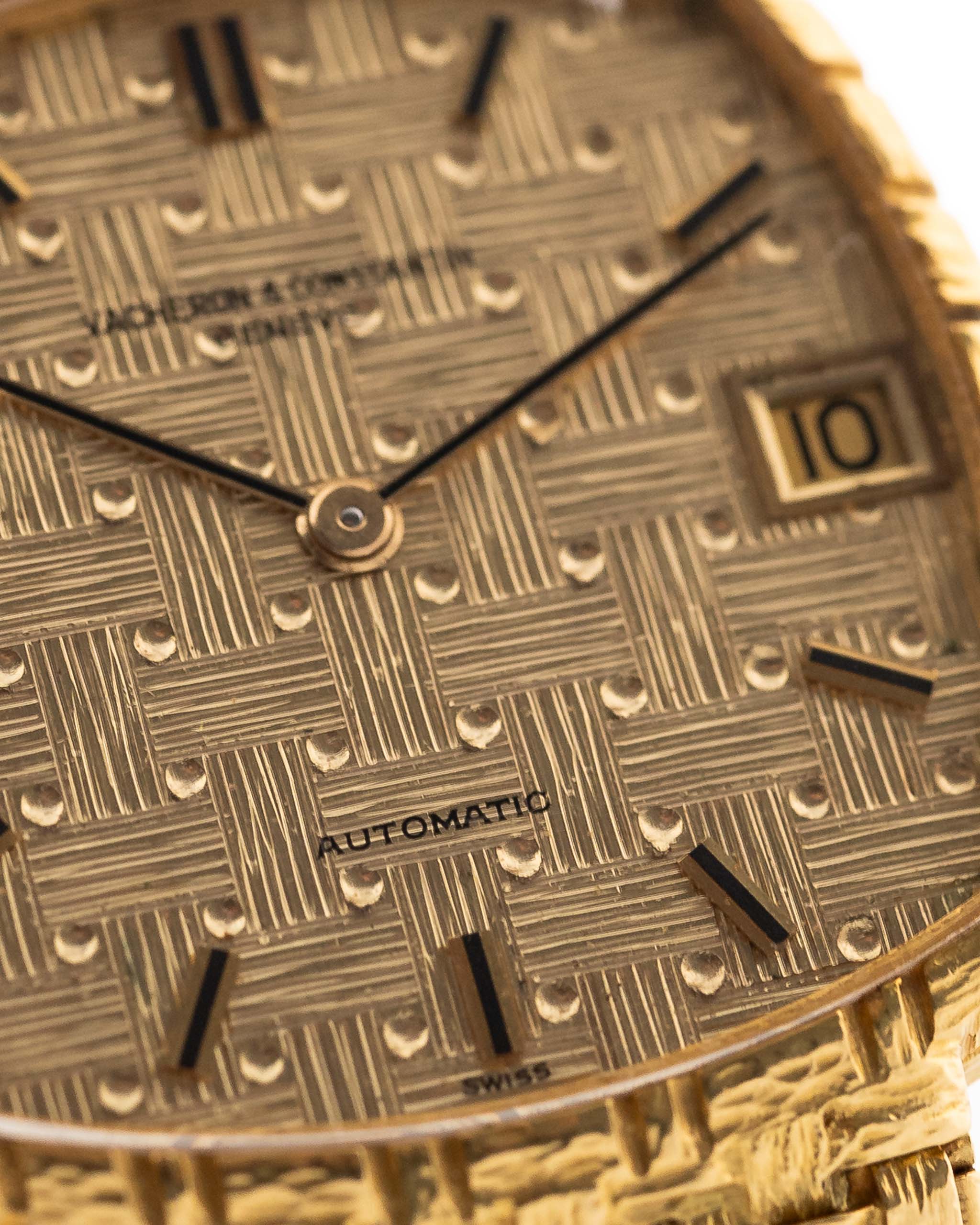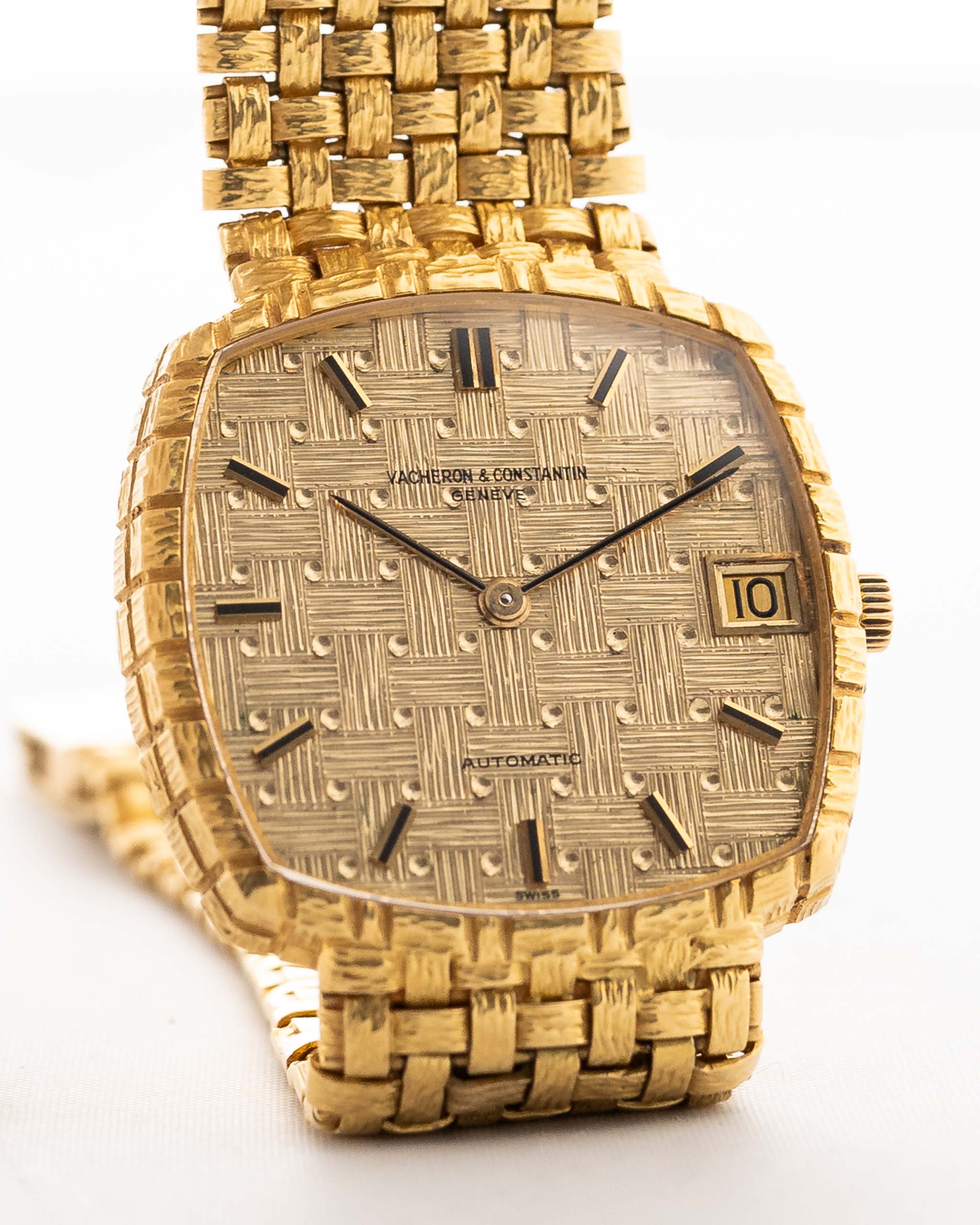 The integrated 18k yellow gold woven basket bracelet withe the matching case and dial design makes this Vacheron Constantin so unique. The gold dial is equipped with the fine VC typo, stick hands and baton hour markers with onyx inlays. With the super soft basket bracelet the watch is wearing like a second skin.