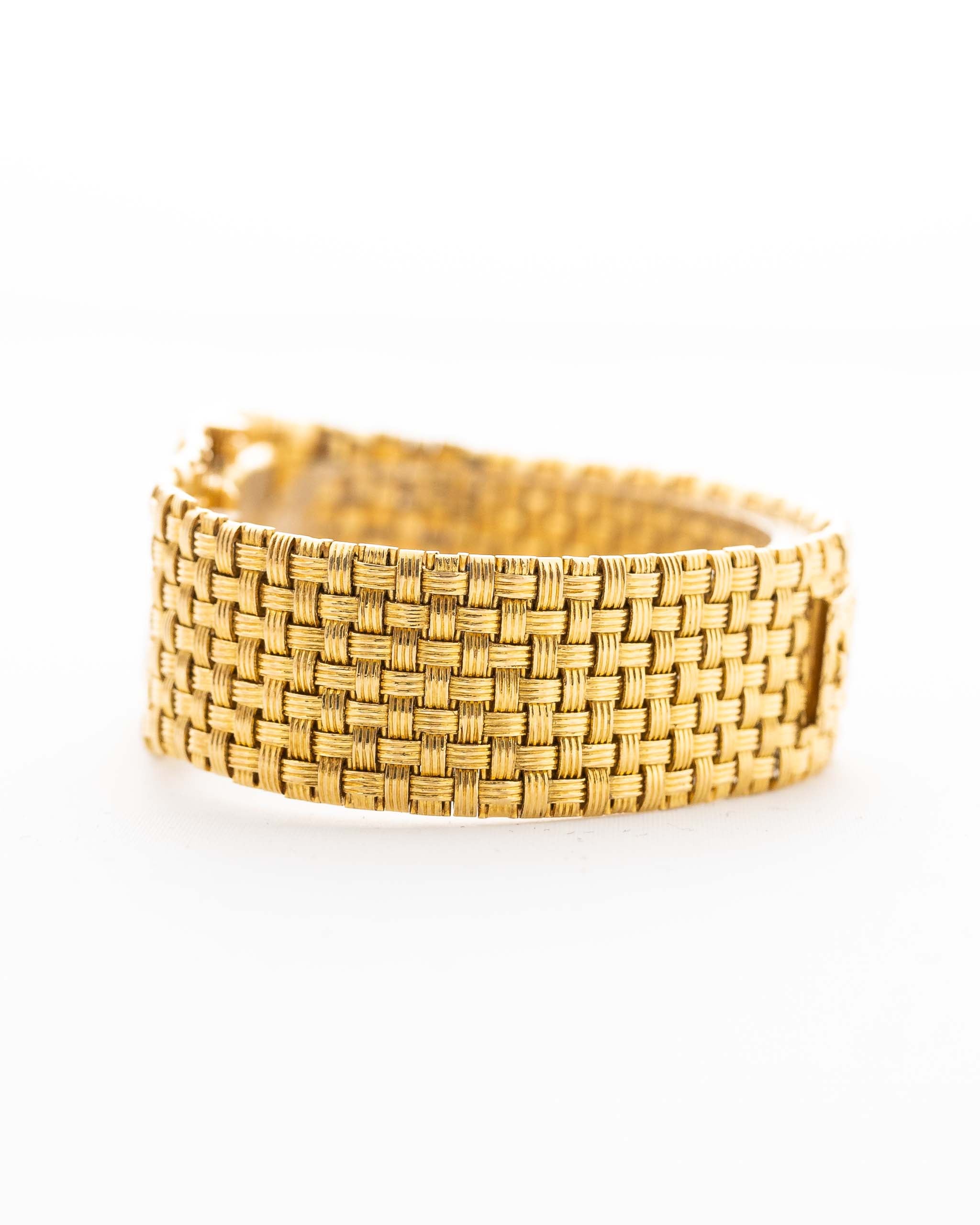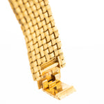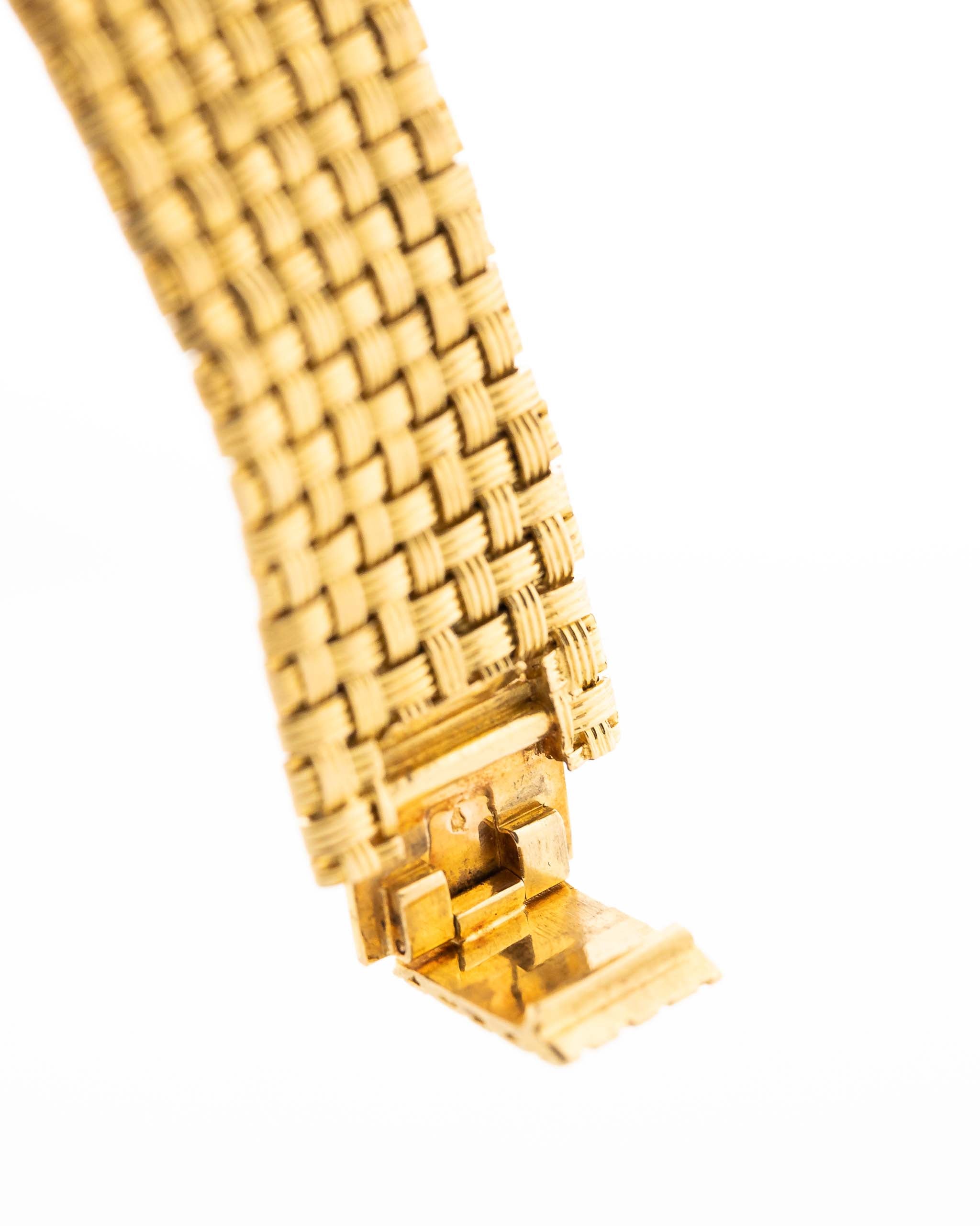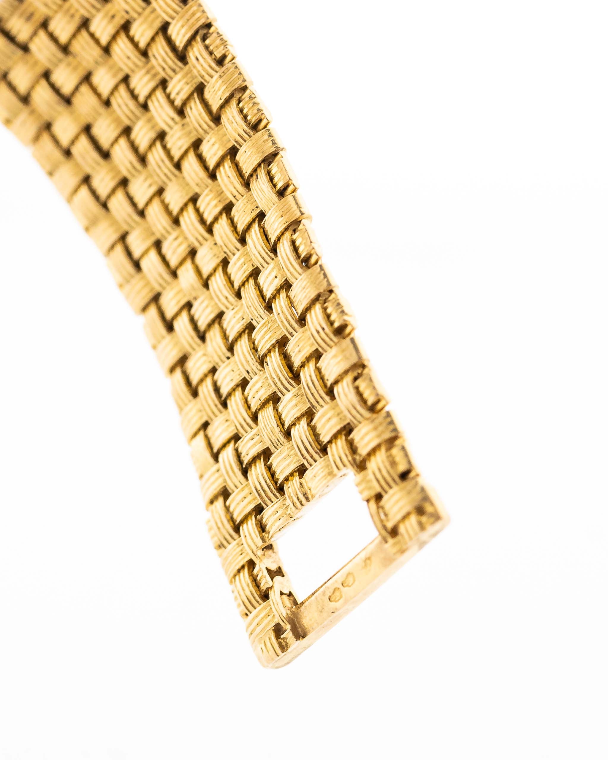 The integrated 18k yellow gold woven basket bracelet with the matching case design makes this Vacheron Constantin so unique. The golden dial is equipped with the fine VC typo, dauphine hands and factory diamond in the Maltese cross logo. With the super soft basket bracelet and slightly curved case shape the watch is wearing like a second skin.