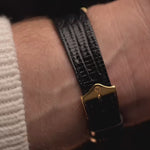 Crafted from fine italien calf leather, the embossed lizard pattern provides an exotic, shiny texture while remaining sustainable. At just 2 mm thin, it fits your wrist perfectly from the first wear. The unique tapered shape is a discreet complement and builds a well deserved frame for your classic vintage watch.