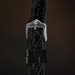 The Kardinal Alligator-embossed strap is inspired by the elegance and refined textures of the golden age of watchmaking. Each piece is made by hand, with great care and attention to detail. It has a unique character and a lively appearance — it is the perfect companion for your vintage beauty.
