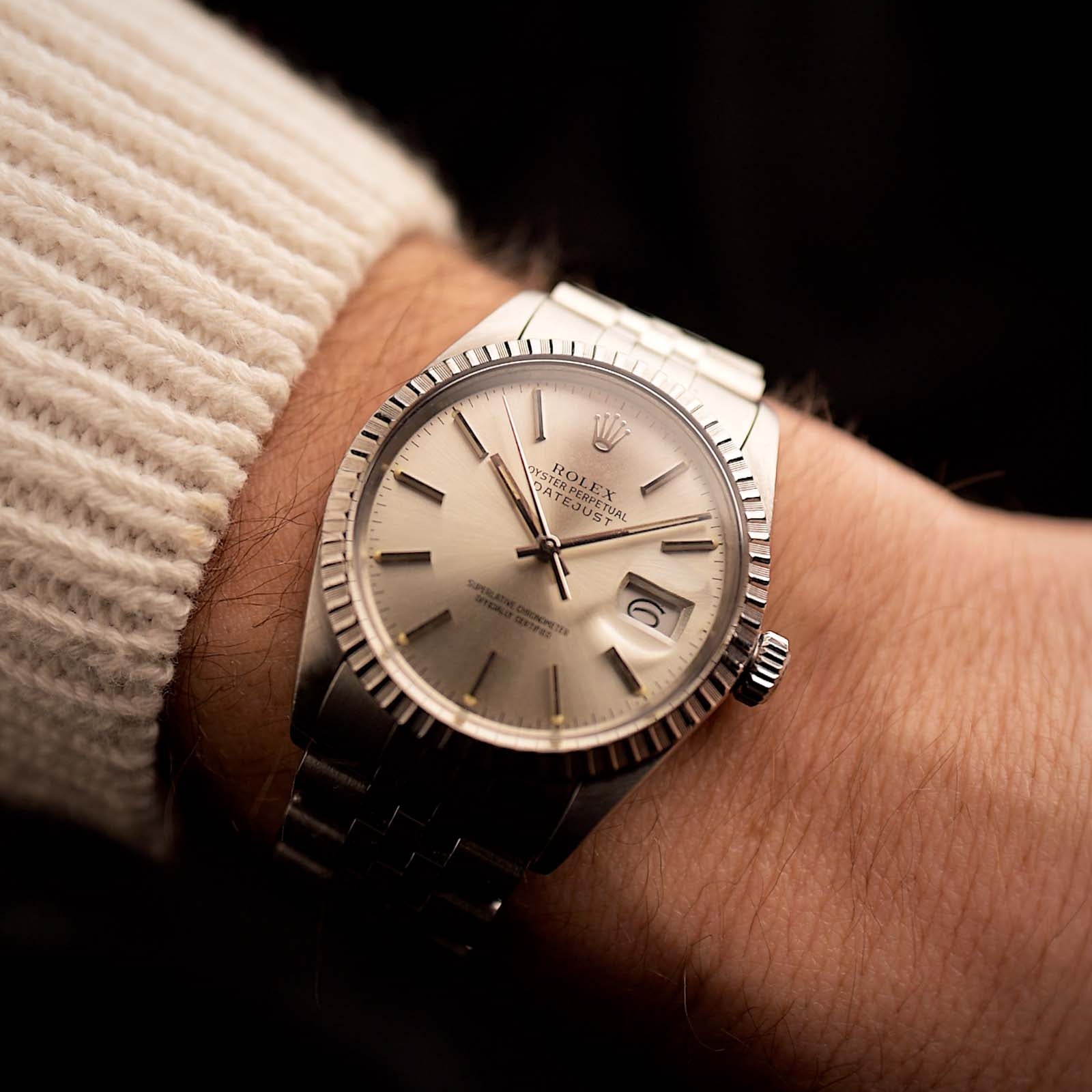 Zifferblatt. Es gibt ein Zifferblattlayout - arabische 12 und Punktmarkierungen. Es gibt sie in klassischem Weiß/Creme oder Gold und mit einer blauen Tachymeter- oder Sekunden-Skala. Außerdem finden Sie diese Uhren mit facettierten Dauphine- oder Alpha-Zeigern (auch leuchtende Dauphine-Zeiger sind möglich). Die Zifferblätter sind bei 6 Uhr mit "Swiss" signiert.