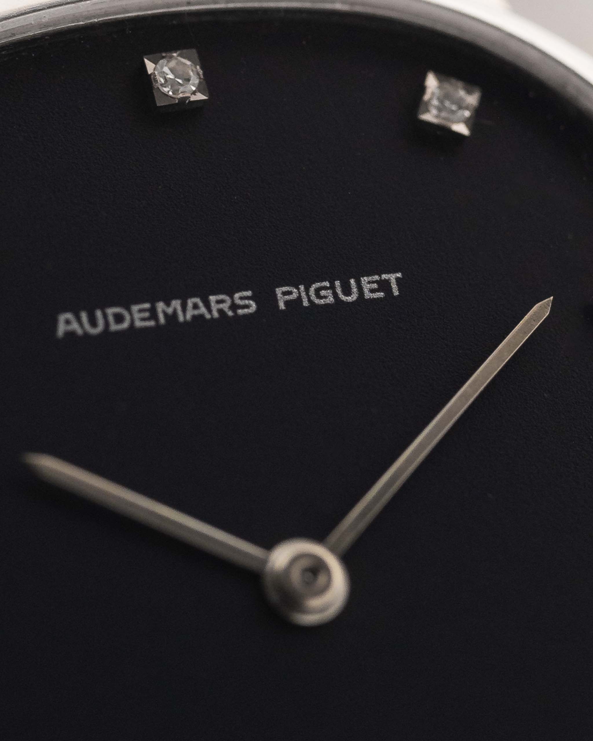 Audemars Piguet Vintage Weißgold Diamond Ellipse 1970er Jahre mit schwarzem Zifferblatt und 18k Weißgold AP-Armband Nahaufnahme