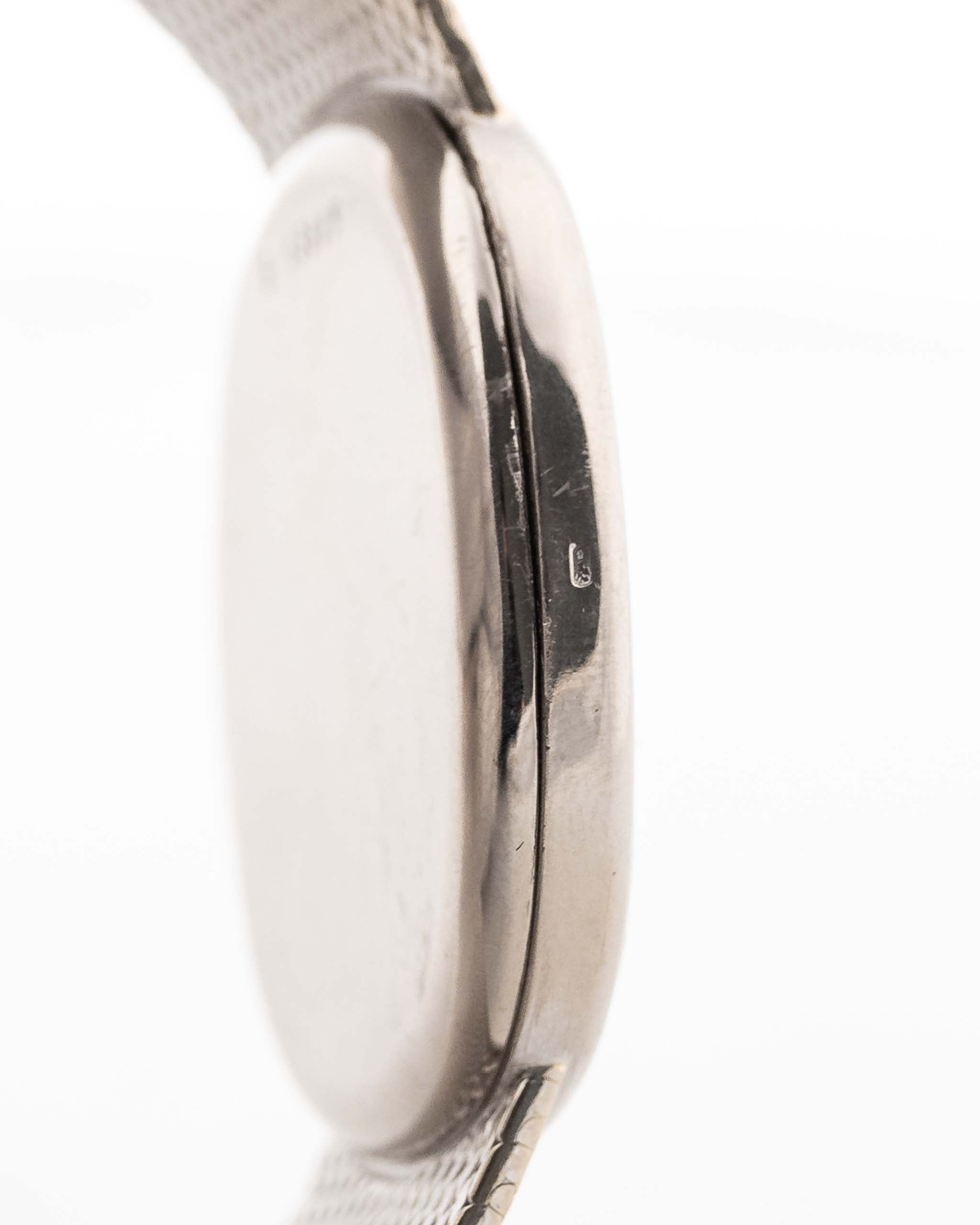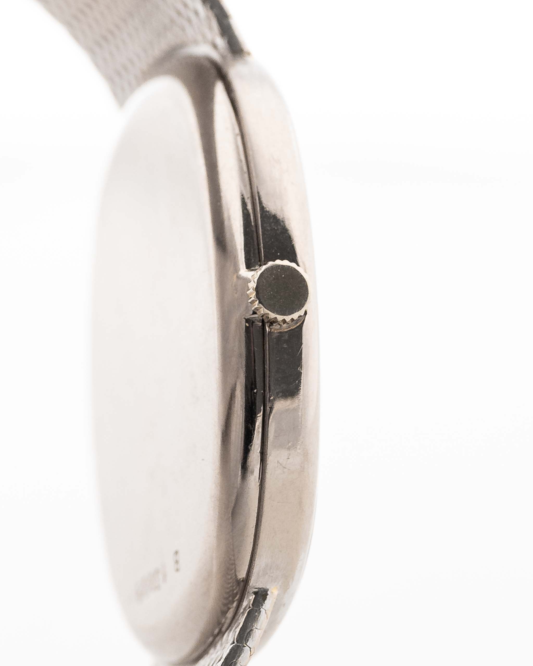 Das Gehäuse aus 18 Karat Weißgold mit einem Durchmesser von 31 mm ist in gutem Zustand und mit einem einzigartigen Armband aus 18 Karat Weißgold veredelt. Das ultraflache Kaliber 2120 in Kombination mit dem massiven Weißgoldarmband lässt diesen Zeitmesser wie eine zweite Haut wirken.