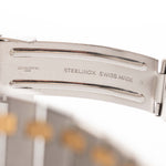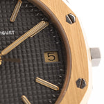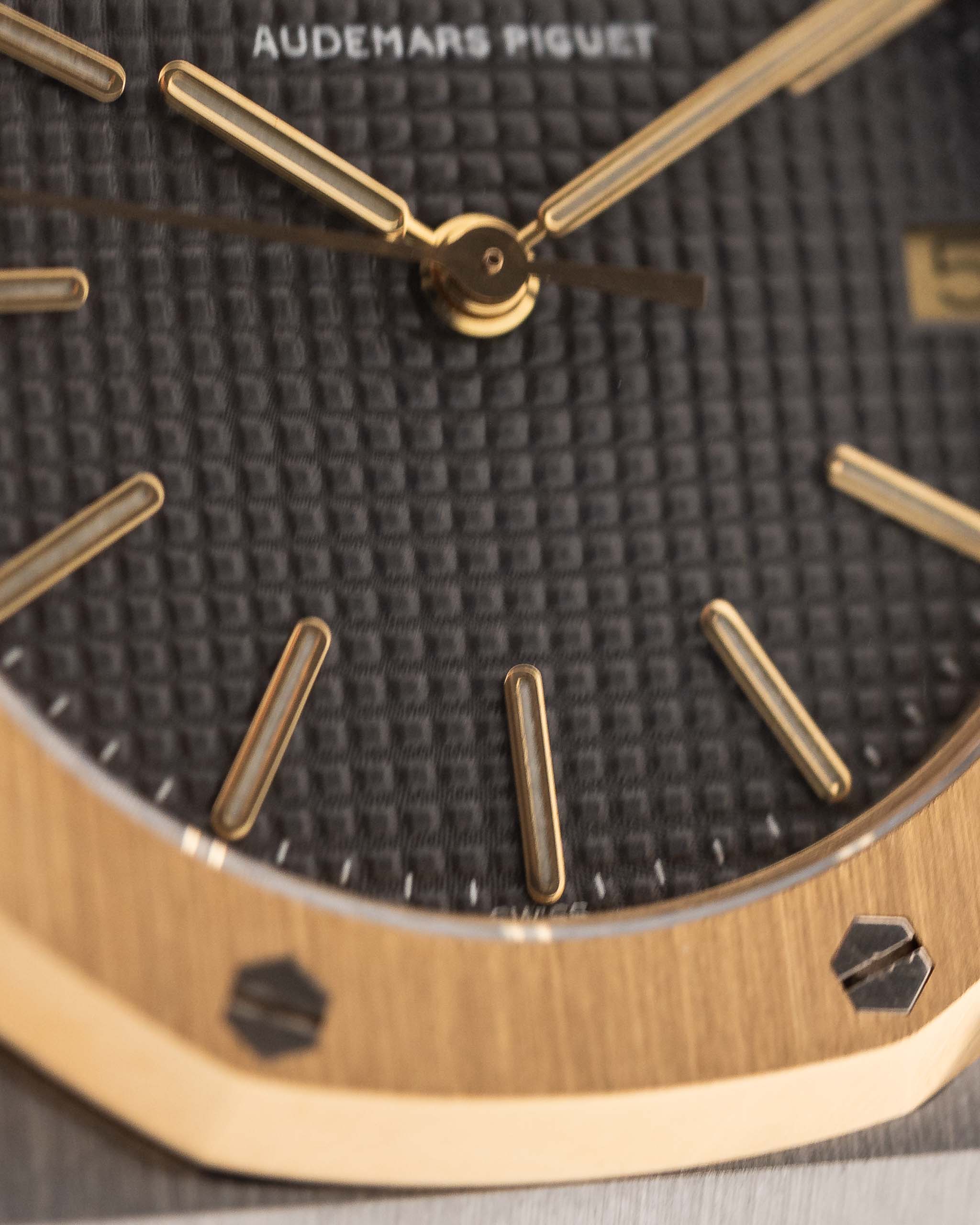 Diese zweifarbige Ausführung aus Edelstahl und 18 Karat Gelbgold strahlt subtilen Luxus aus und bewahrt gleichzeitig den industriellen Geist des Originals. Das graue Tapisserie-Zifferblatt, unberührt und in makellosem Zustand, verfügt über ein appliziertes goldenes AP-Logo, leuchtende Strichindizes und passende Zeiger - allesamt mit gleichmäßiger, natürlicher Alterung, die den Vintage-Charakter unterstreicht.
