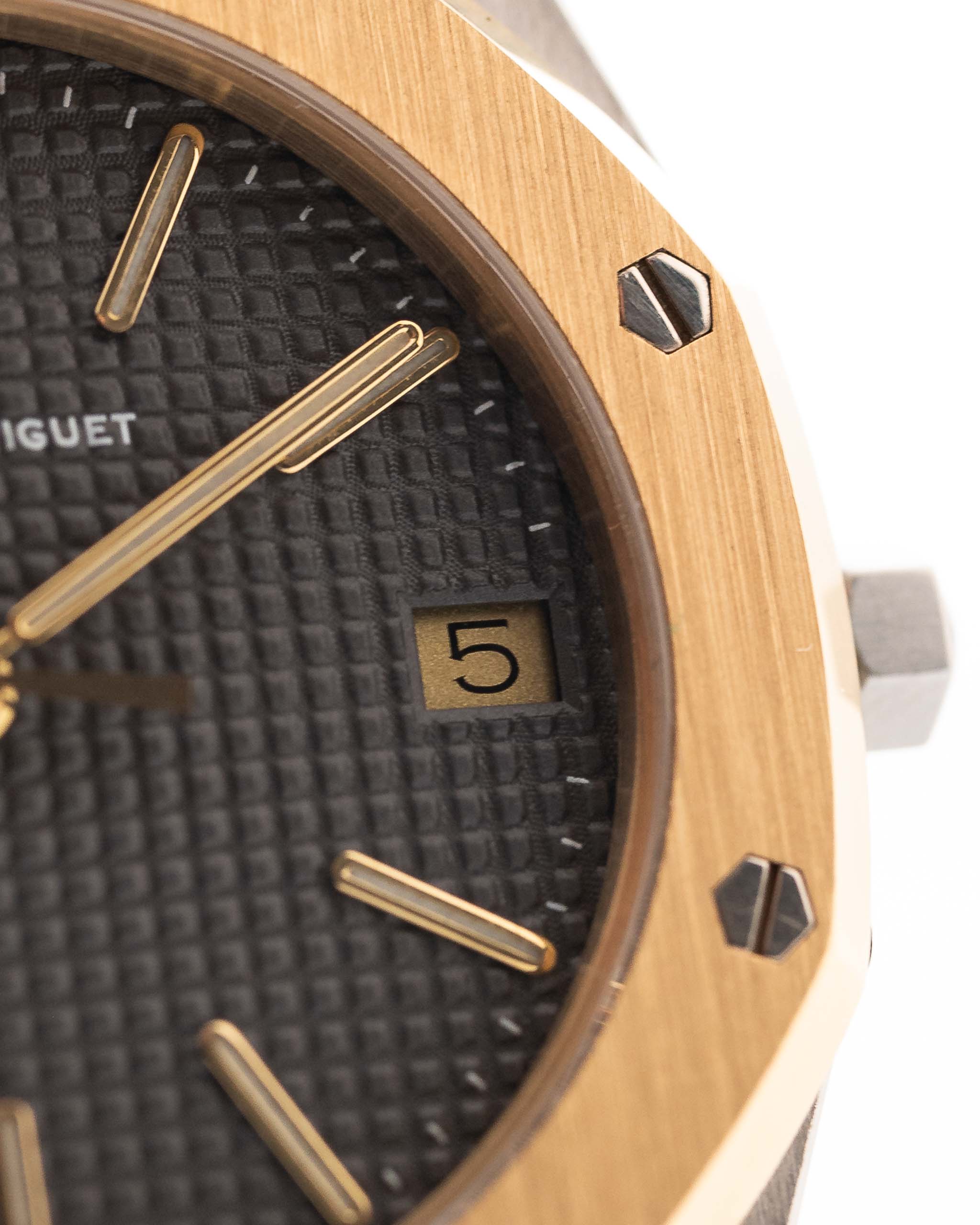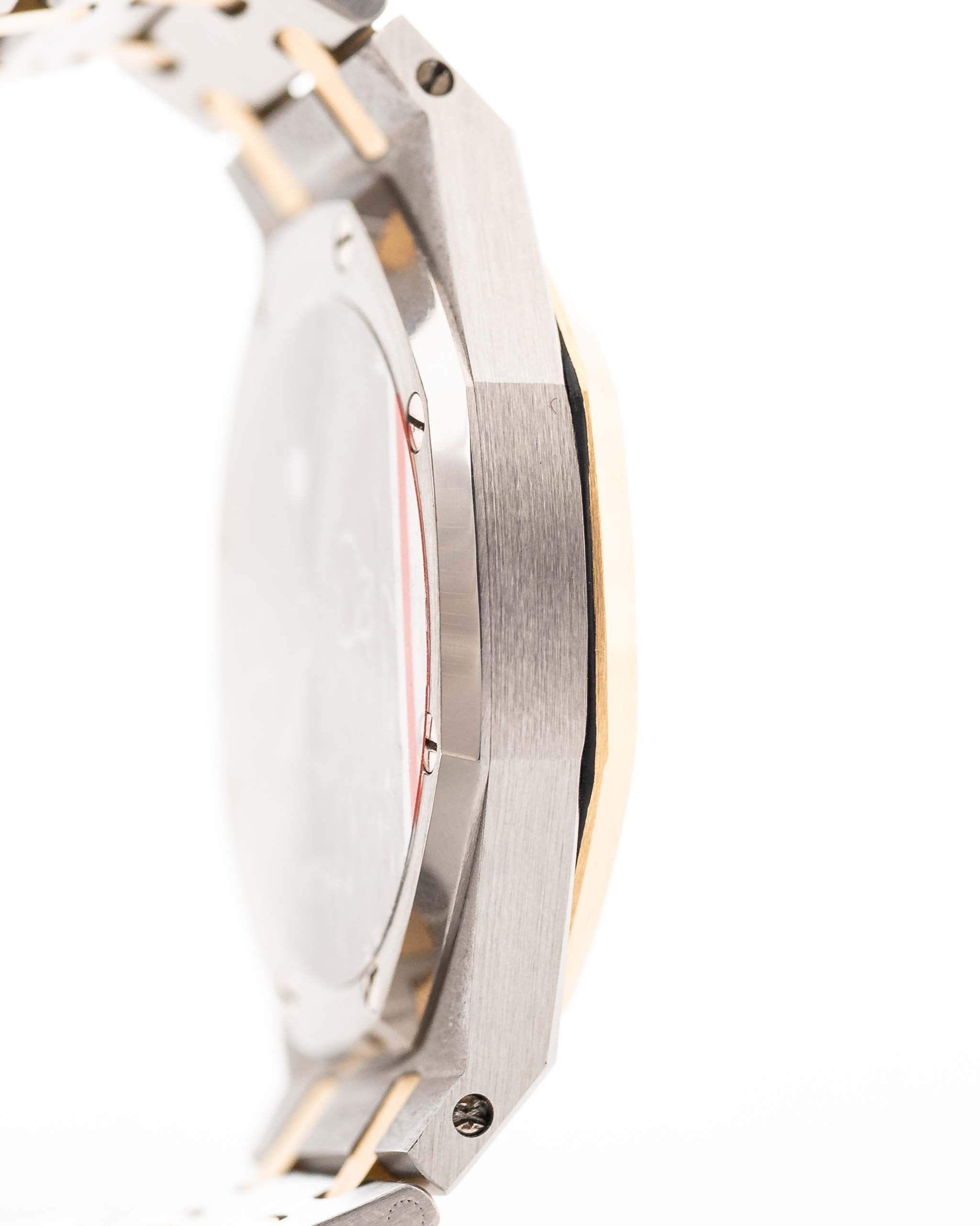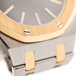 Vintage Audemars Piguet 4100SA Royal Oak Uhr aus den 1980er Jahren an einem Handgelenk. 36mm aus Edelstahl & 18k Gelbgold mit seltenem makellosem grauem Tapisserie-Zifferblatt, zweifarbigem Armband und Automatikwerk.