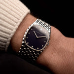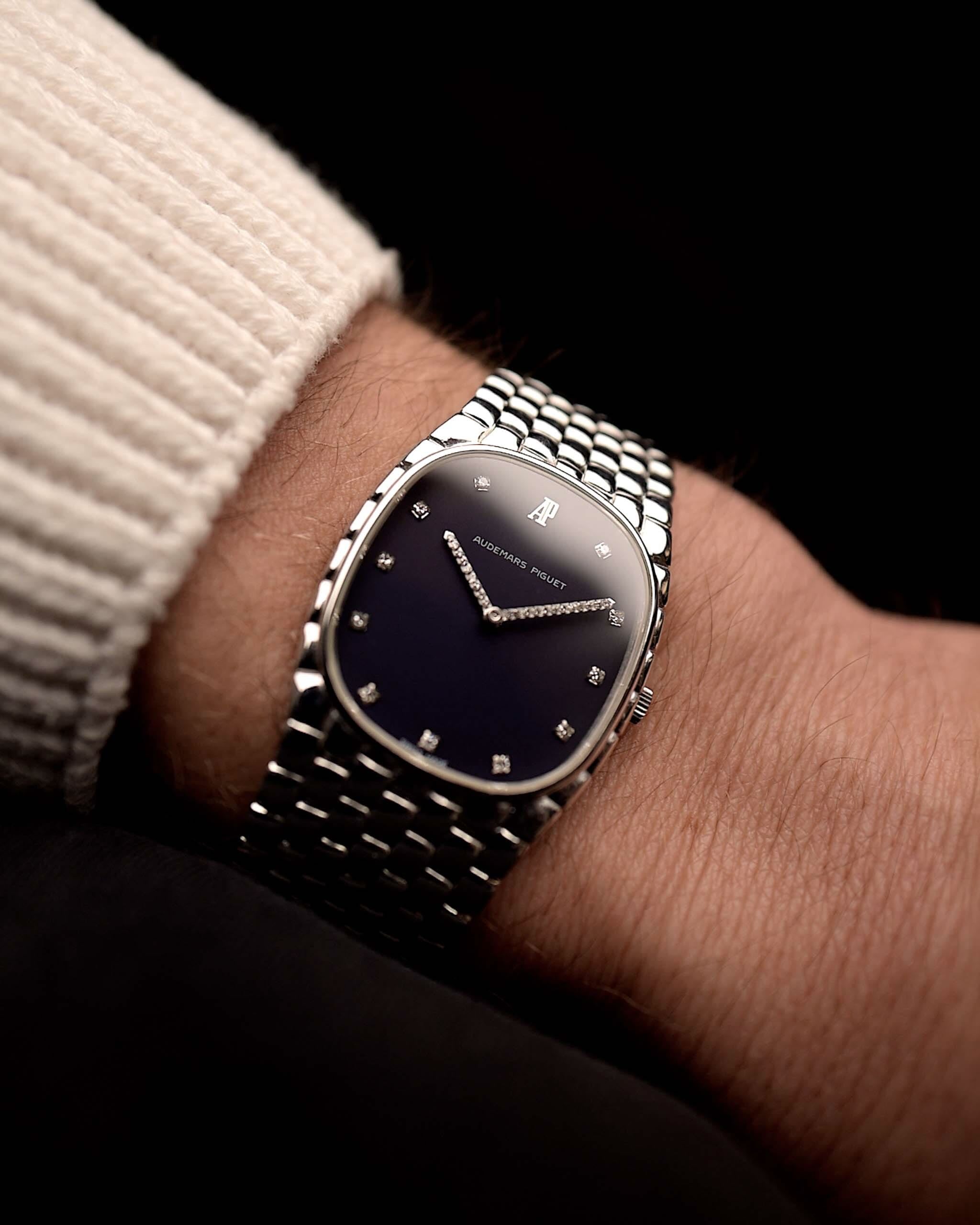 Nahaufnahme einer Audemars Piguet Cobra 18k Diamond Blue aus den 1990er Jahren. 29 mm aus 18 Karat Weißgold mit Handaufzugswerk, tiefblauem Zifferblatt, 32 Diamanten und verstellbarem Armband.