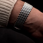 Nahaufnahme einer Audemars Piguet Cobra Bracelet 18k Diamond Blue aus den 1990er Jahren. 29 mm aus 18 Karat Weißgold mit Handaufzugswerk, tiefblauem Zifferblatt, 32 Diamanten und verstellbarem Armband.