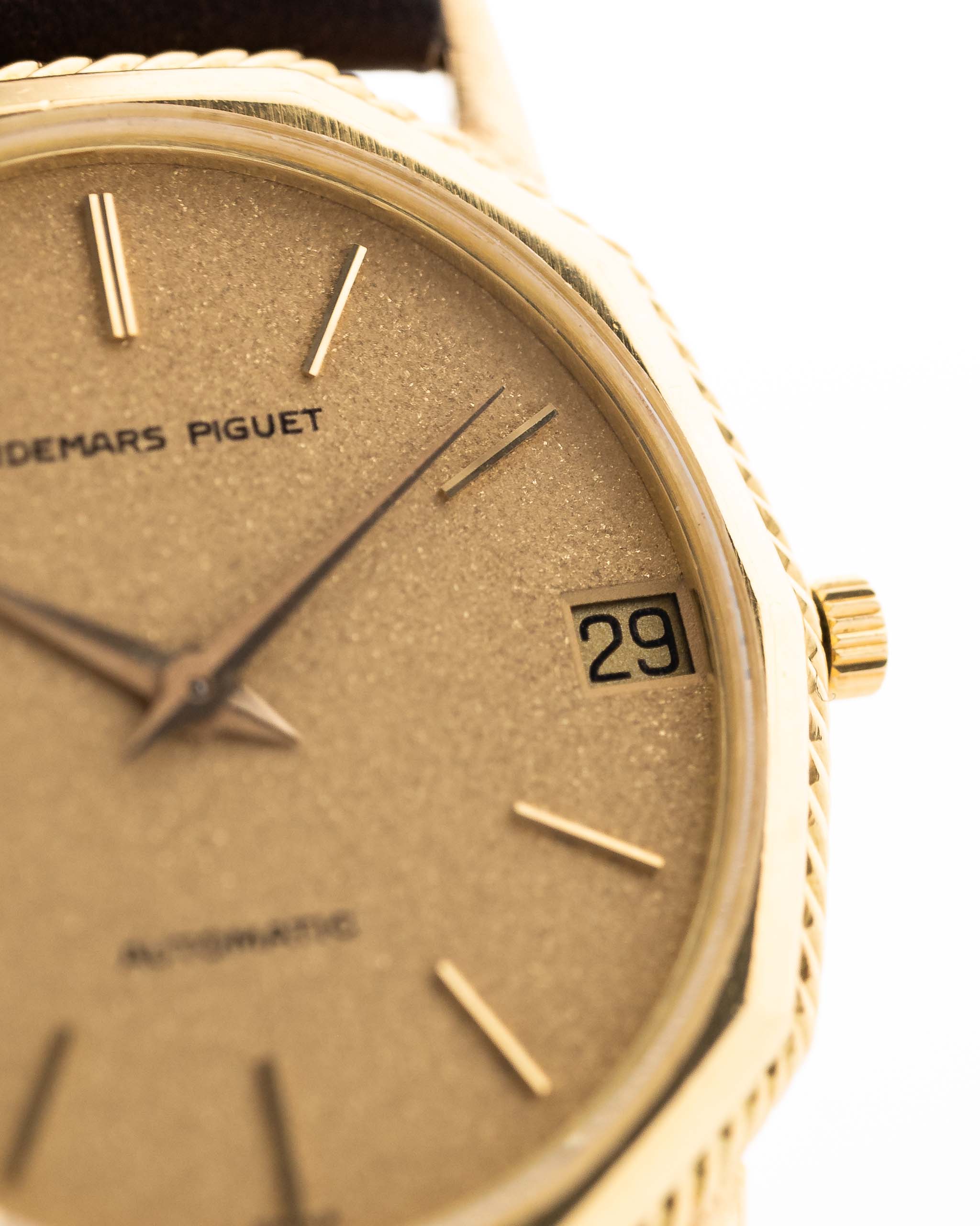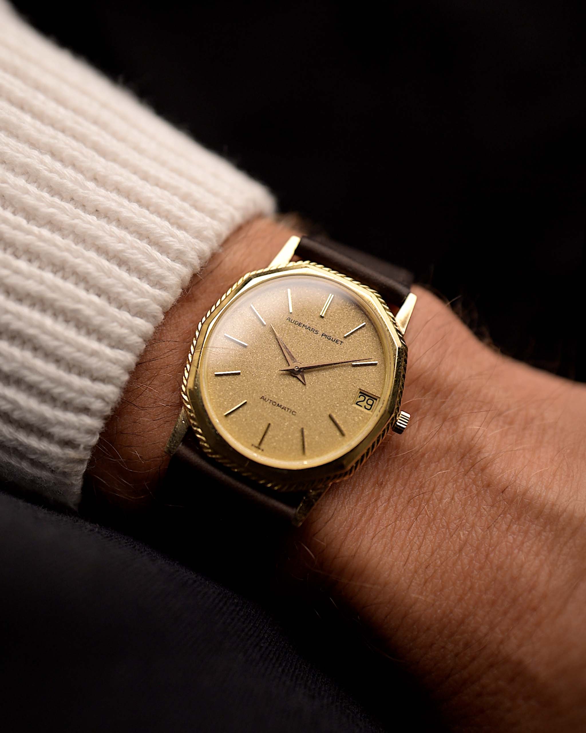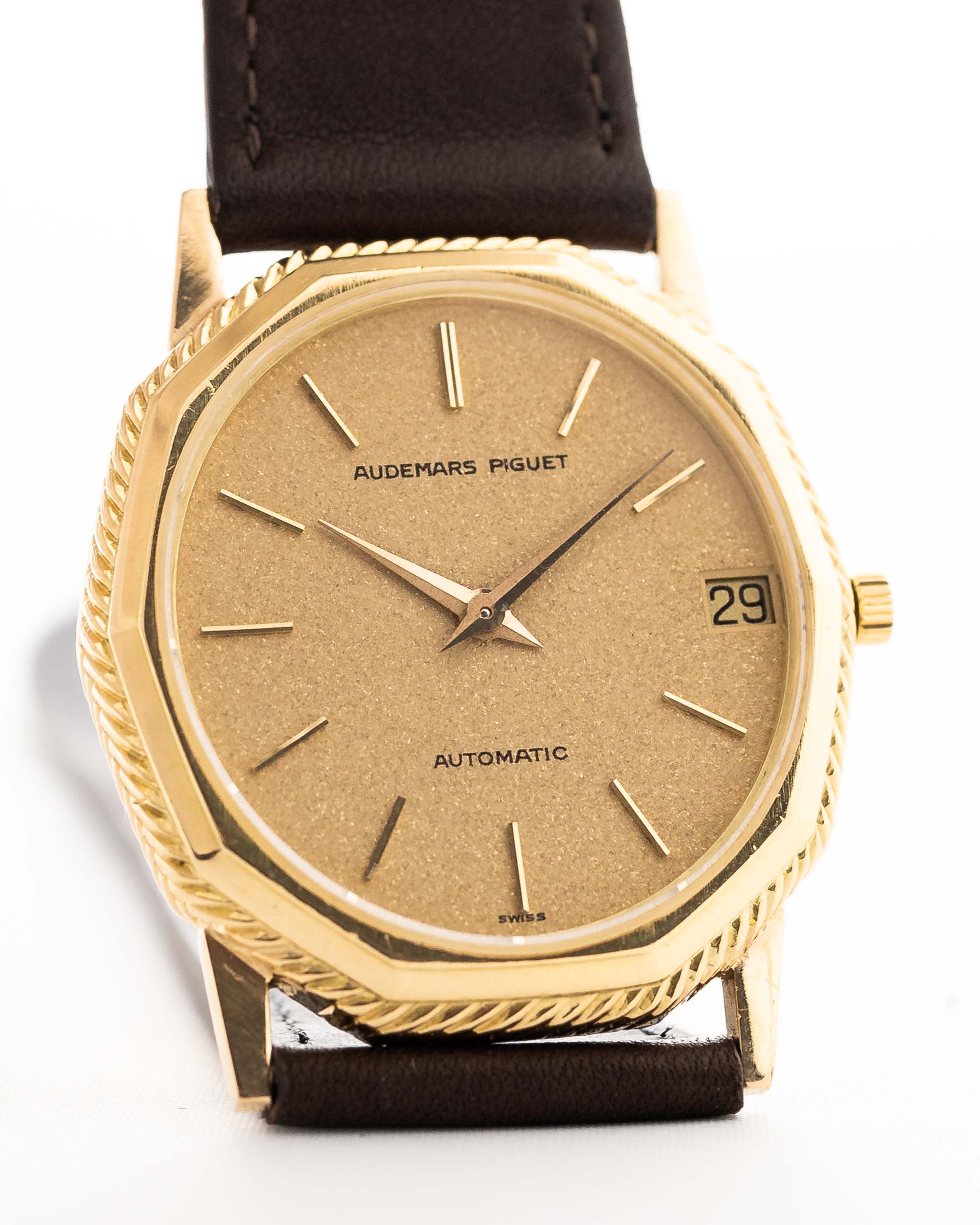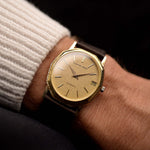 Hier haben wir eine wunderschön gearbeitete Audemars Piguet Damenuhr aus den 1970er Jahren mit einem erstaunlich goldfarbenen, ovalen Zifferblatt. Dieses besondere Stück zeichnet sich durch sein schönes gestuftes Gehäuse aus 18k Gelbgold in fantastischem Zustand aus.