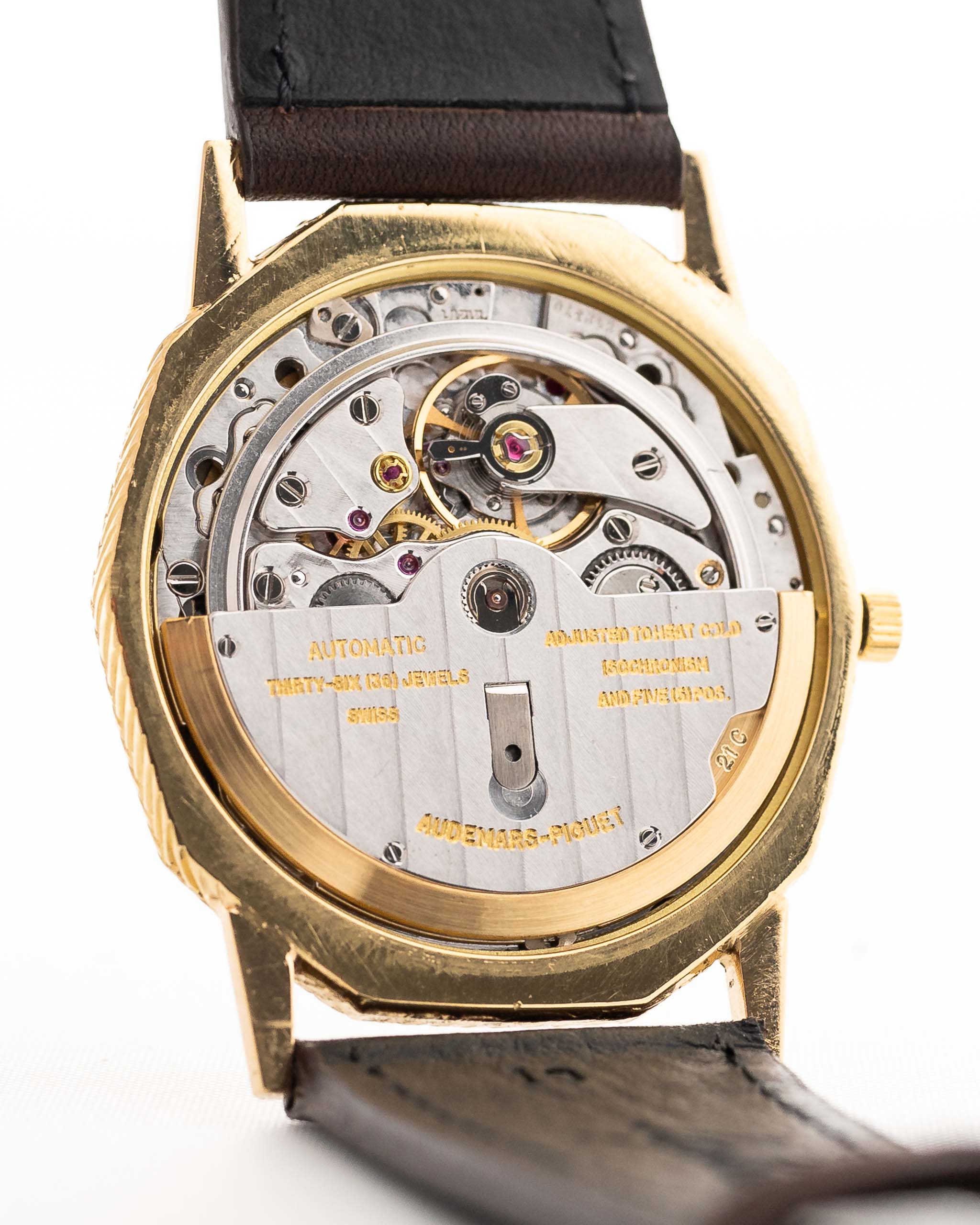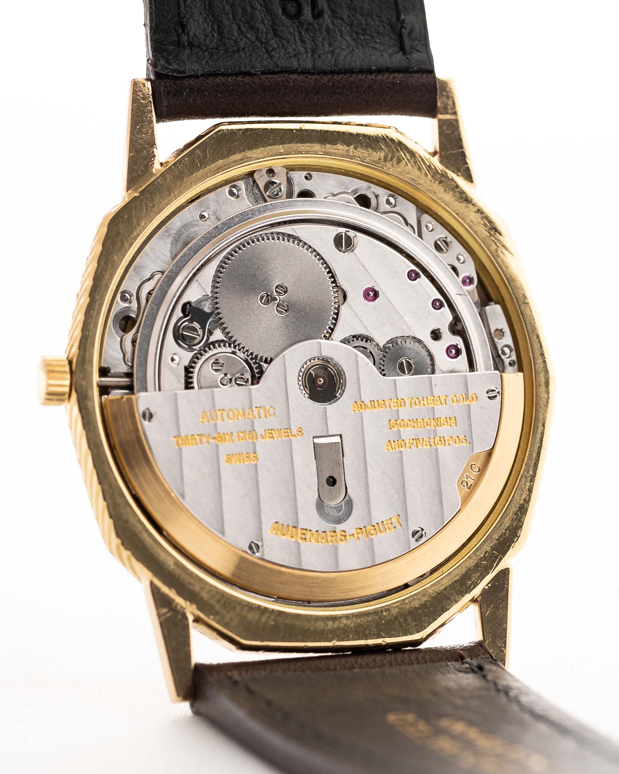 Im Inneren finden wir das ultraflache Kaliber 2121/1, das AP seit 1967 von Jaeger LeCoultre bezieht und seit vielen Jahren in seinen ultraflachen Dresswatches verwendet.