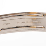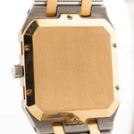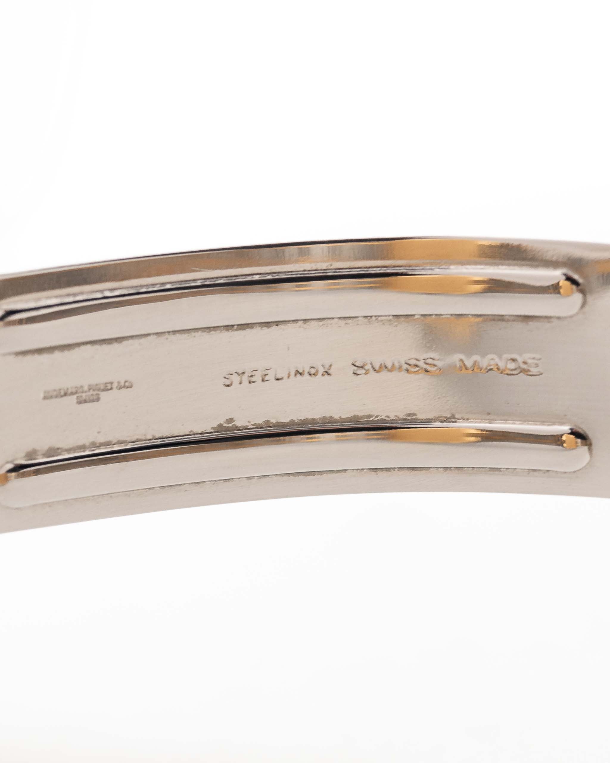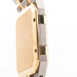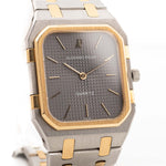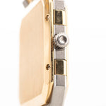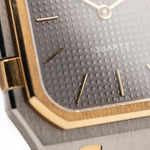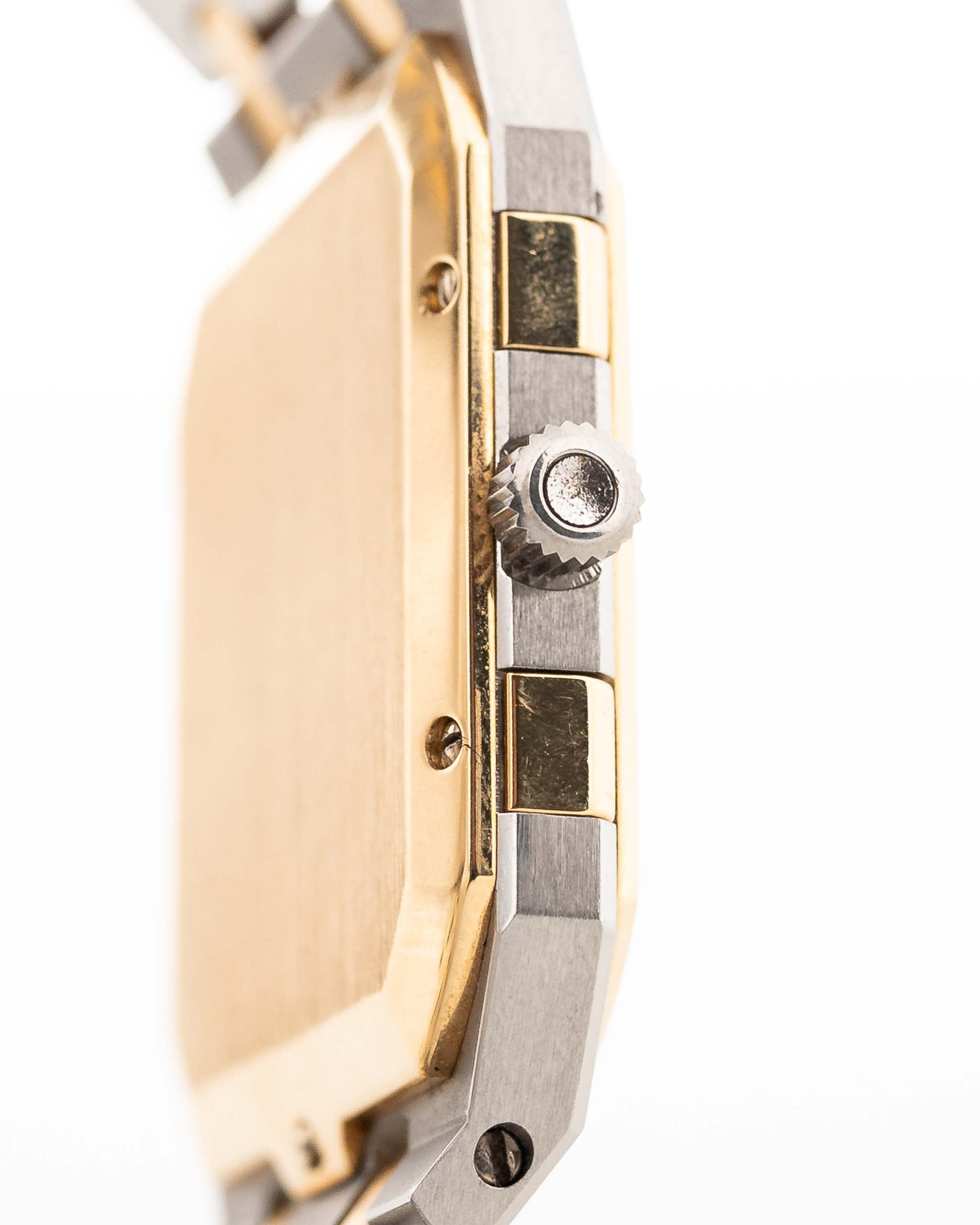 Unsere Referenz 6005 SA besitzt ein 32 mm großes, zweifarbiges Stahlgehäuse mit Saphirglas, eine unsignierte Drückerkrone, eine goldene Lünette und ein graues Tapisserie-Zifferblatt mit einem gelbgoldenen Stabzeiger und Stundenmarkierungen.