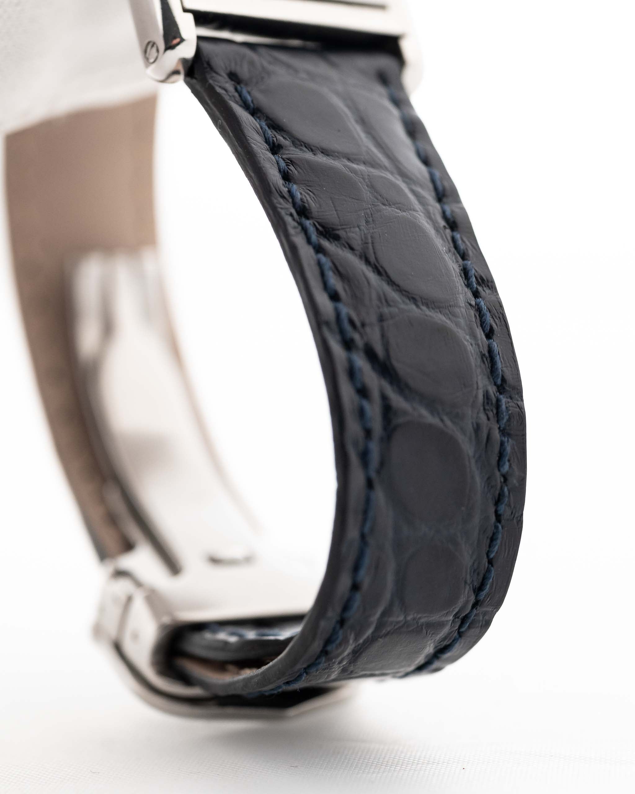 The stainless steel case is slim, balanced, and unmistakably Cartier. Its white dial with blued sword hands and minimalist design speaks to refined taste, while the original blue Cartier leather strap and deployant clasp complete the signature look.