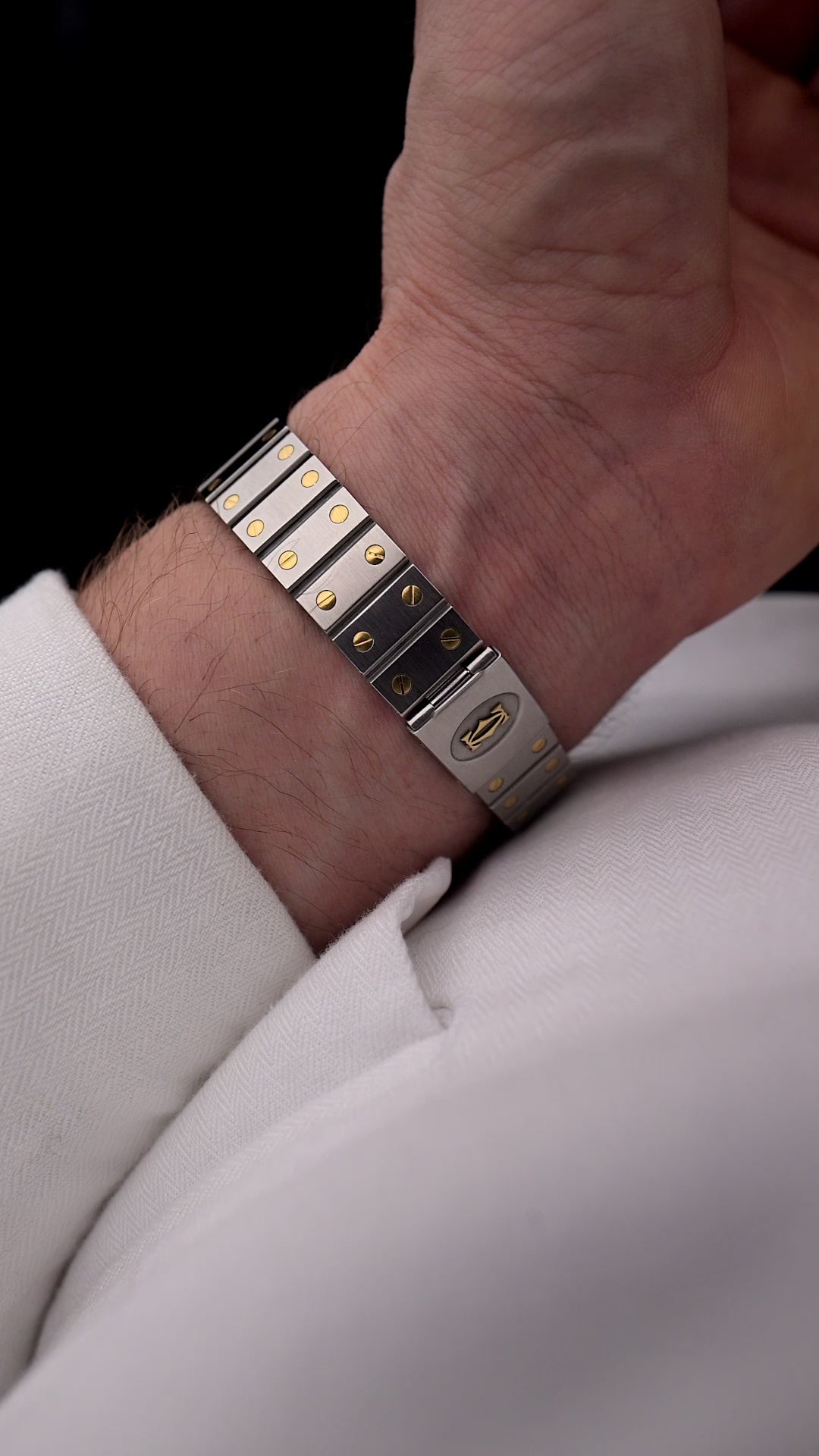 Diese zweifarbige Cartier Santos Vendome Ronde aus Edelstahl besticht durch ihr weißes Zifferblatt mit römischen Ziffern, die gebläuten Stahlzeiger und natürlich die Akzente aus 18 Karat Gold.