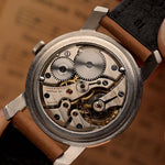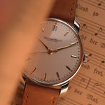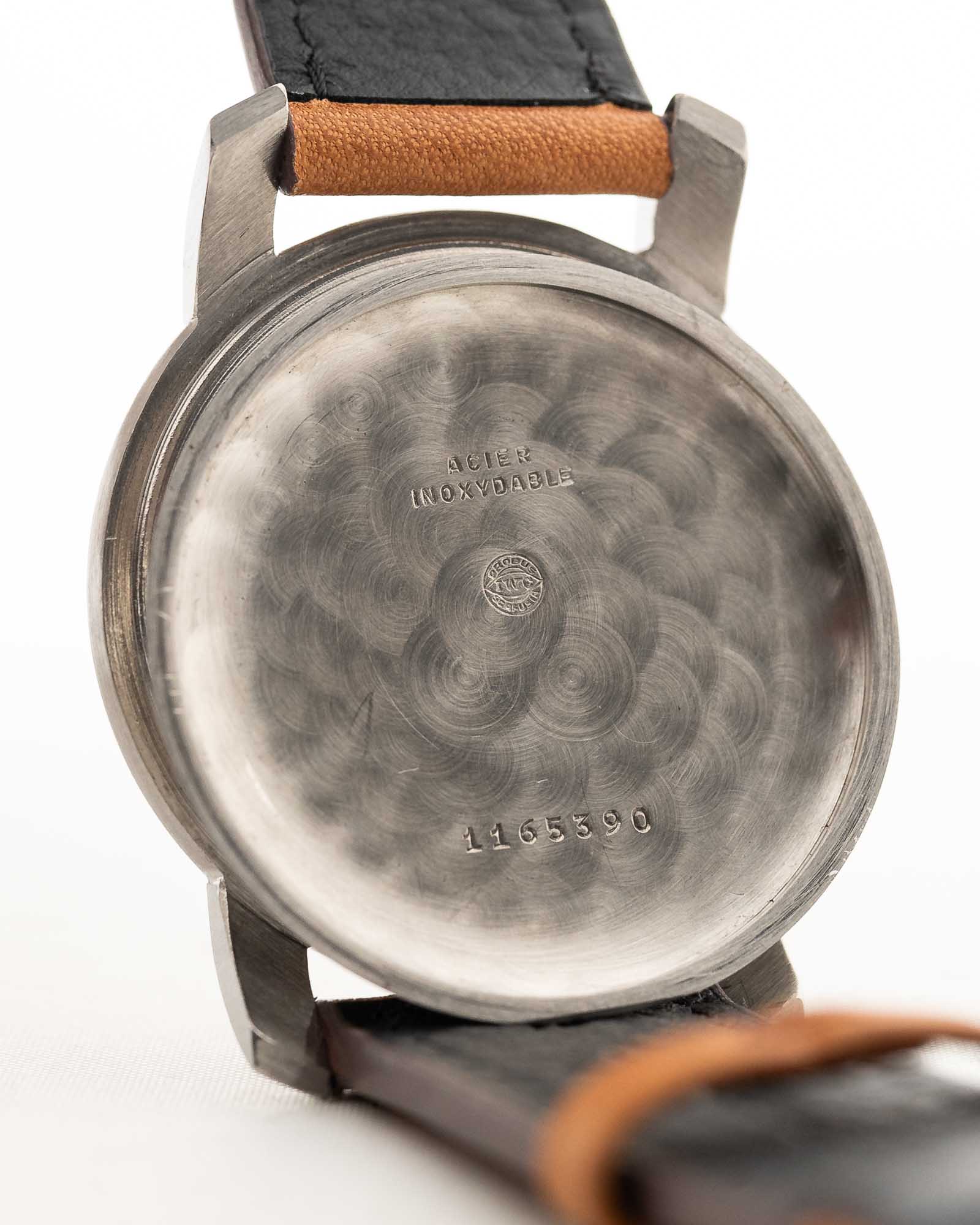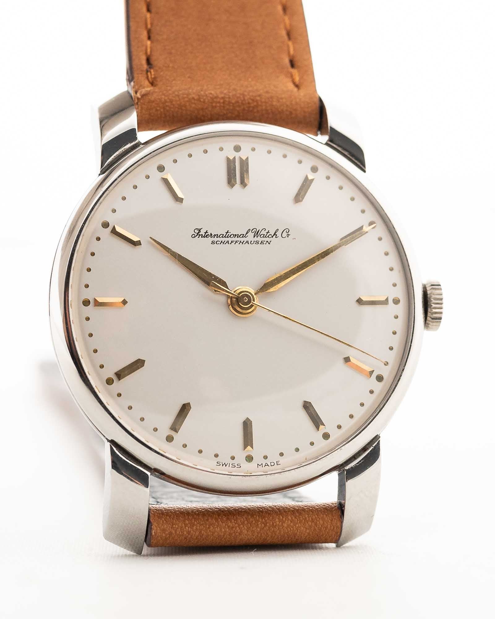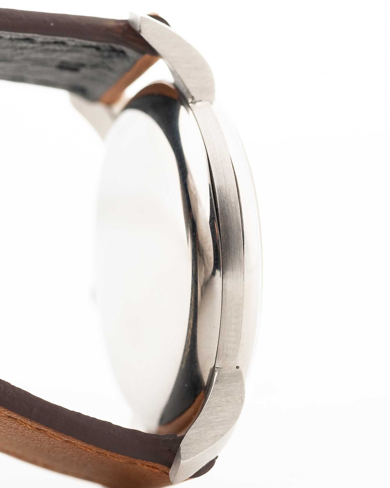 Eine klassische IWC-Anzugsuhr aus dem Jahr 1948, die die frühe Meisterschaft der Marke in Sachen zurückhaltendem Design und mechanischer Zuverlässigkeit demonstriert. Die aus Edelstahl gefertigte Uhr besticht durch ihre dicken, nach unten gebogenen Bandanstöße, die ihr eine starke Präsenz am Handgelenk verleihen, sodass sie größer wirkt als ihr Durchmesser von 35 mm.