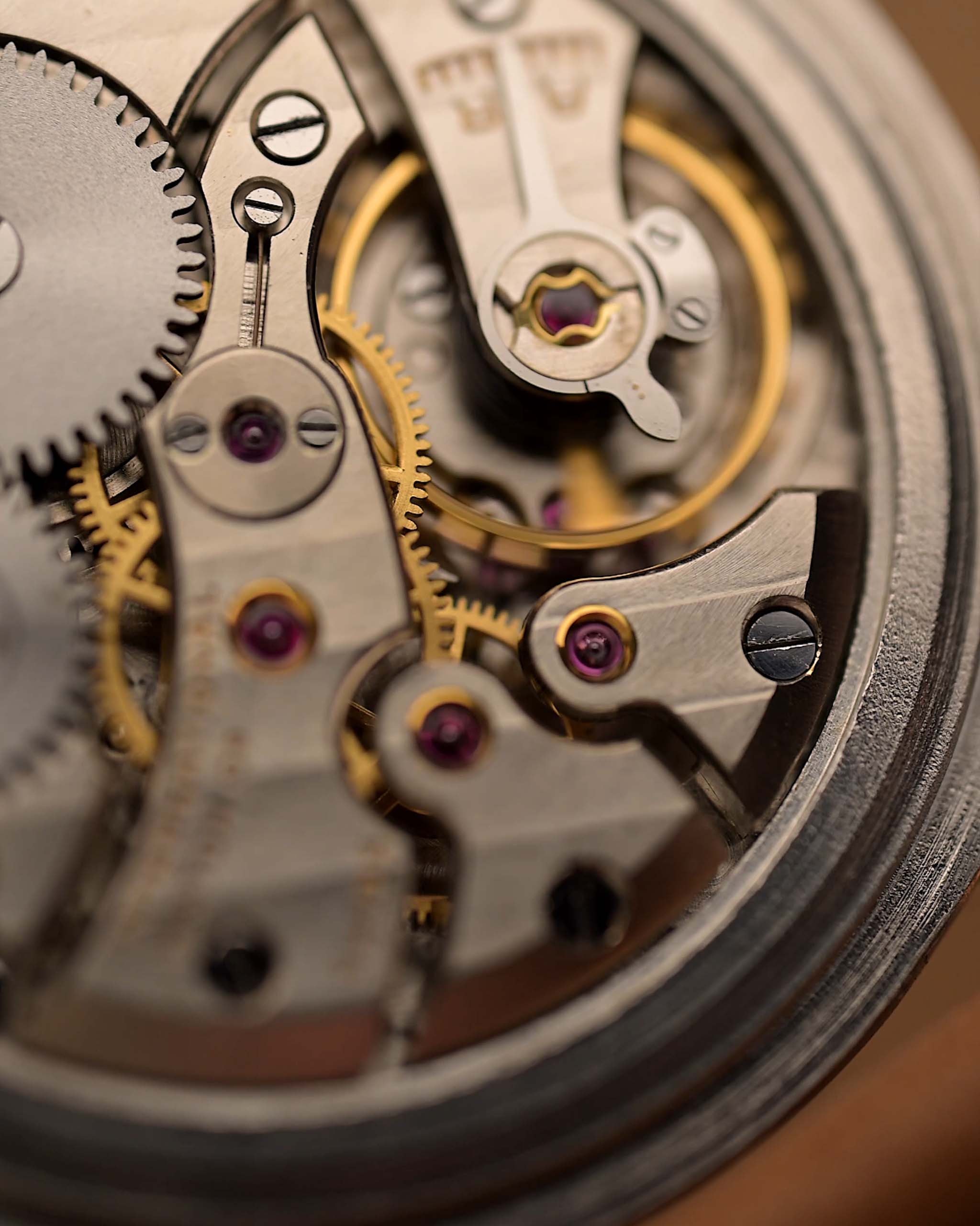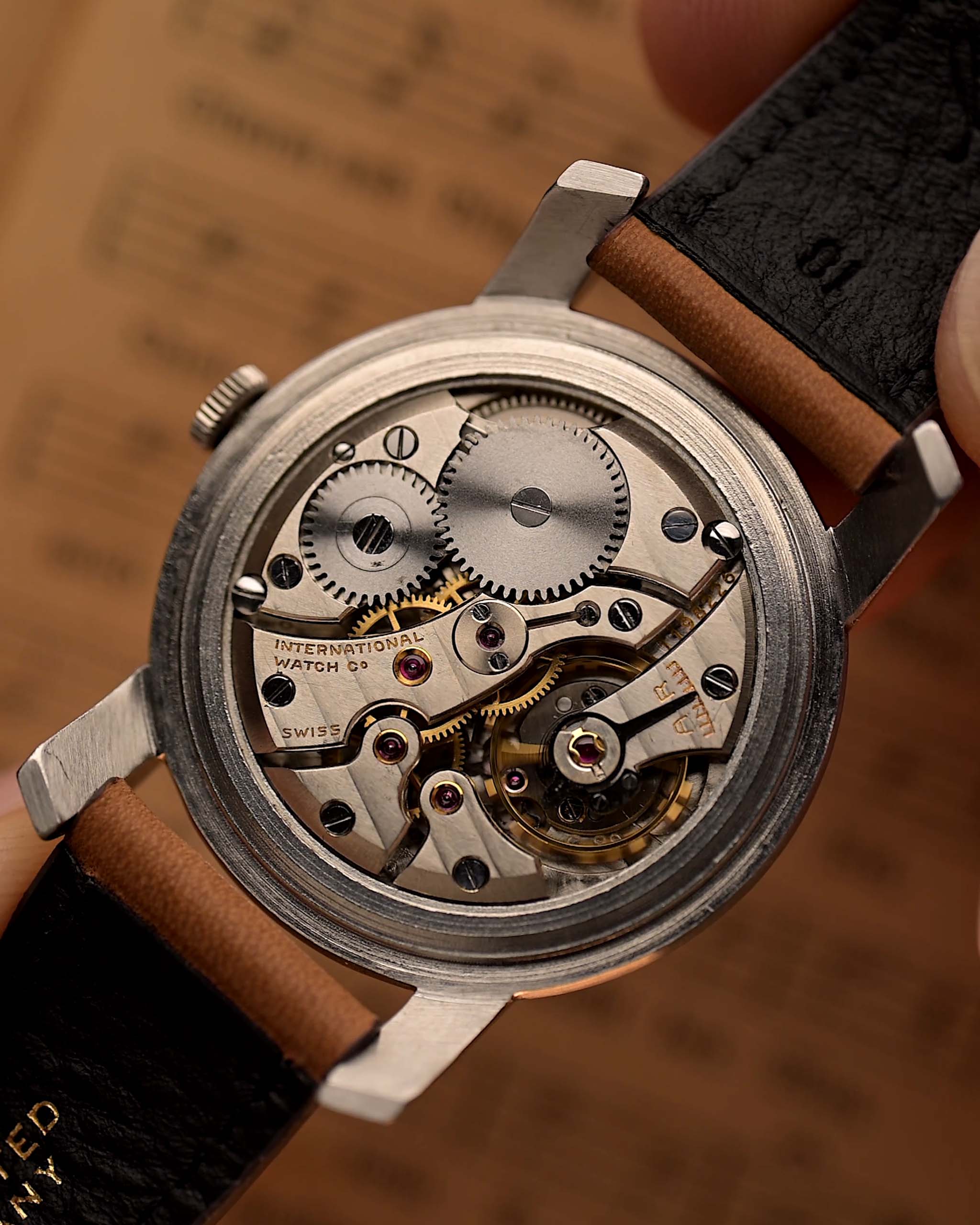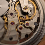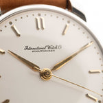 Das silberne Zifferblatt ist unverändert und wunderschön erhalten geblieben. Es wird durch goldene Zeiger und Stundenmarkierungen ergänzt, die ihm Wärme und zeitlose Eleganz verleihen. Im Inneren schlägt das legendäre IWC-Kaliber 89, ein Handaufzugswerk, das für seine Langlebigkeit und Präzision bekannt ist.