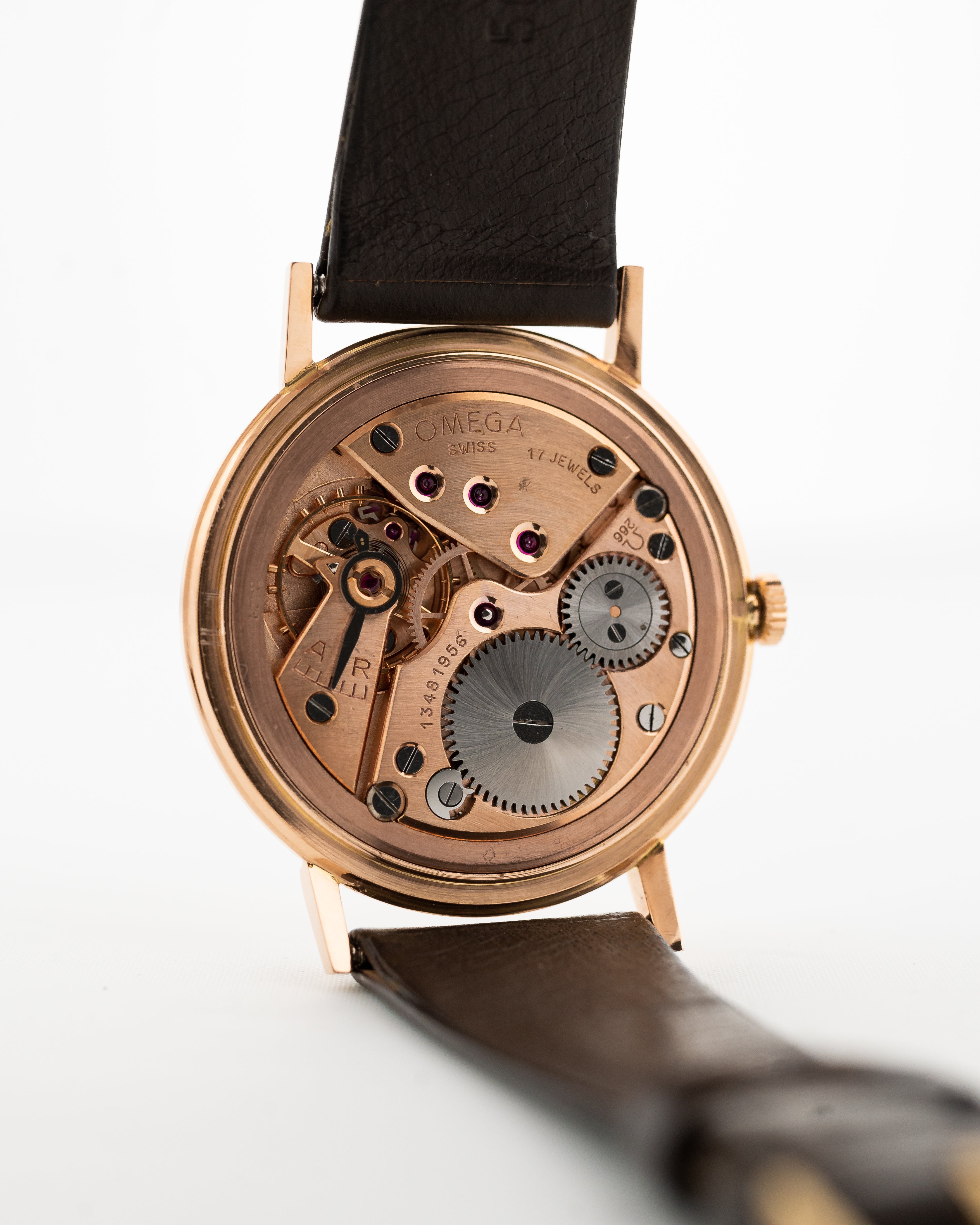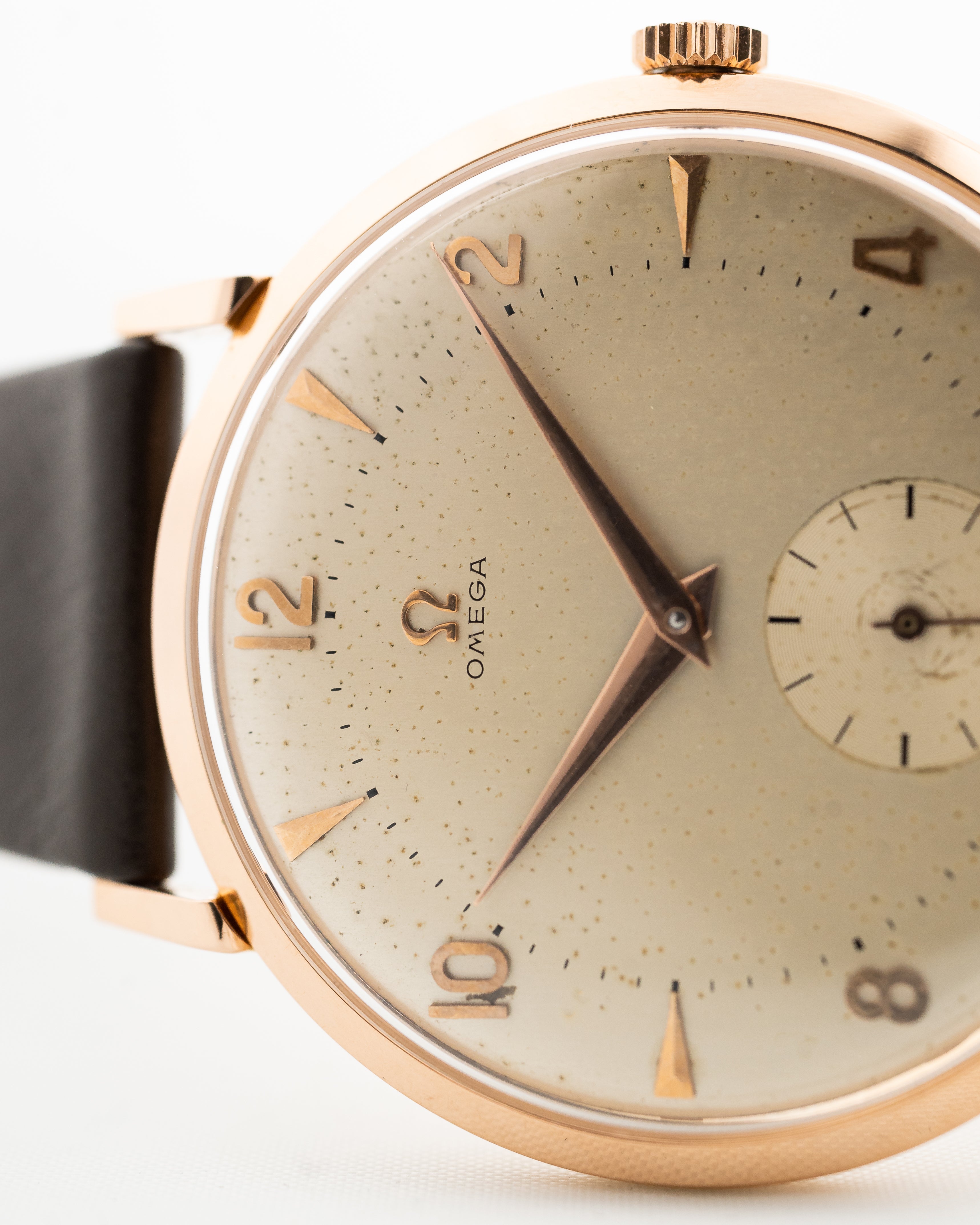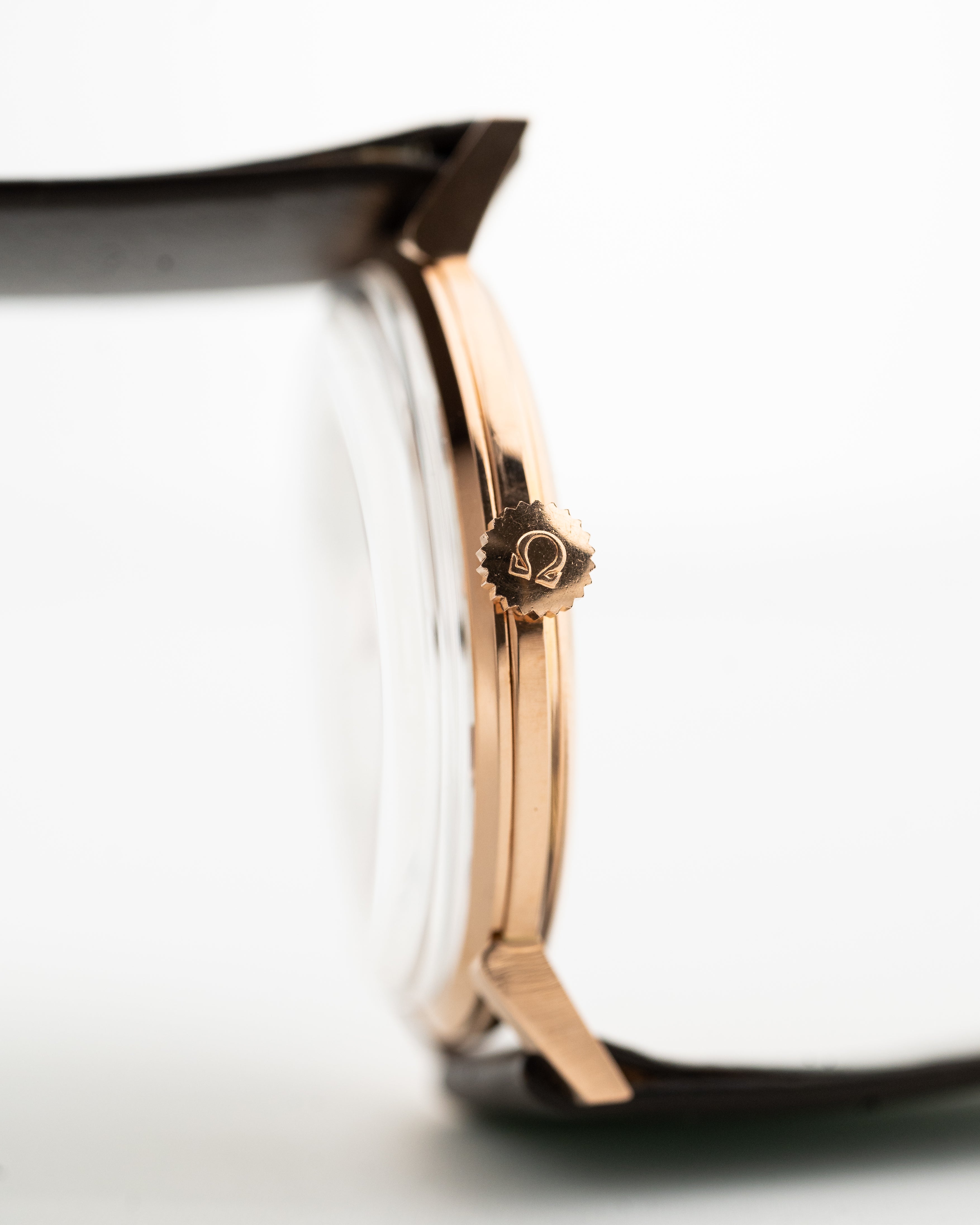 Dieses besondere Exemplar zeichnet sich durch sein rundum schönes Aussehen und sein übergroßes Roségoldgehäuse aus. Es ist das erste Mal, dass wir eine Omega mit einem 39 mm Gehäuse finden konnten.