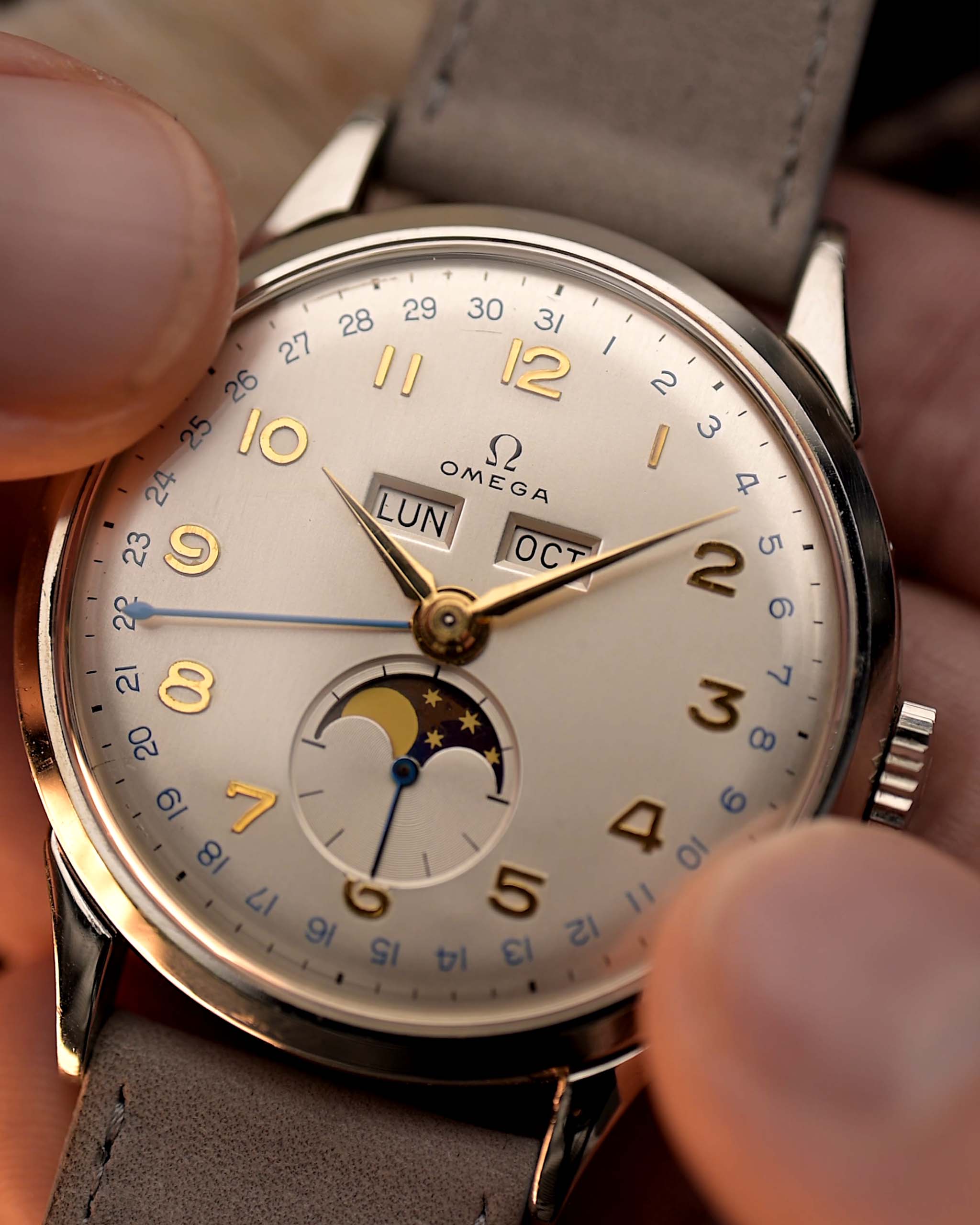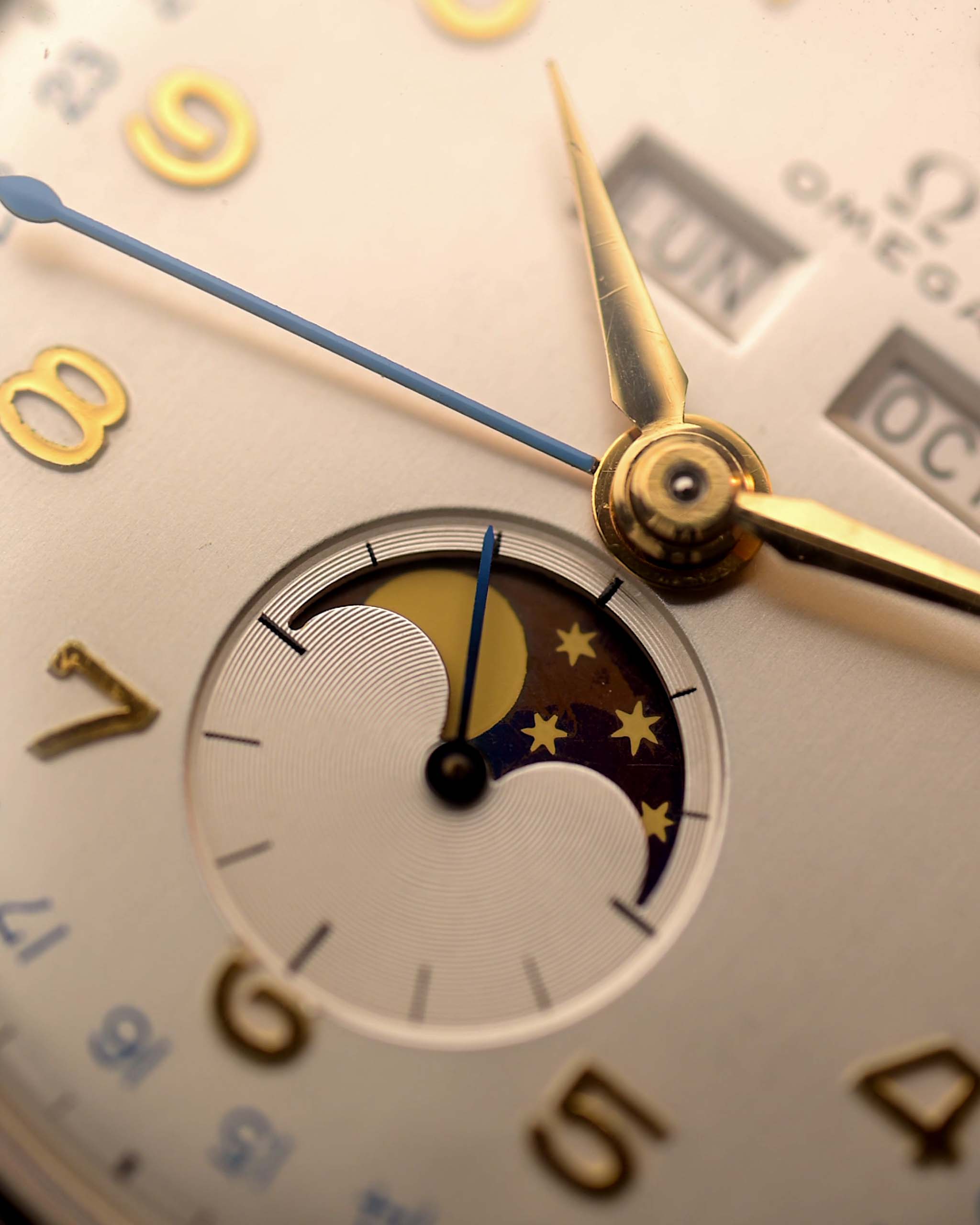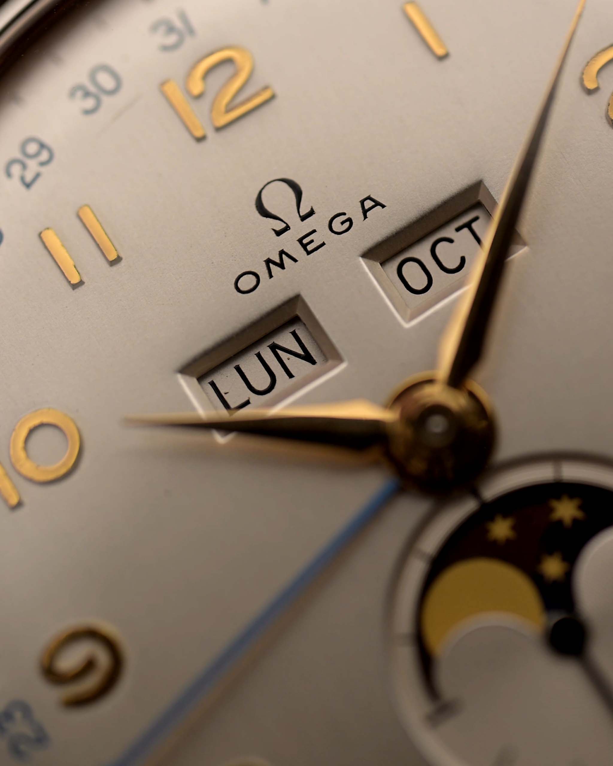 Das elegante Zifferblatt verfügt über Tages- und Monatsfenster im oberen Bereich (französische Sprachräder), eine Mondphase innerhalb der Sekunde bei sechs Uhr und einen leuchtend blauen Datumsring, der das Design umgibt. In Kombination mit goldenen Zeigern, einem blauen Datumszeiger und der warmen Patina der Zeit verfügt dieses Stück über ein unbestreitbares Charisma.