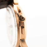 Unsere besondere Uhr kommt in einem 37,5 mm großen Jumbo-Gehäuse aus Roségold mit klarem Gehäuse und schönen, einzigartig gestalteten Bandanstößen. Akzente wie die fantastischen Zeiger aus Roségold und die Dolchindexe vervollständigen den edlen Look dieser Uhr.