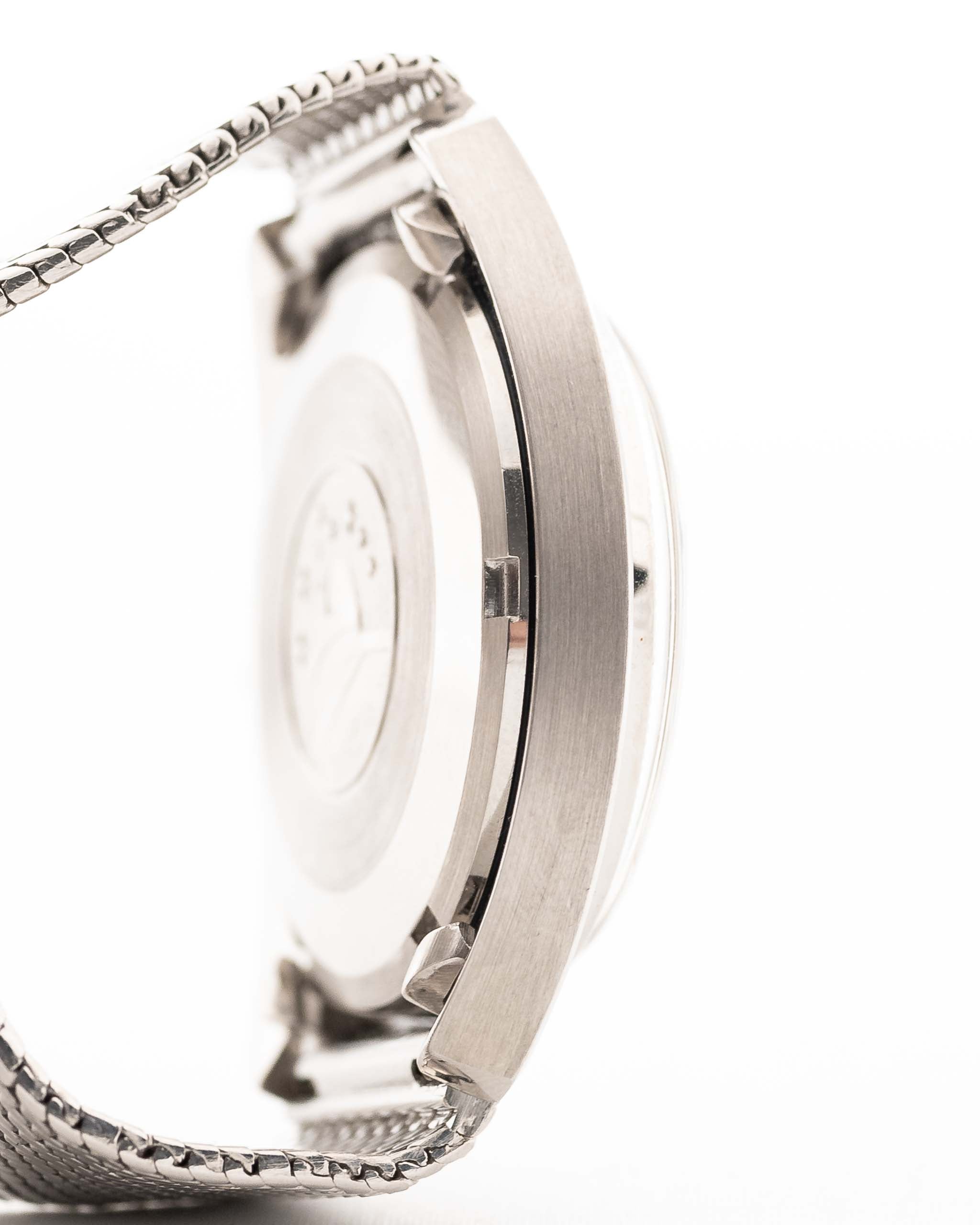 The Omega Constellation has always stood as a symbol of precision and prestige — and this rare Ref. 168.019 in 18k white gold takes that legacy to a whole new level. Introduced during the golden age of dress watches, this 1968 piece showcases the bold C-shape case design Omega adopted in the late ‘60s, paired with a stunning silver linen dial and an ultra-elegant 18k white gold Milanese bracelet.