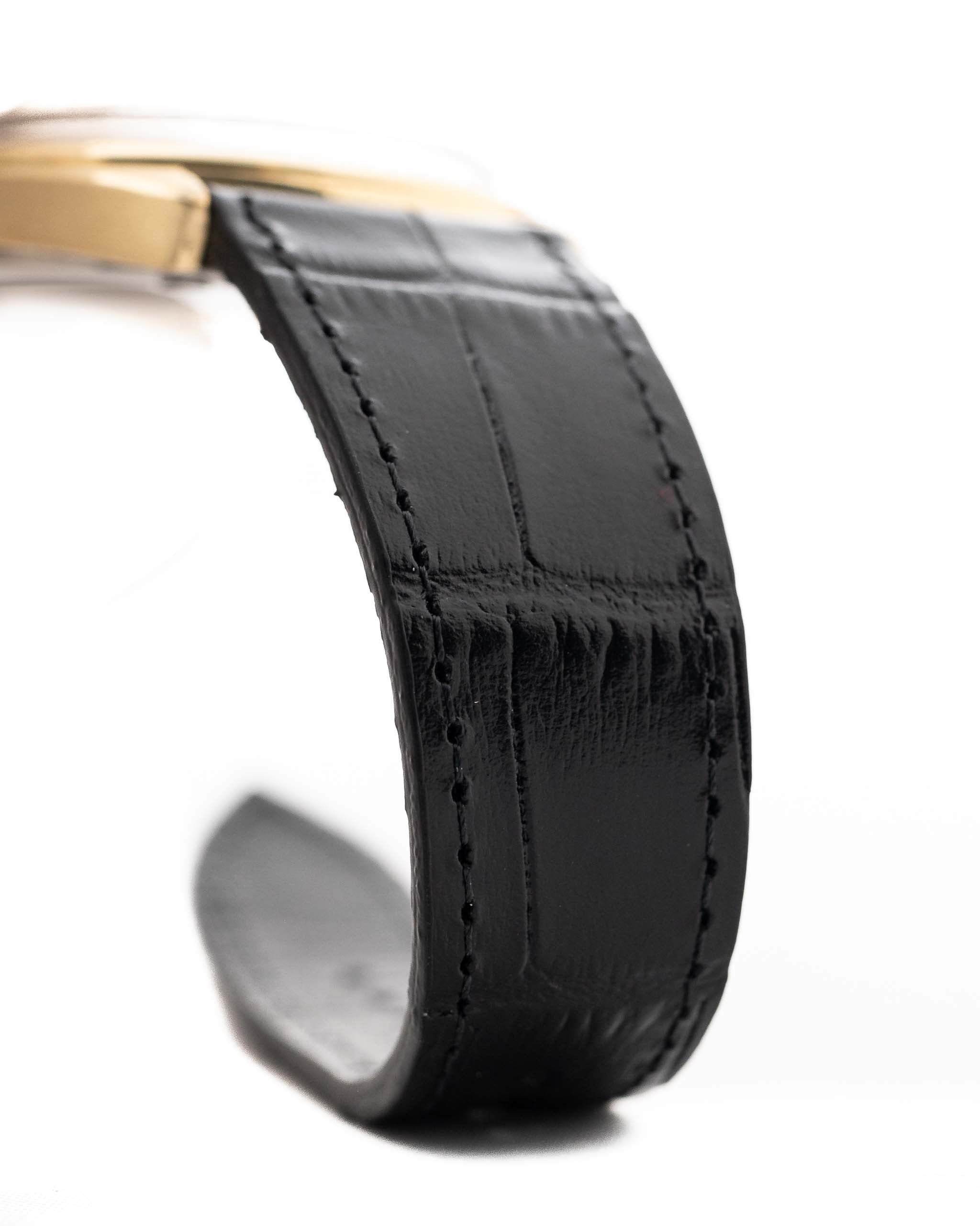 Housed in a 35 mm yellow gold-plated case, this Constellation features a clean day-date display, elegant stick hour markers, and a perfectly balanced dial layout. Paired with a glossy black alligator-embossed strap, this piece feels right at home whether you're at a formal dinner or enjoying a weekend espresso.