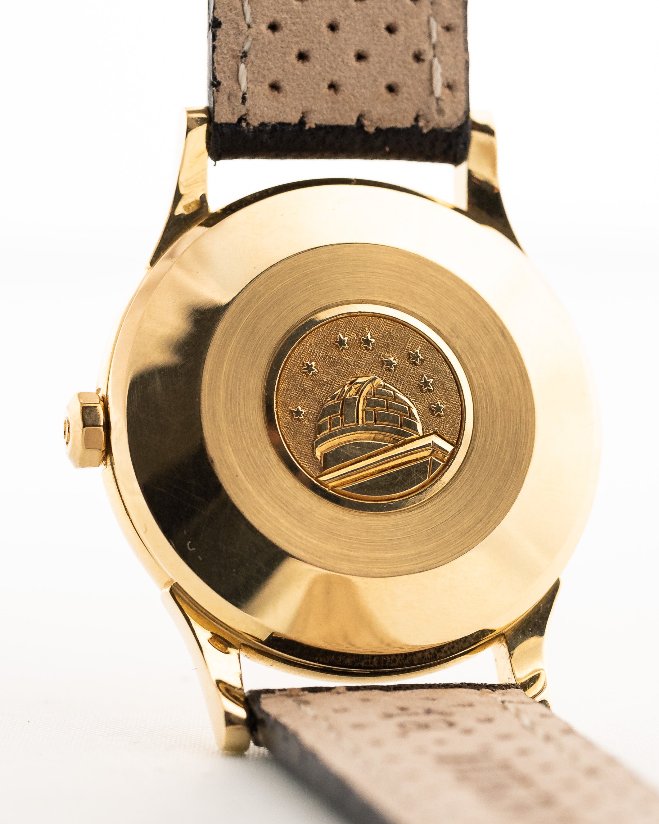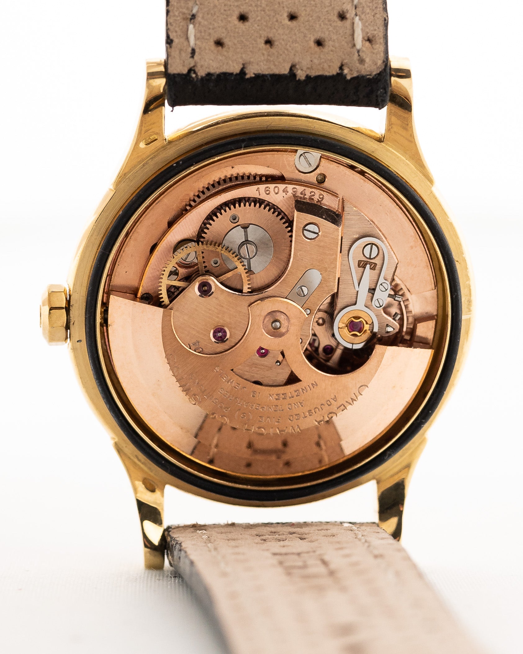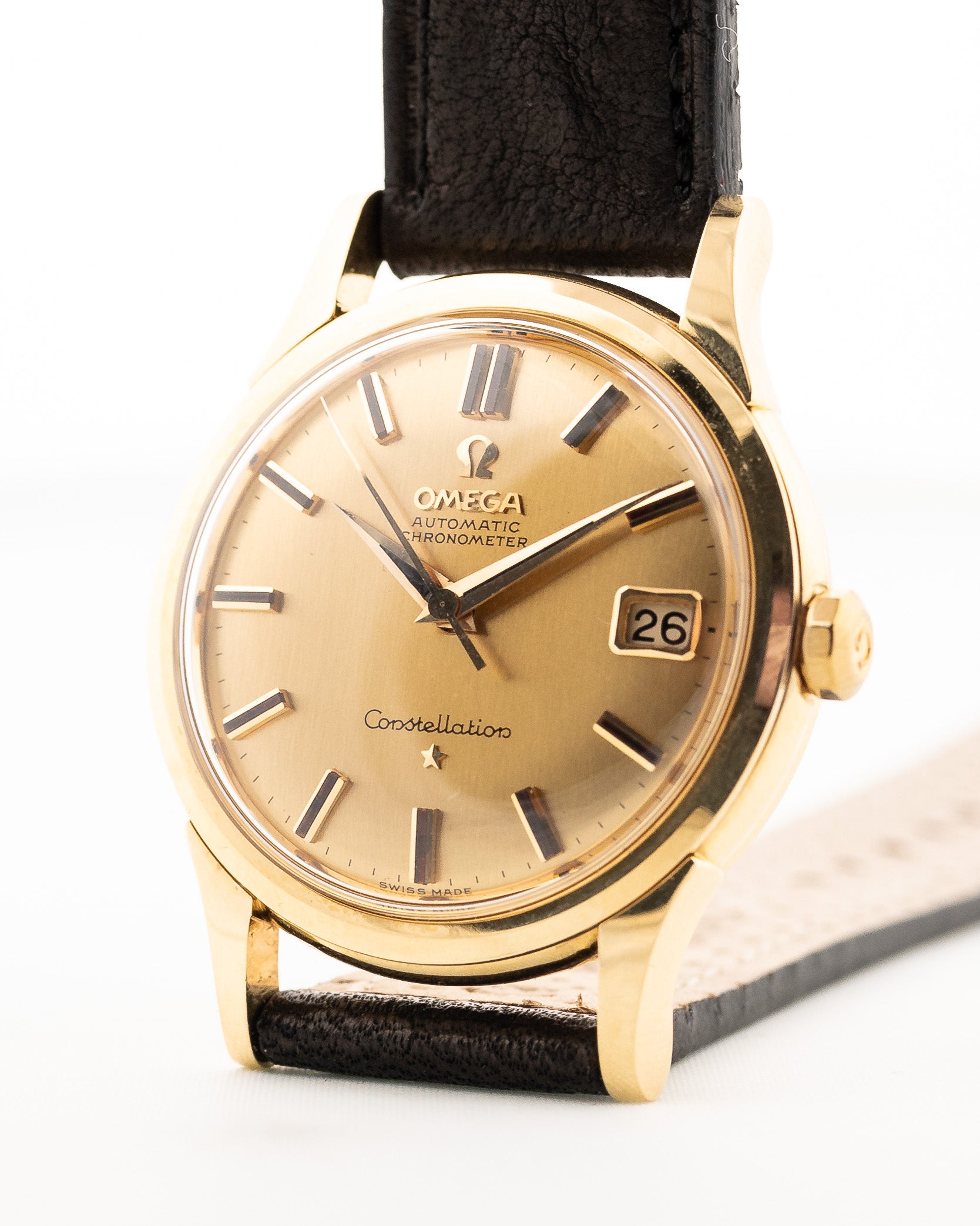 Diese gut proportionierte, schlichte und klassische Constellation verfügt über einen verschraubten Gehäuseboden, das Omega Automatik-Chronometer Kaliber 504 und großartige, leicht nach unten gedrehte Anstöße.