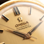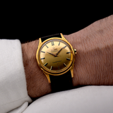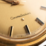 Dieser kompakte und schöne Omega Constellation Automatik-Chronometer hat alles, was Sie sich von einer Damenuhr wünschen: Ein 34 mm großes Gehäuse aus 18 Karat Gelbgold, eine Zentralsekunde, ein wunderschönes Zifferblatt aus Gelbgold und die seltenen schlanken Stabindexe mit Onyxeinlage. Die Constellation wurde erstmals 1952 vorgestellt und war Omegas Antwort auf die Rolex Datejust.