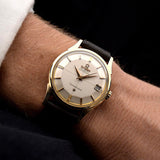 Dieser kompakte und schöne Omega Constellation Automatik-Chronometer hat alles, was Sie sich von einer Damenuhr wünschen: Ein 34 mm großes Gehäuse aus 14 Karat Gelbgold, eine Zentralsekunde, ein sauberes silbernes Zifferblatt und schlanke Stabindexe. Die Constellation wurde erstmals 1952 vorgestellt und war Omegas Antwort auf die Rolex Datejust. Die Tatsache, dass sie aus 14-karätigem statt aus 18-karätigem Gelbgold gefertigt ist, deutet darauf hin, dass sie damals für den US-Markt produziert wurde.