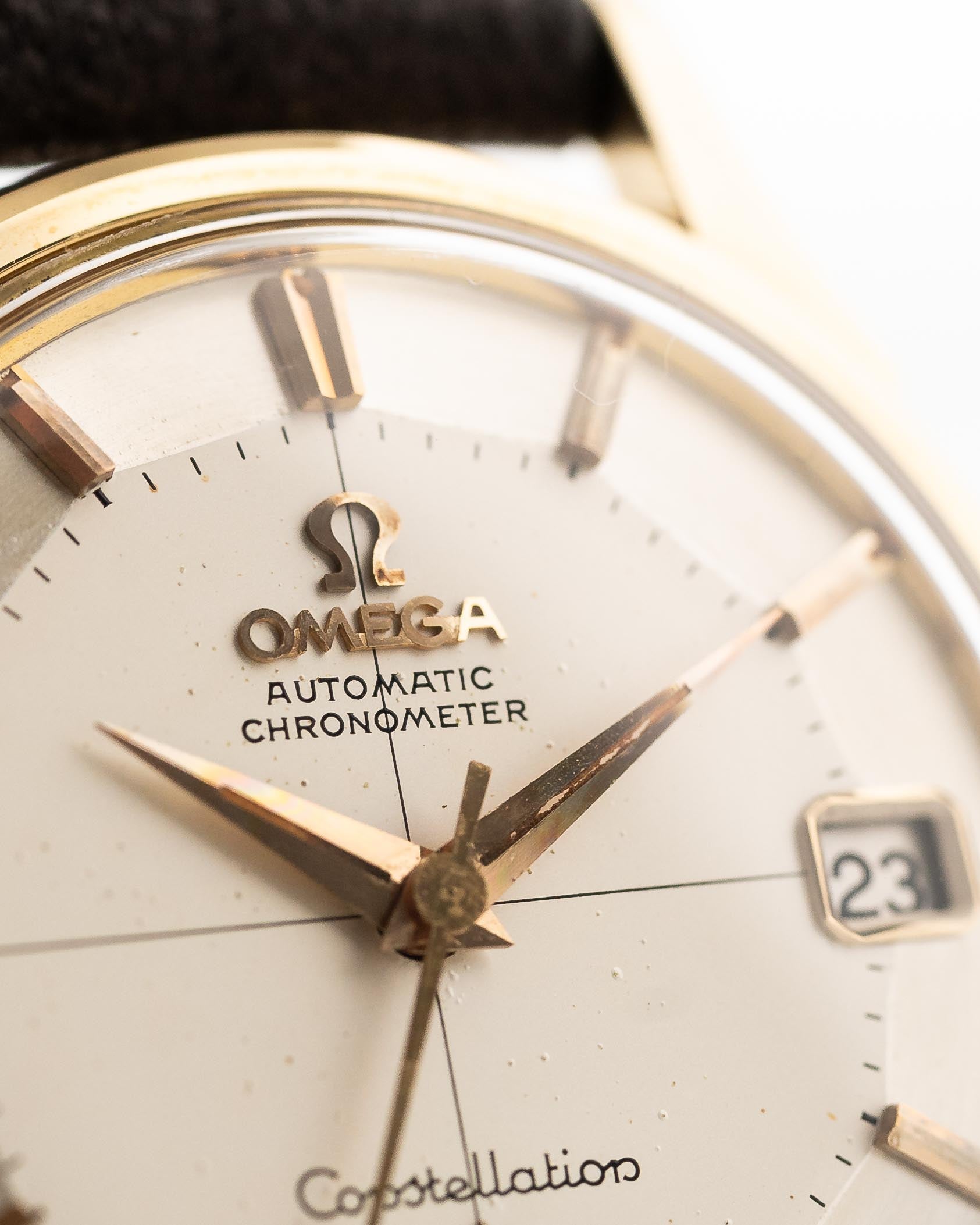 Diese gut proportionierte, schlichte und klassische Constellation verfügt über einen verschraubten Gehäuseboden, das Omega Automatik-Chronometer Kaliber 561 und großartige, leicht nach unten gedrehte Anstöße.