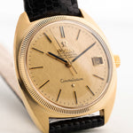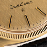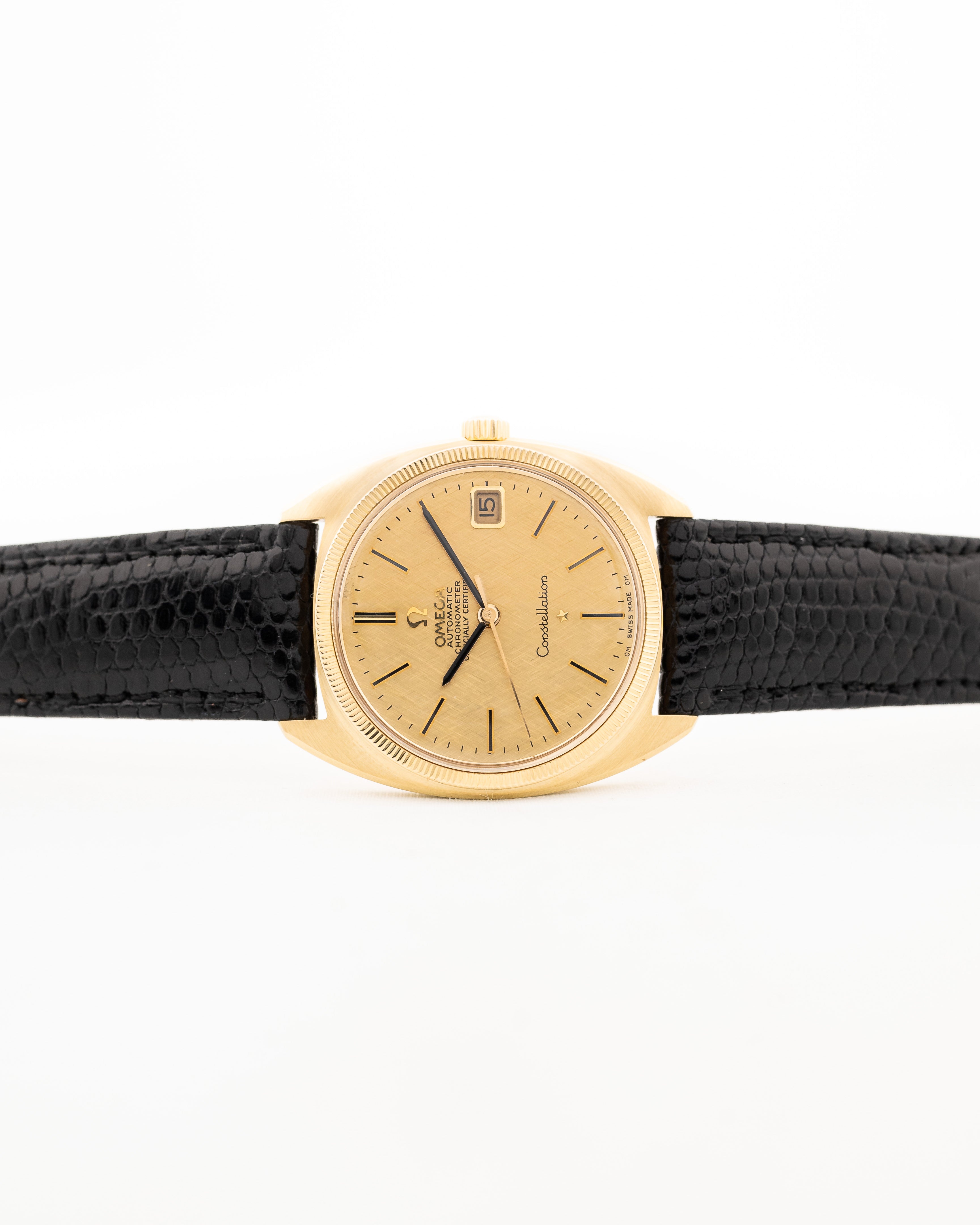 Dieser kompakte und schöne Omega Constellation Date Automatik-Chronometer hat alles, was Sie sich von einer Damenuhr wünschen: 35 mm C-Shape-Gehäuse aus 18 Karat Gelbgold, Zentralsekunde, ein sehr schönes goldfarbenes Zifferblatt mit Leinenstruktur und seltenen schwarzen Stabindexen und Zeigern. Die Constellation kam 1952 auf den Markt und war die Antwort von Omega auf die Rolex Datejust.