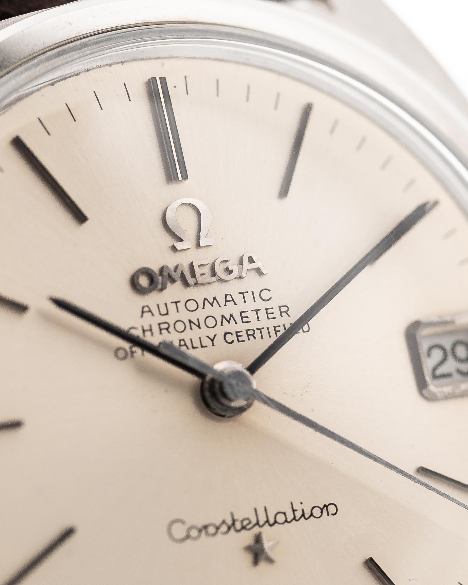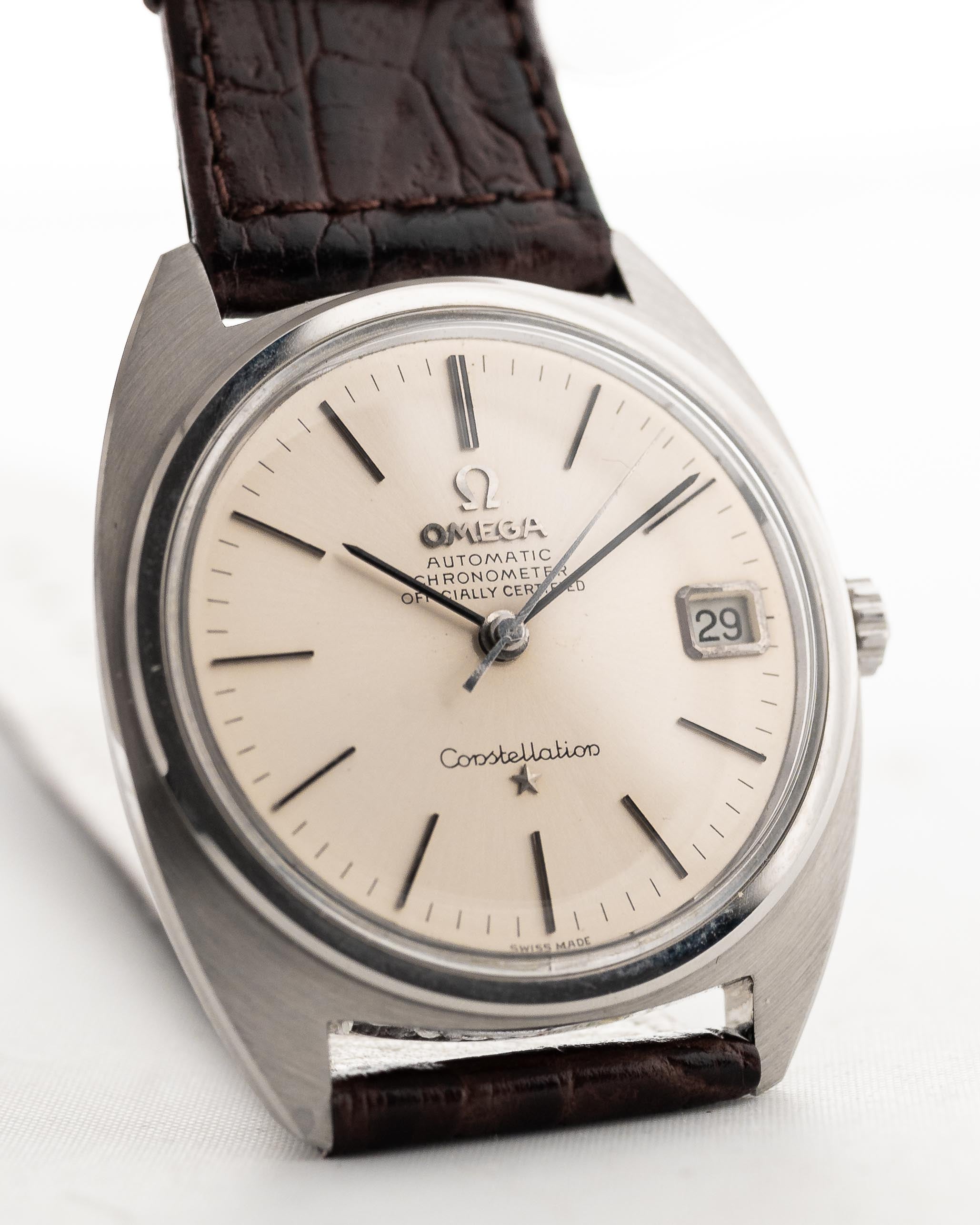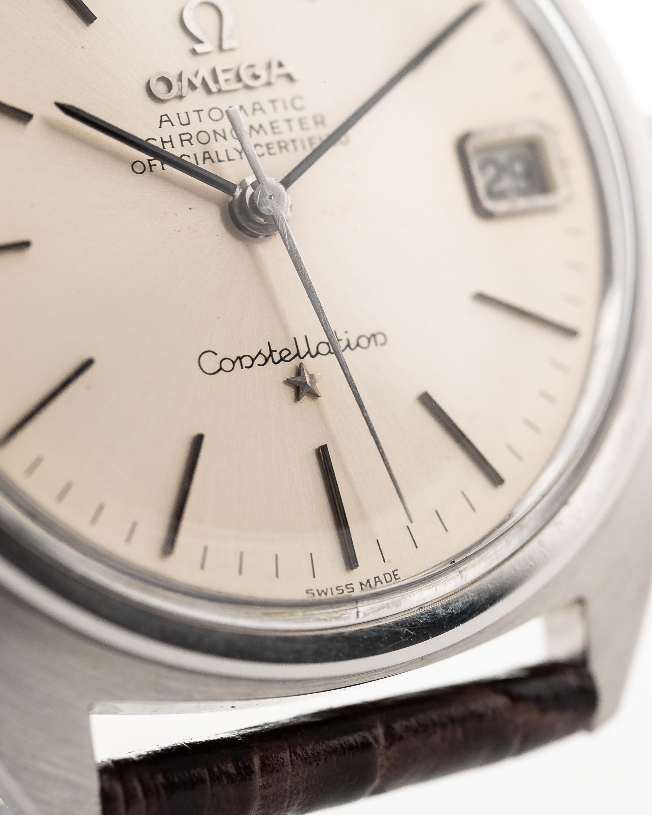 Dieser kompakte und schöne Omega Constellation Date Automatik-Chronometer hat alles, was Sie von einer Uhr für den täglichen Gebrauch erwarten: 34 mm Edelstahlgehäuse in C-Form, Zentralsekunde, ein wunderschönes champagnerfarbenes Zifferblatt mit Sonnenschliff und seltene schwarze Stabindexe und Zeiger. Die Constellation wurde erstmals 1952 vorgestellt und war Omegas Antwort auf die Rolex Datejust.