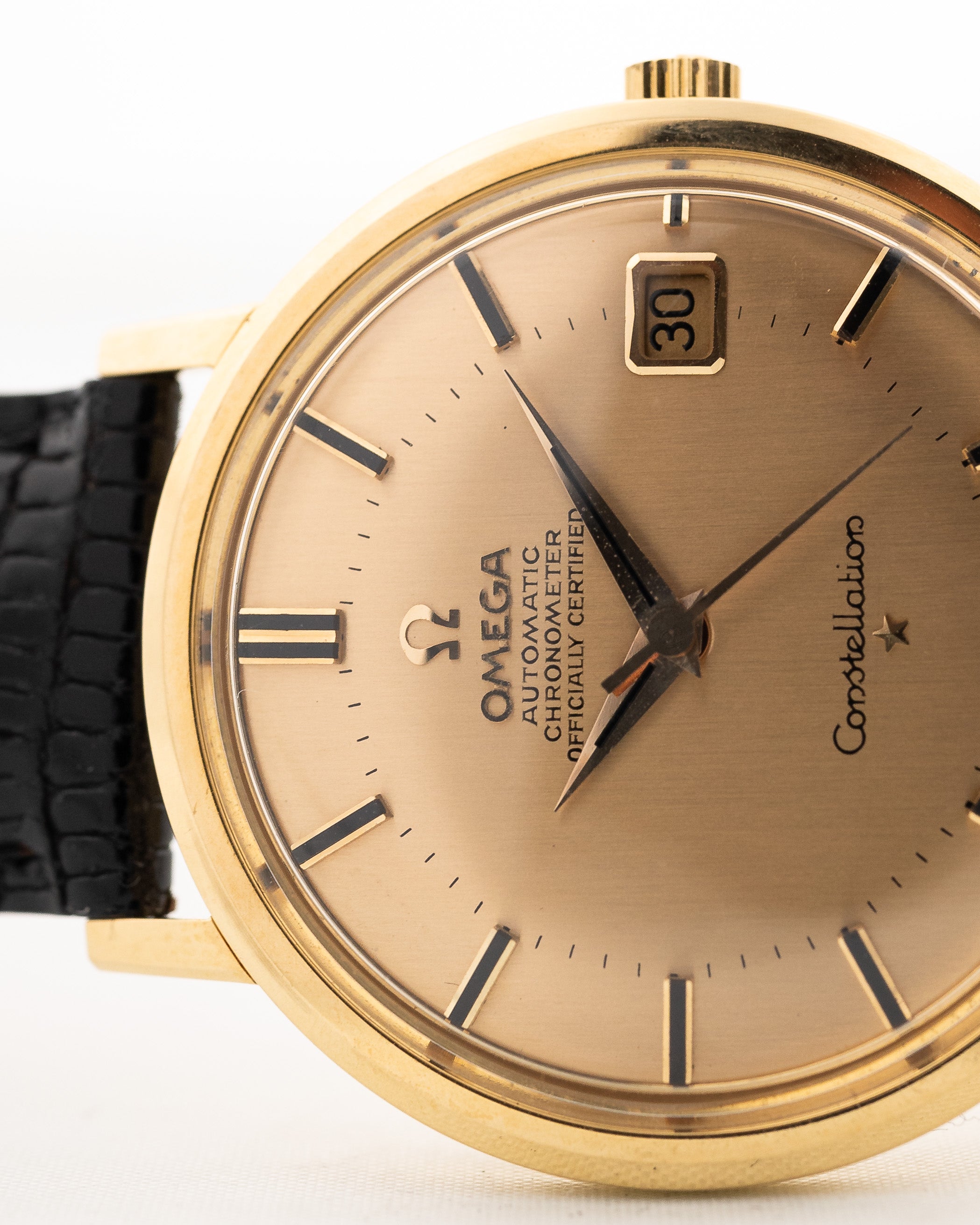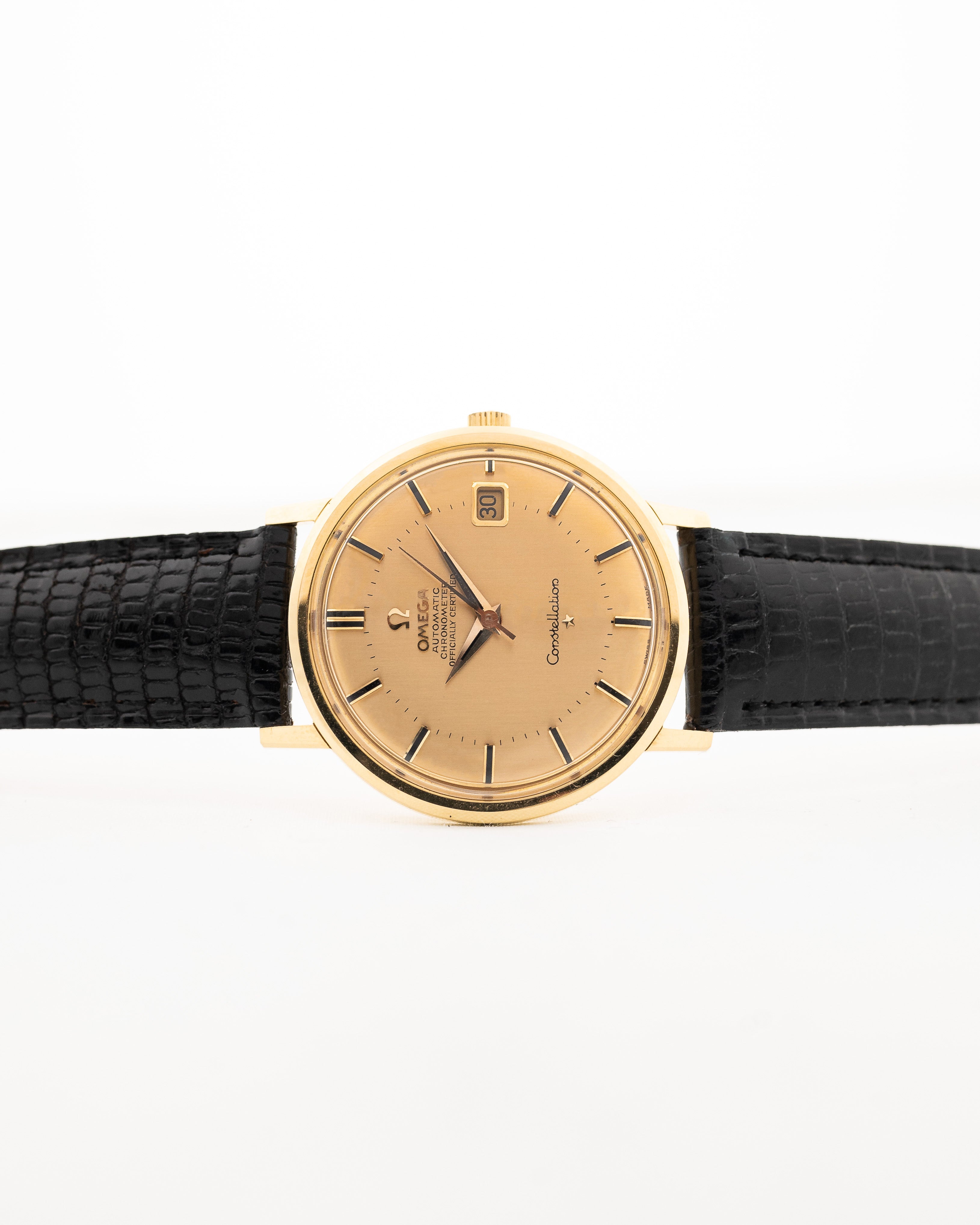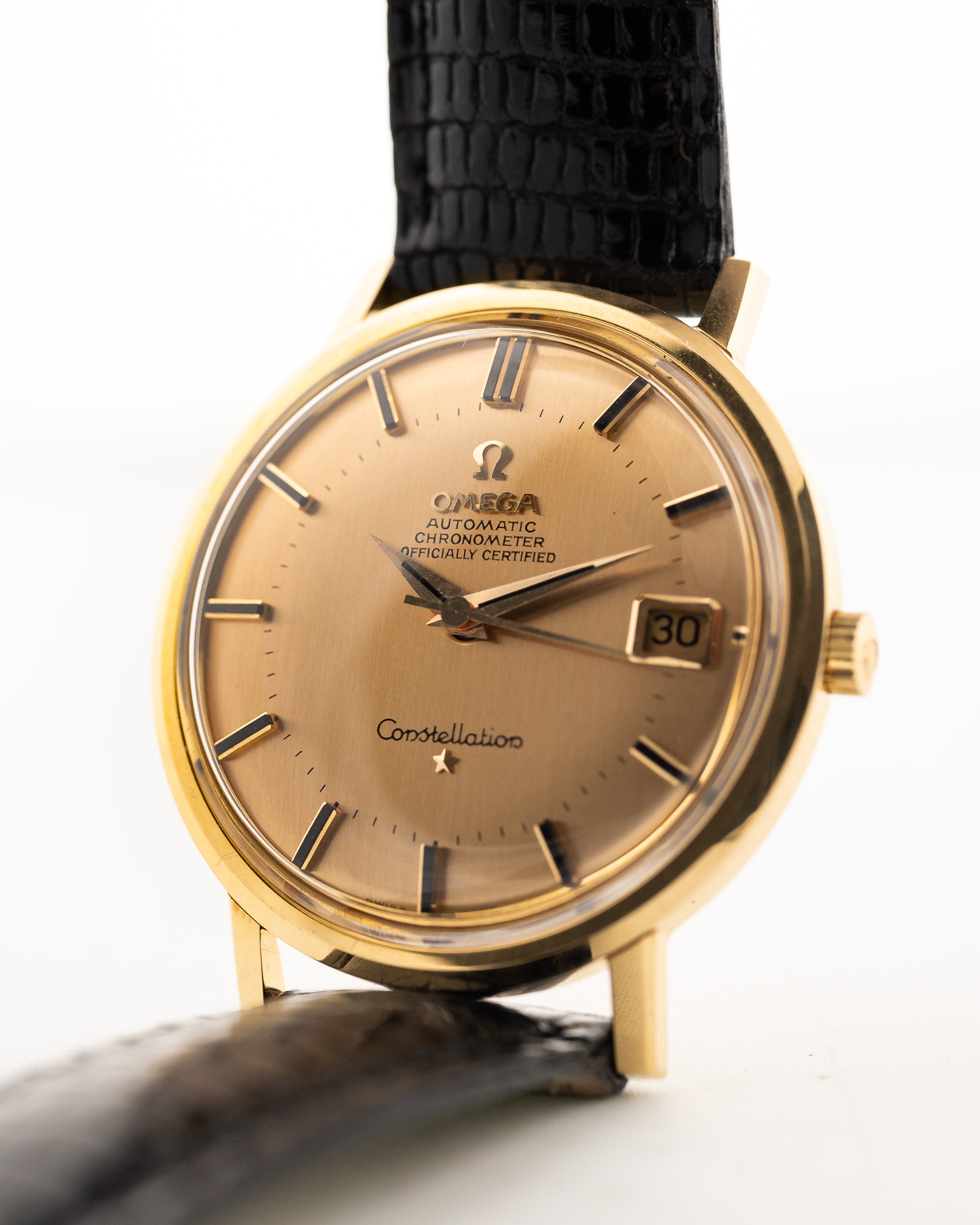 Diese gut proportionierte, schlichte und klassische Constellation verfügt über einen verschraubten Gehäuseboden, das Omega Automatik-Chronometer Kaliber 564 und großartige, leicht nach unten gedrehte Anstöße.