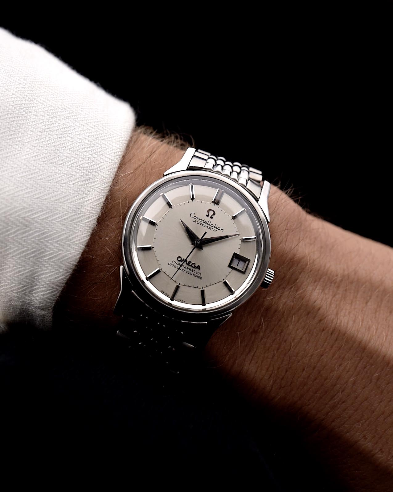 Das Besondere an diesem Modell ist das vertauschte Zifferblatt mit dem Omega-Schriftzug unten und dem Constellation-Schriftzug oben. Diese Zifferblattkonfiguration wurde damals nur auf dem japanischen Markt verkauft. Mit dem seltenen Perlenarmband aus Reis wird diese Schönheit in jedem Raum für Aufsehen sorgen.