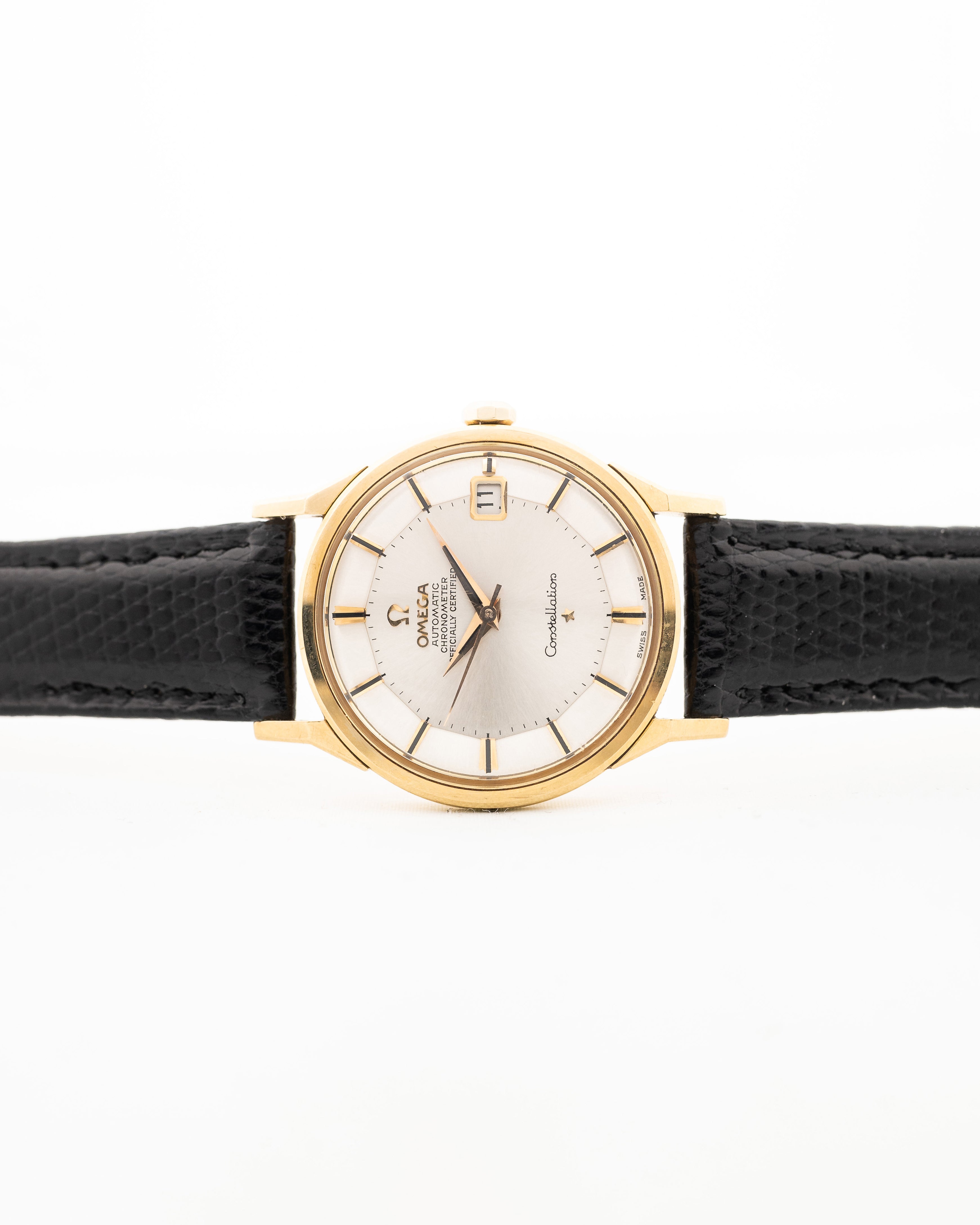 Diese gut proportionierte, schlichte und klassische Constellation verfügt über einen verschraubten Gehäuseboden, das Omega Automatik-Chronometer Kaliber 561 und großartige, leicht nach unten gedrehte Bandanstöße und befindet sich in einem hervorragenden, unberührten Zustand.