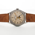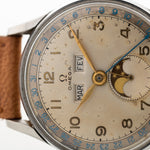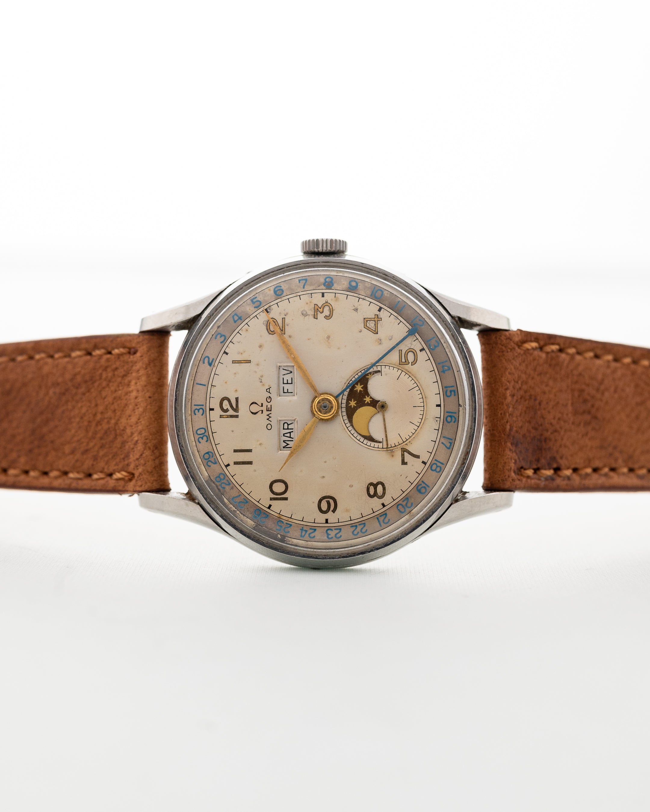 Das Zifferblatt hat in der oberen Hälfte Tages- und Monatsfenster und in der unteren Hälfte eine Mondphase in der großen Subsekundenanzeige. Das äußere Gestell auf dem Zifferblatt ist mit einem auffälligen blauen Datumsring versehen. Die goldenen Zeiger sind alle in hervorragendem Zustand, ebenso wie der Datumszeiger aus gebläutem Stahl - dies ist ein ganz besonderes und cool aussehendes Stück.