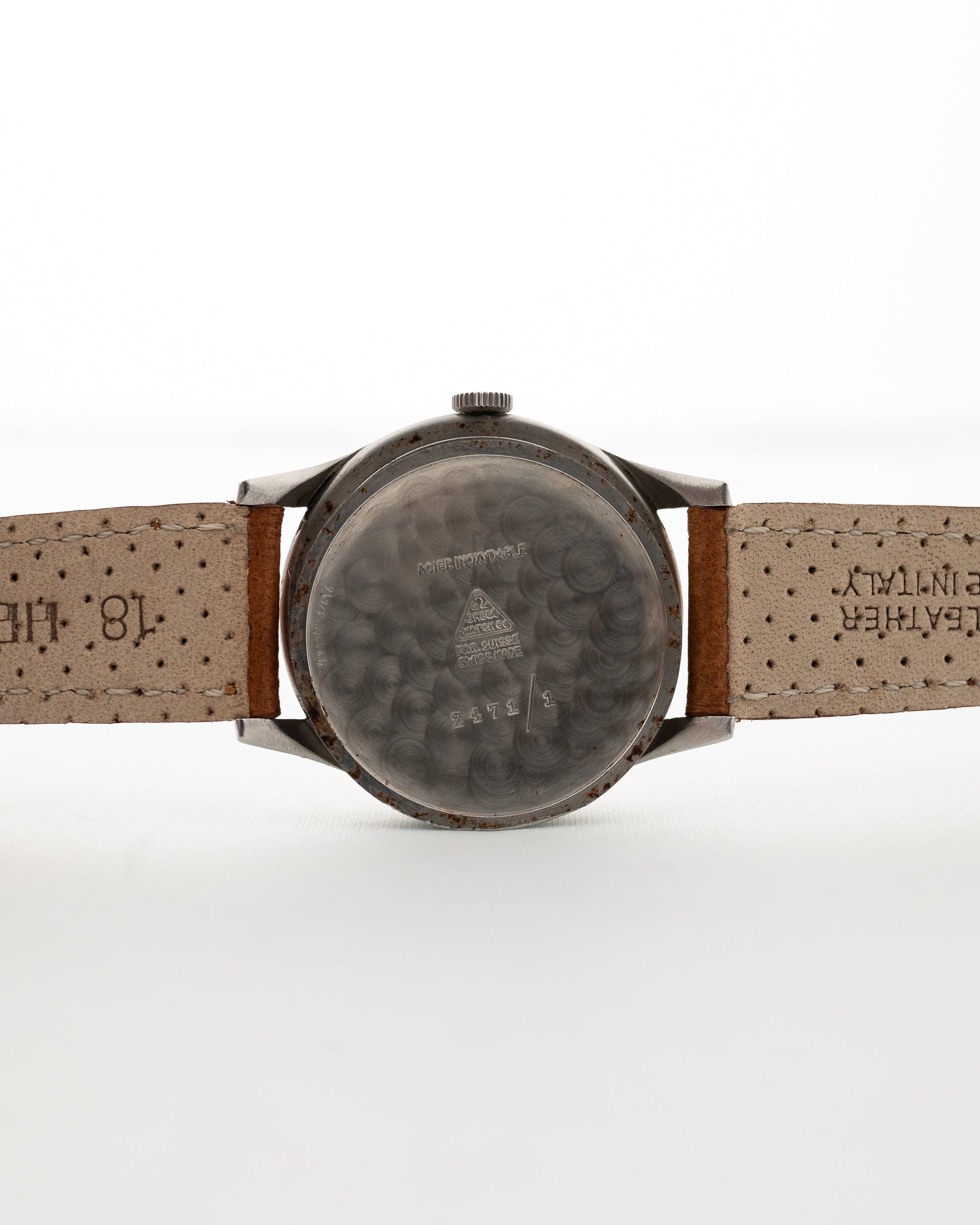 Die Omega Cosmic wurde 1947 eingeführt und war bis 1956 die prestigeträchtigste Uhr im Katalog der Marke. Dieses Exemplar ist eine Referenz 2471-1 aus Edelstahl, misst 35 mm und beherbergt das auf Lemania basierende Uhrwerk Omega Calibre 27 DL PC.