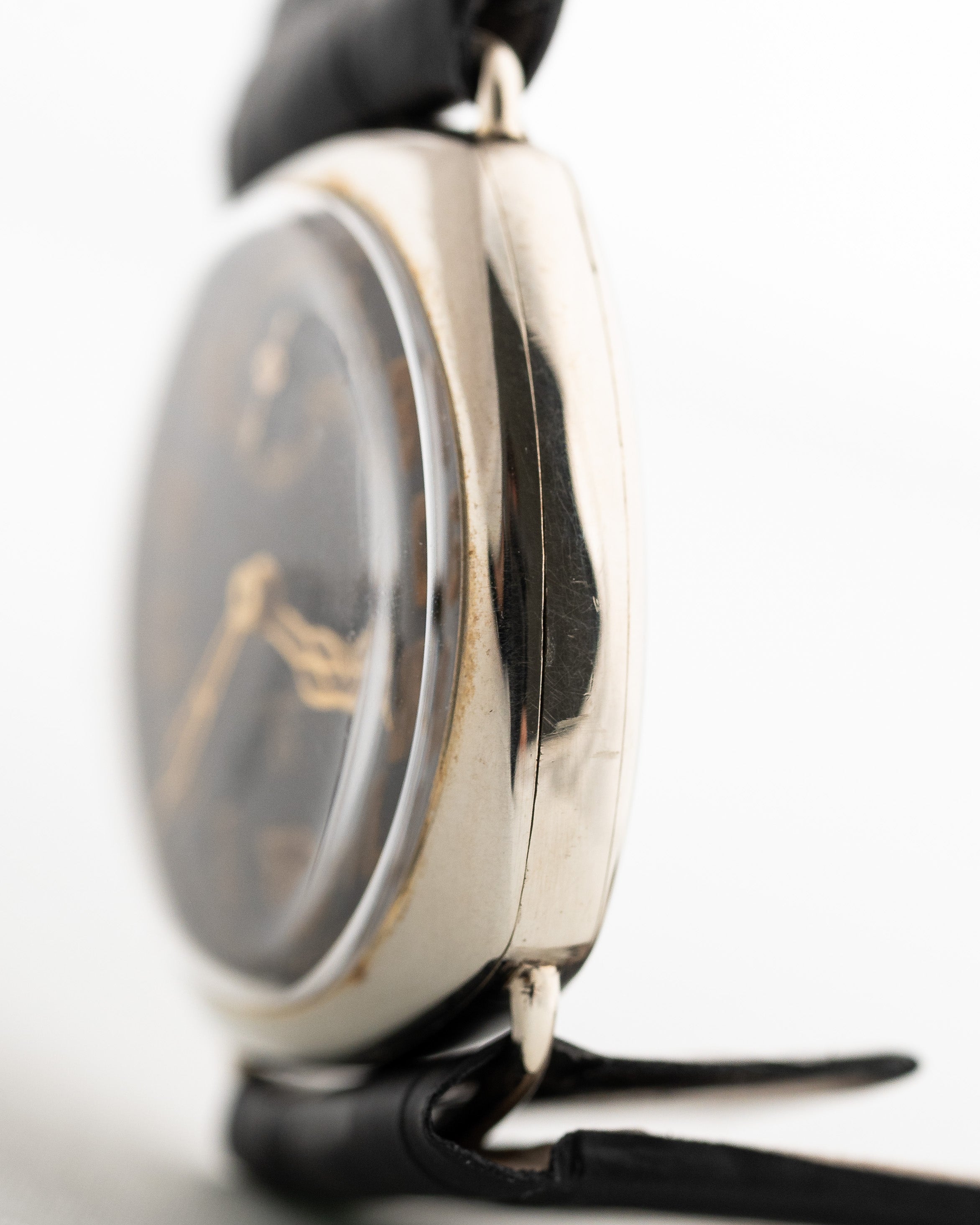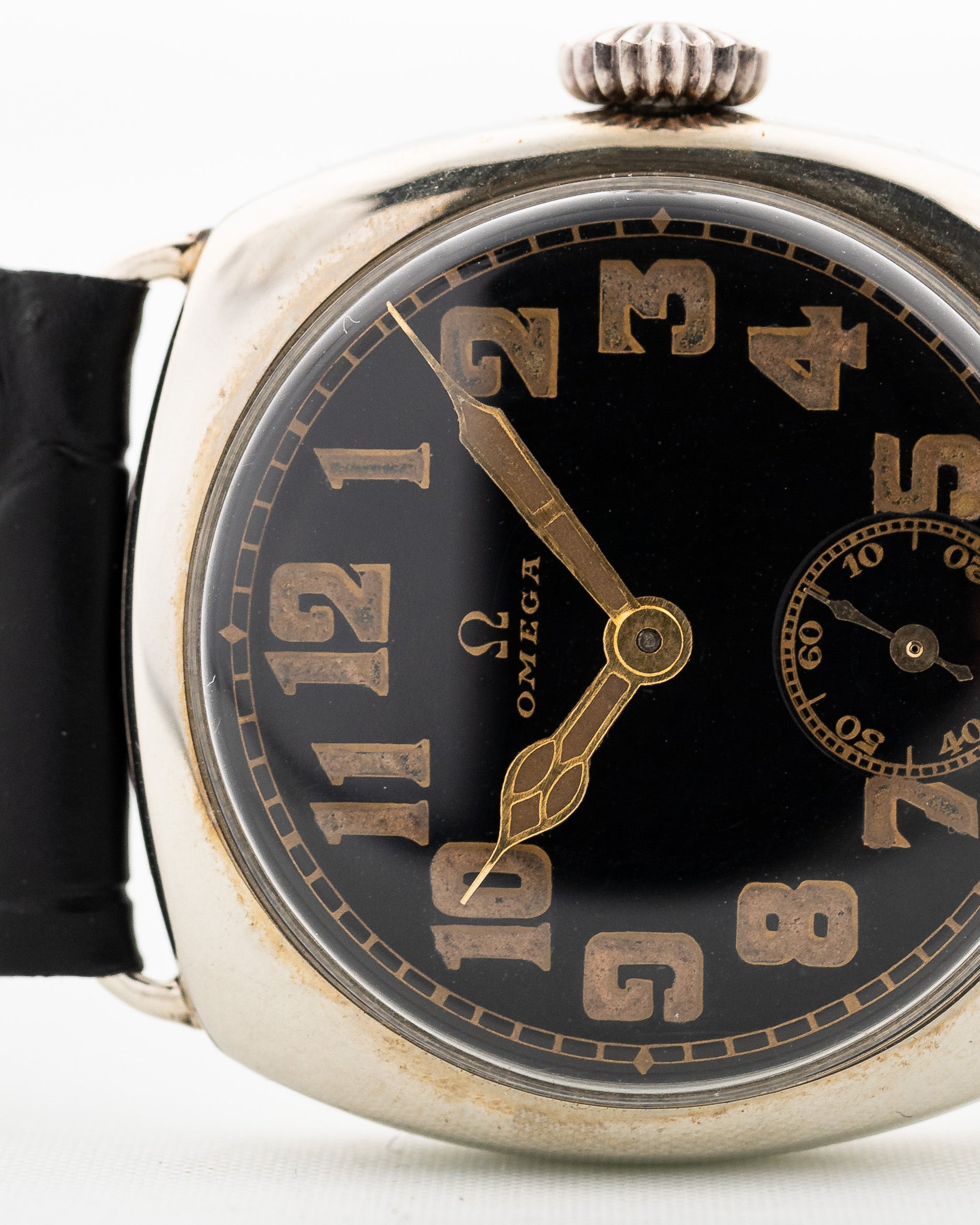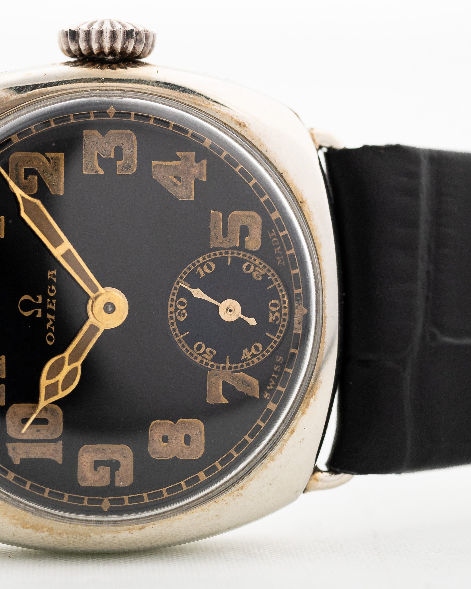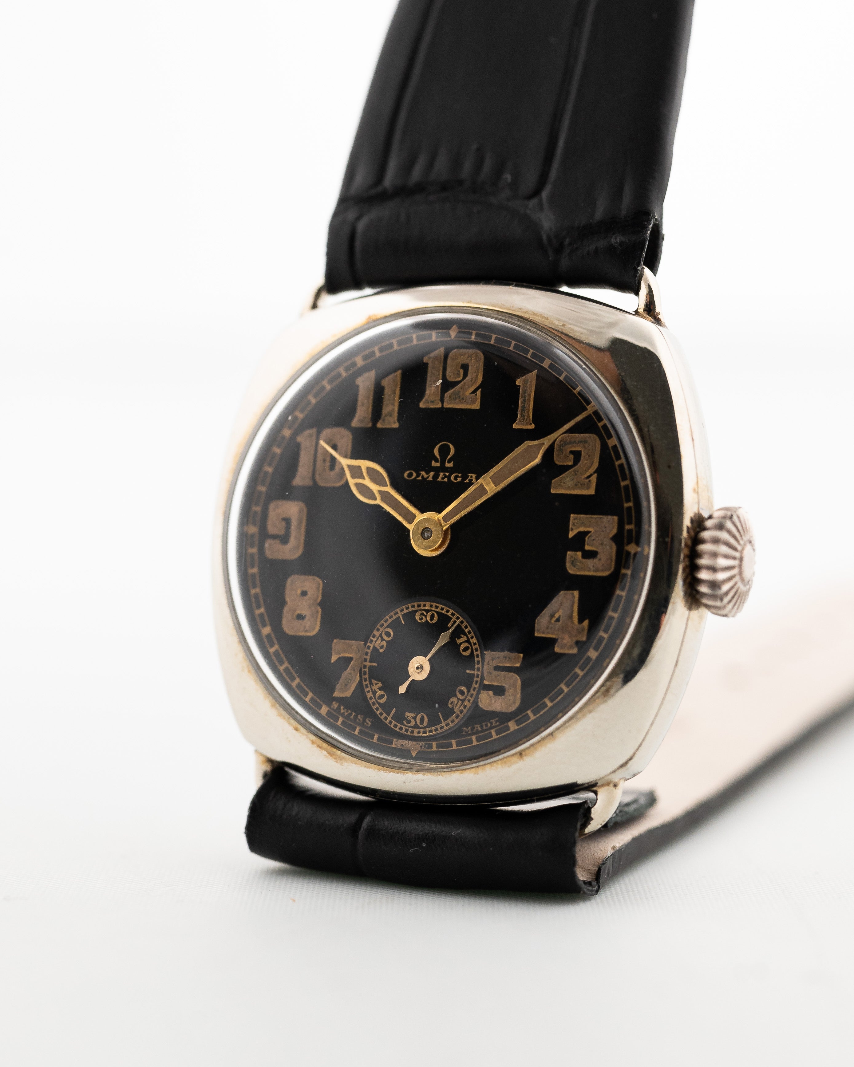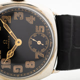 Eine Omega aus den 30er Jahren in gutem Zustand zu finden ist schwierig, aber eine mit einem schönen glänzenden schwarzen Zifferblatt mit goldfarbenen arabischen Ziffern und passenden Kathedralzeigern zu finden ist fast unmöglich.