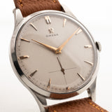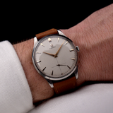 Diese Omega von 1954 hat alles, was Sie sich von einer Armbanduhr wünschen - ein übergroßes 37,5-mm-Gehäuse, ein großartiges Wabenzifferblatt mit untergeordneter Sekunde und schönen Roségoldzeigern und sehr eleganten, überlagerten Roségoldindexen.