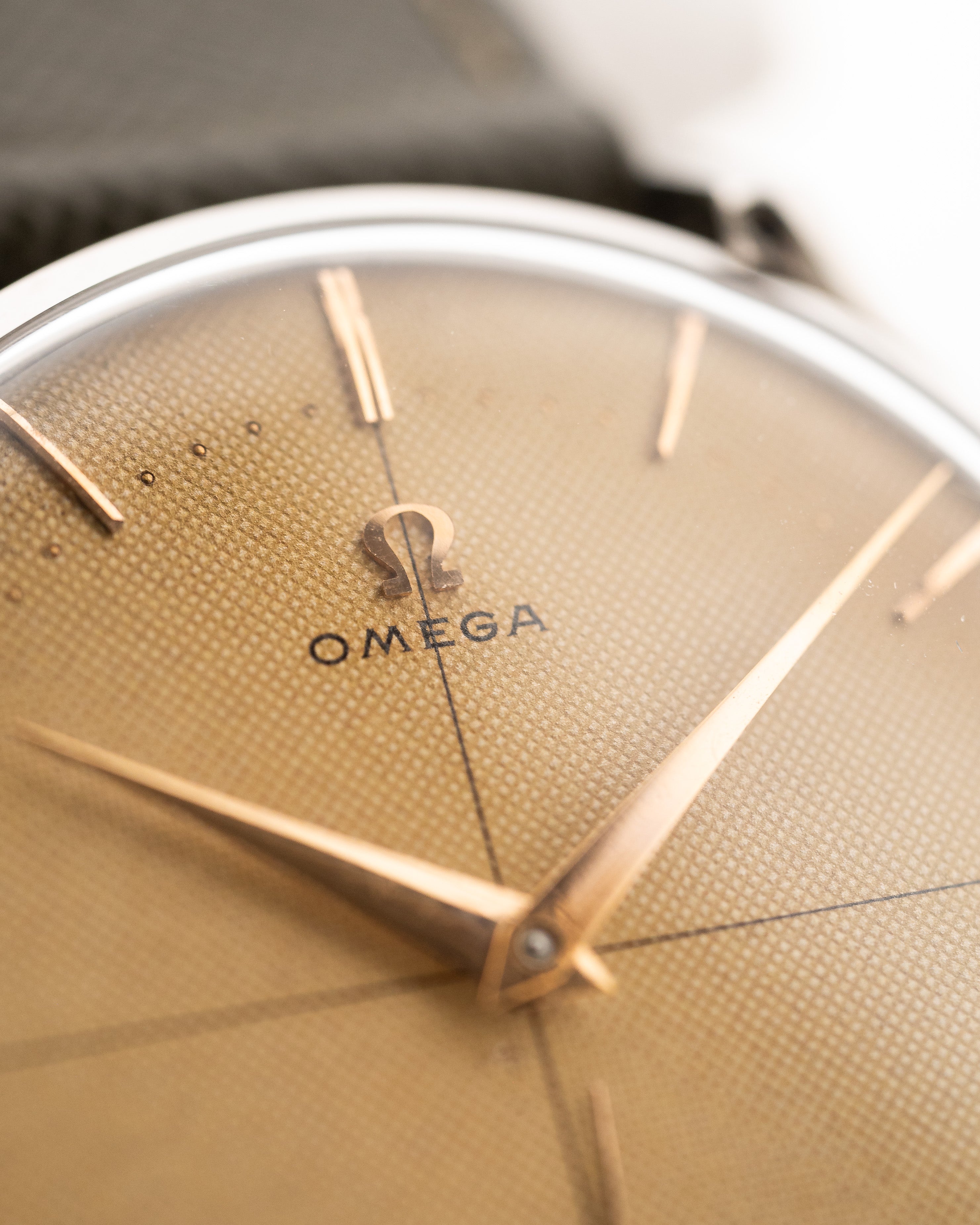 Diese Omega von 1954 hat alles, was Sie sich von einer Armbanduhr wünschen - ein übergroßes 37-mm-Gehäuse, ein großartiges Wabenzifferblatt mit untergeordneter Sekunde und schönen Roségoldzeigern und sehr eleganten, überlagerten Roségoldindexen. Das i-Tüpfelchen sind die seltenen Grasshopper-Anhänger.