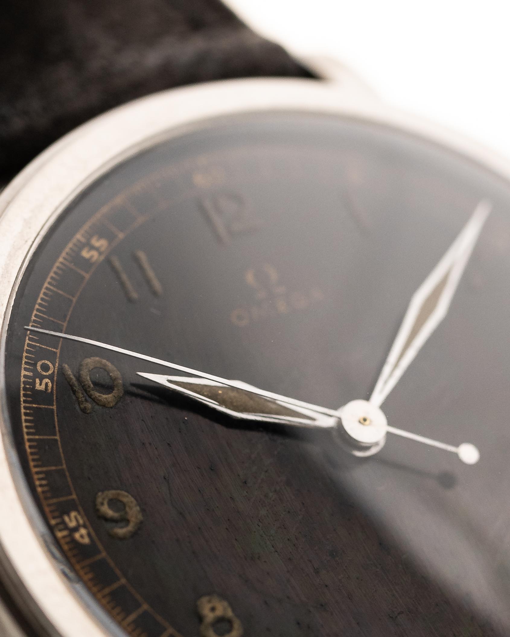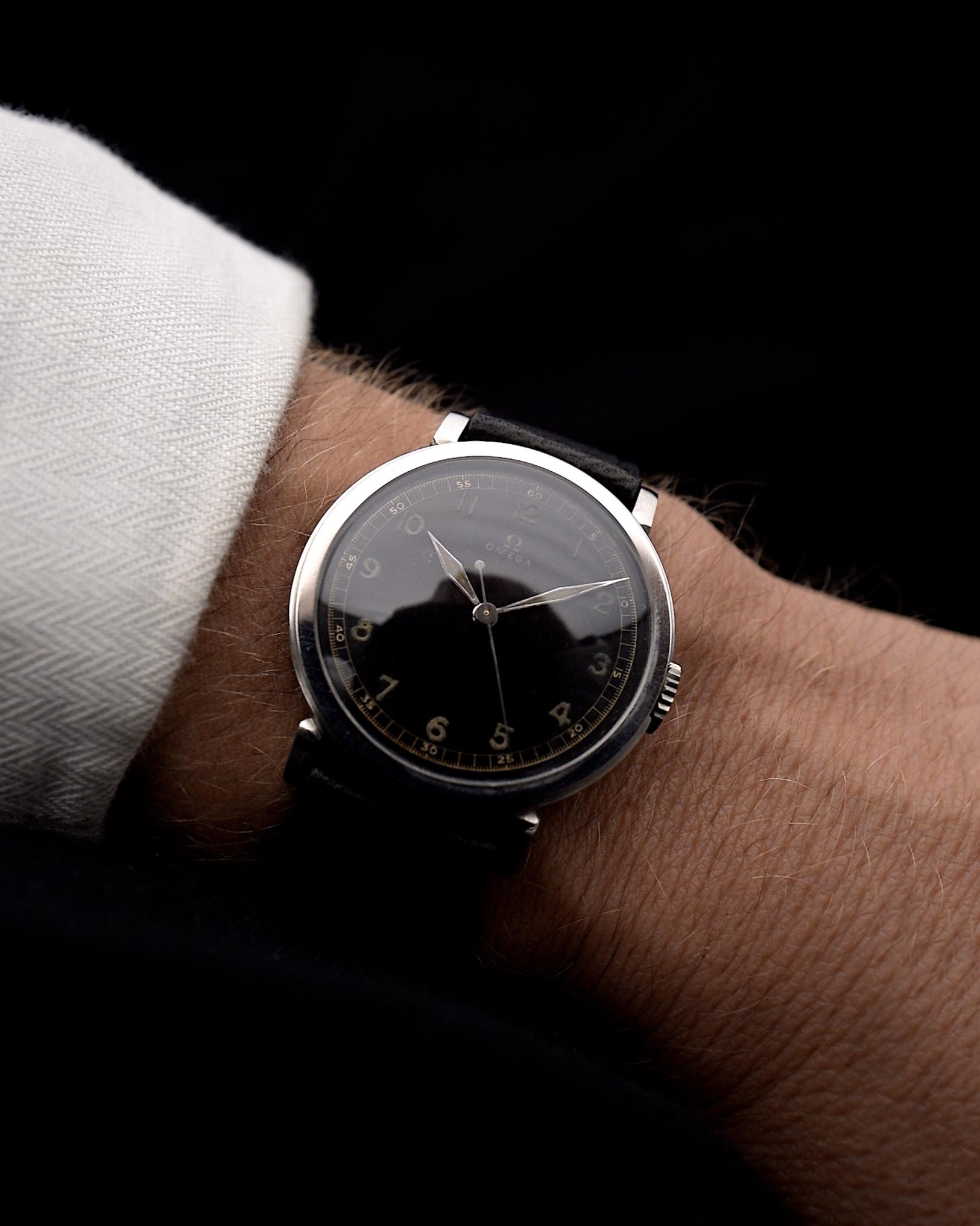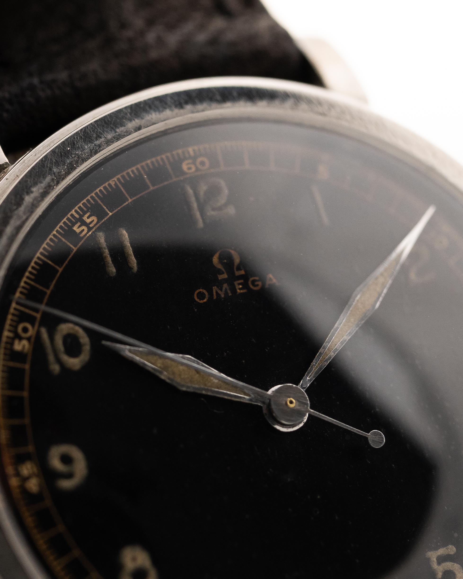Es ist schwierig, eine Omega aus den 30er Jahren in gutem Zustand zu finden, aber eine mit einem schönen glänzenden schwarzen Zifferblatt mit arabischen Ziffern und passenden Schwertzeigern und einer schönen Patina auf der Radiumlume zu finden, ist fast unmöglich.