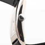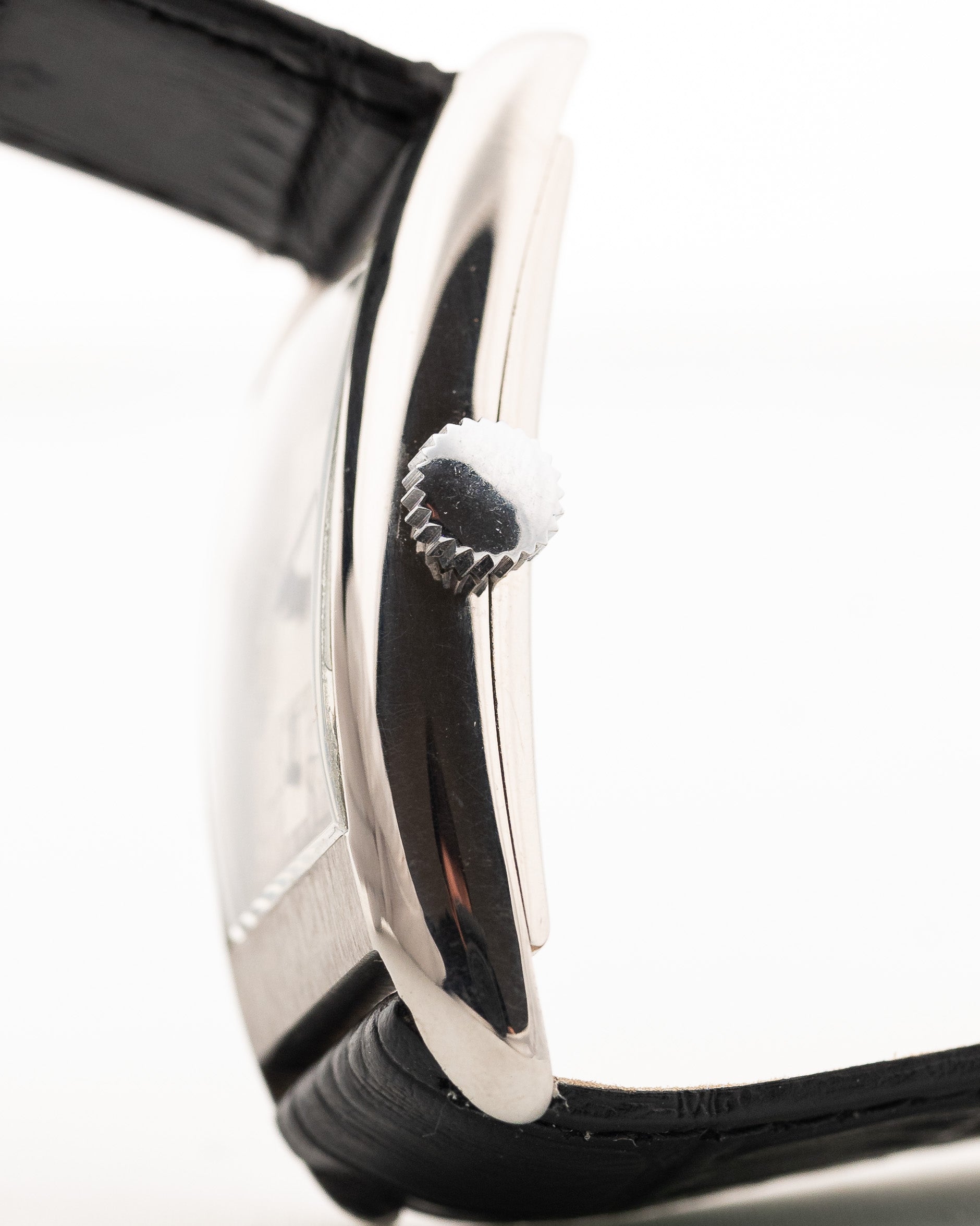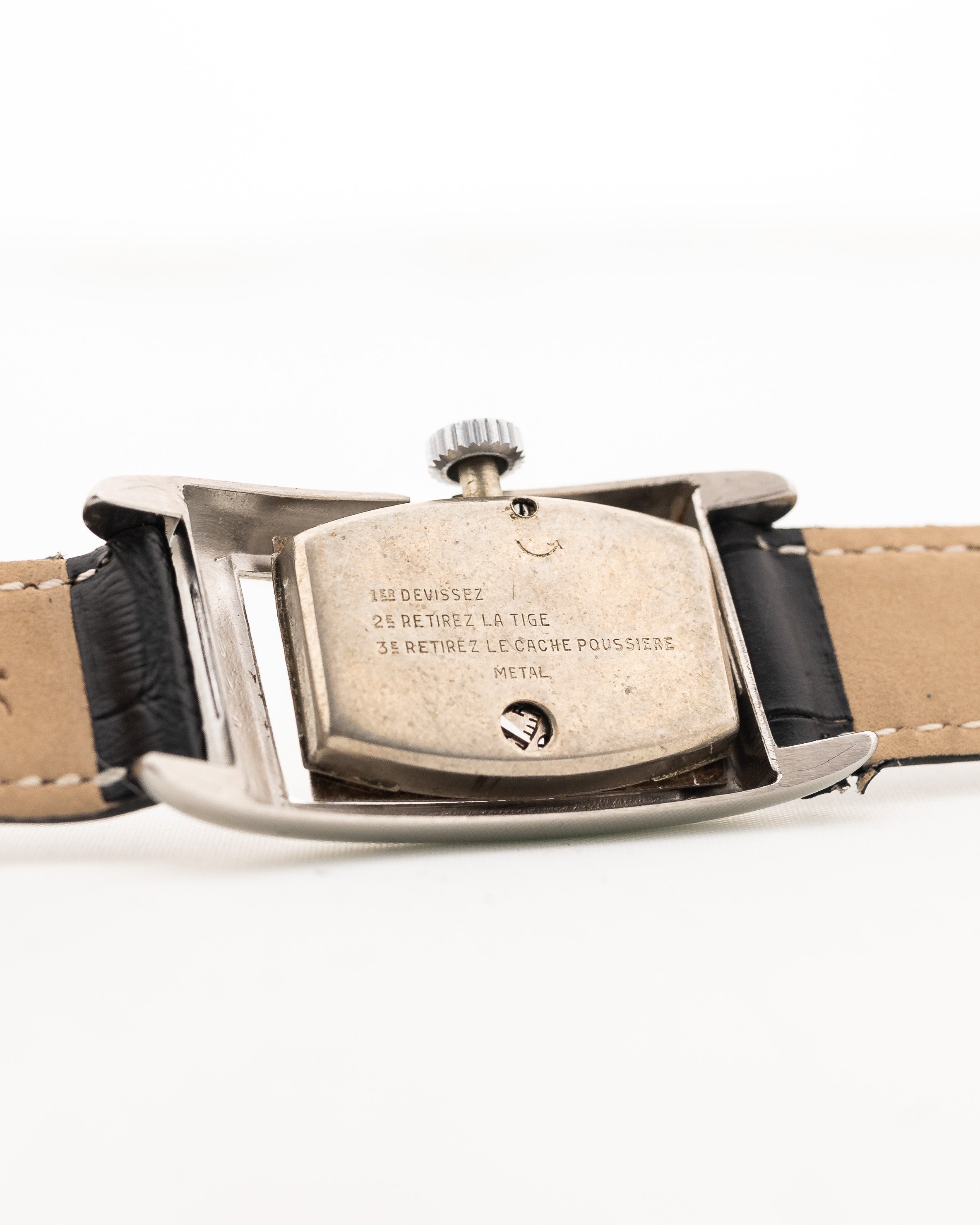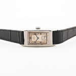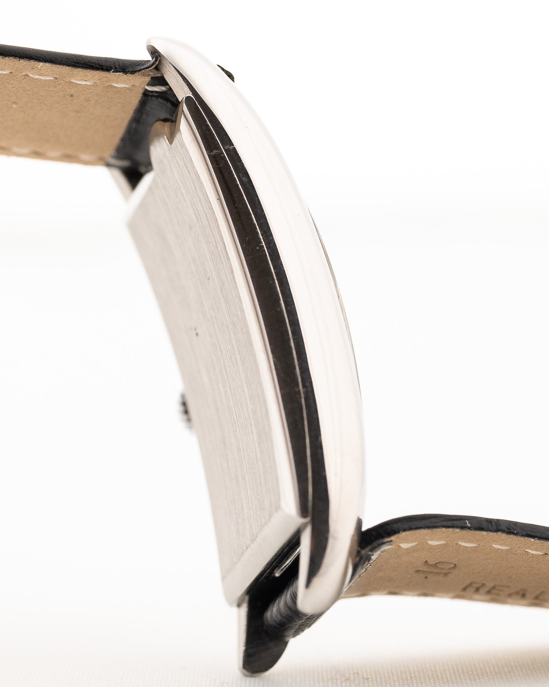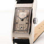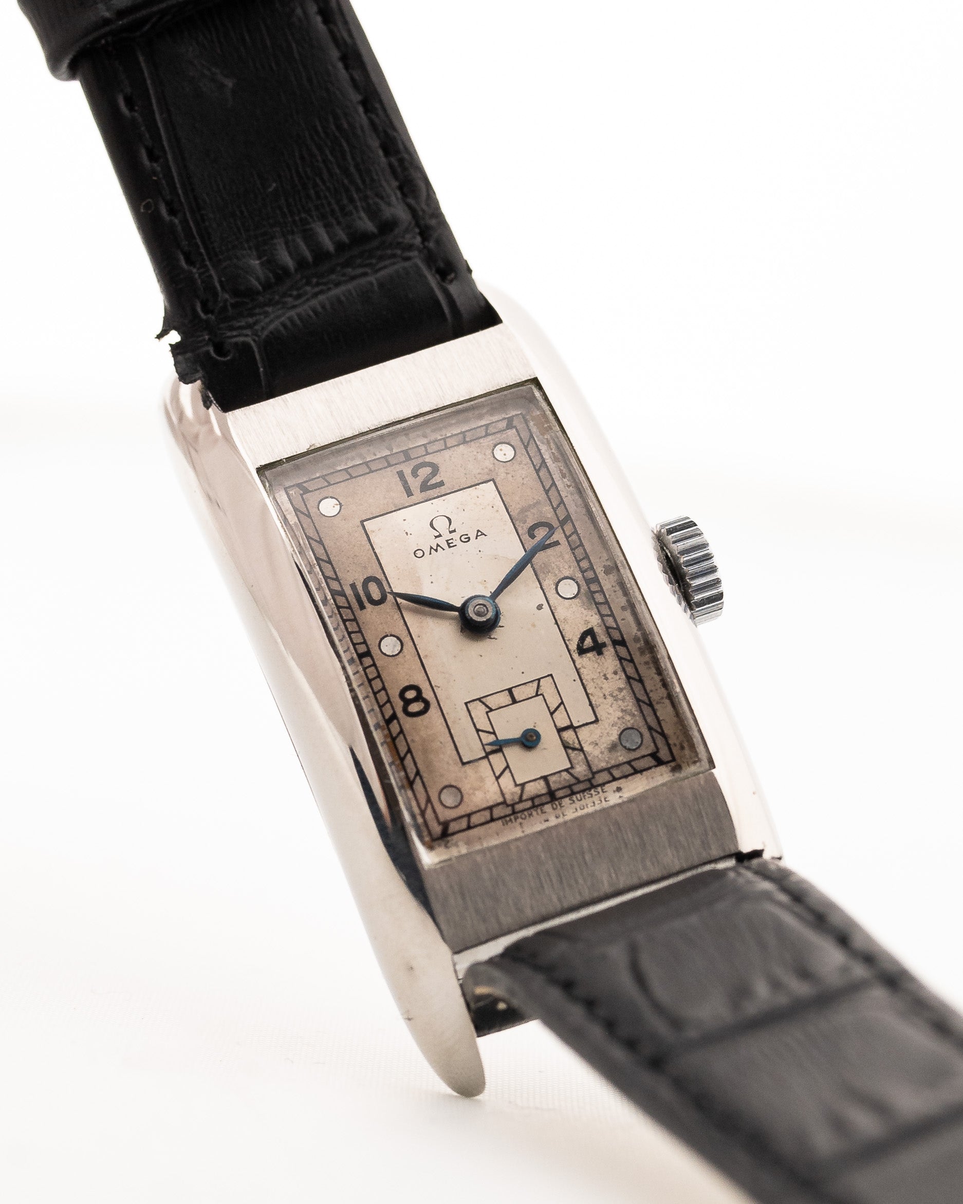 Dies ist nicht die erste Omega Art Deco Dress Watch, in die wir uns verliebt haben. Dieses Exemplar verfügt über ein riesiges rechteckiges Stahlgehäuse und wird durch seine fantastischen blauen Blattzeiger und das cremefarbene zweifarbige Zifferblatt mit arabischen Art Deco-Ziffern und einer kleinen Sekunde noch attraktiver. Außerdem trägt sie sich aufgrund des großen Durchmessers von Ansatz zu Ansatz größer.