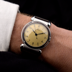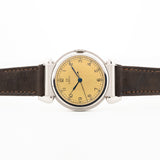Diese Schönheit bietet ein großartiges Gehäusedesign mit einem fantastischen goldfarbenen Zifferblatt und herausragenden blauen Stahlspritzenzeigern. Aufgrund des riesigen Durchmessers von 49,5 mm trägt sie sich eher wie eine 37/38 mm Uhr.
