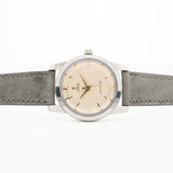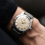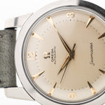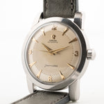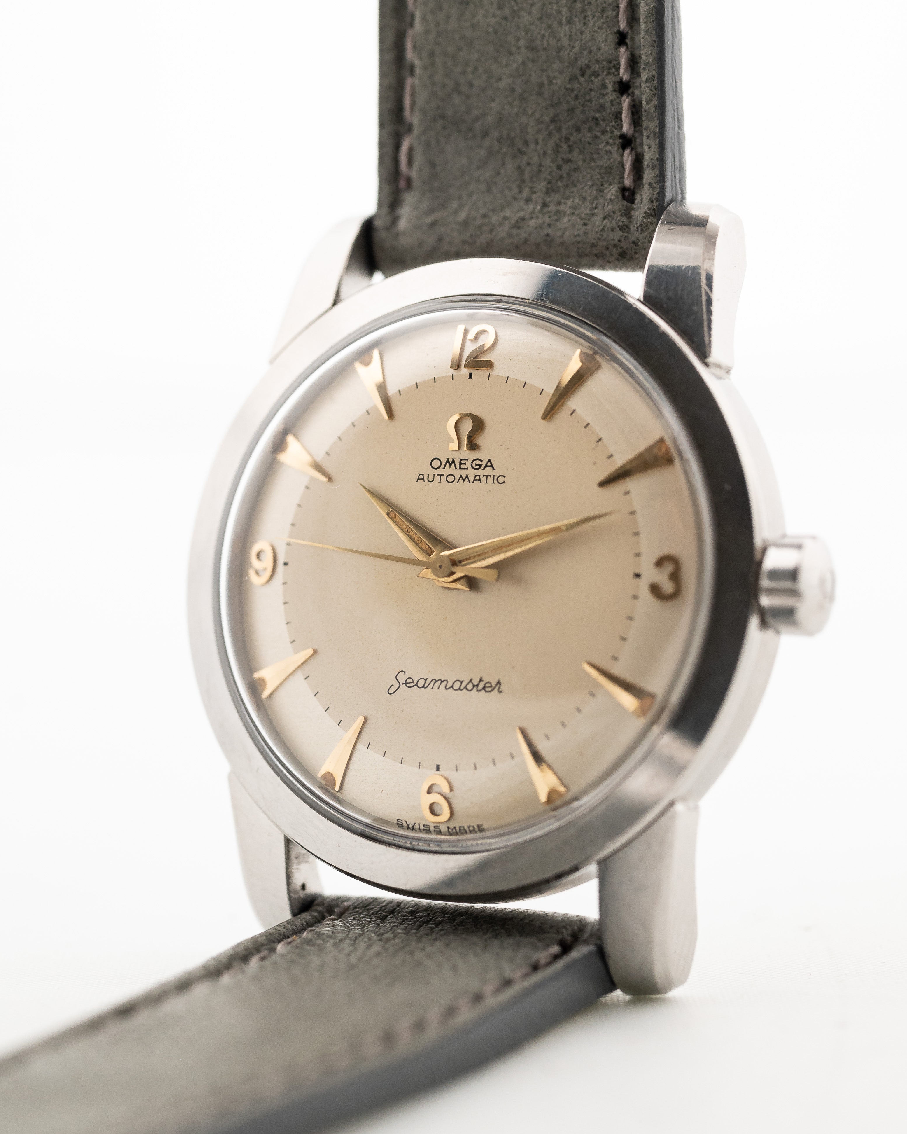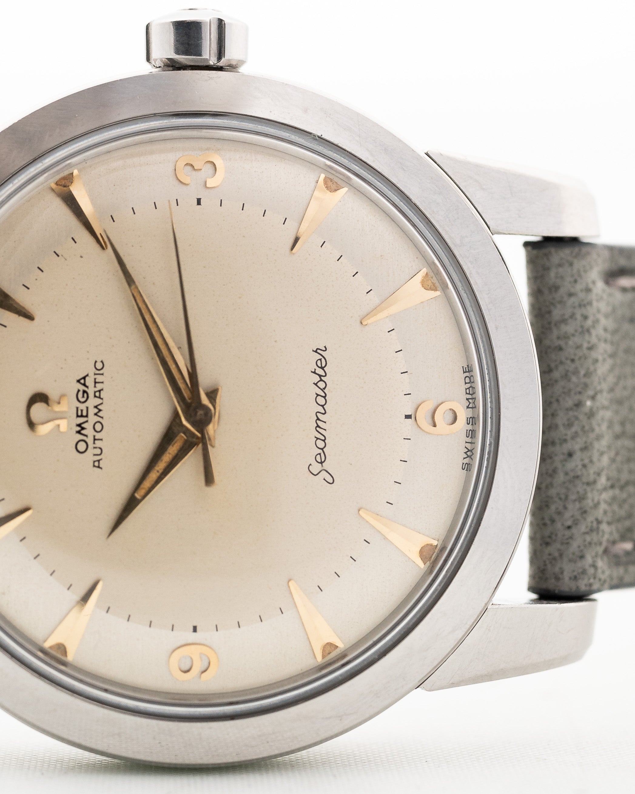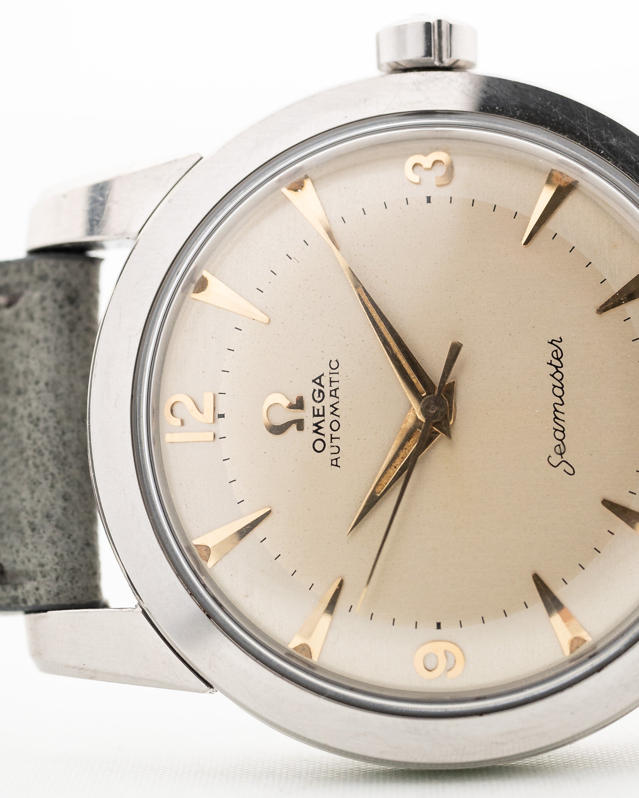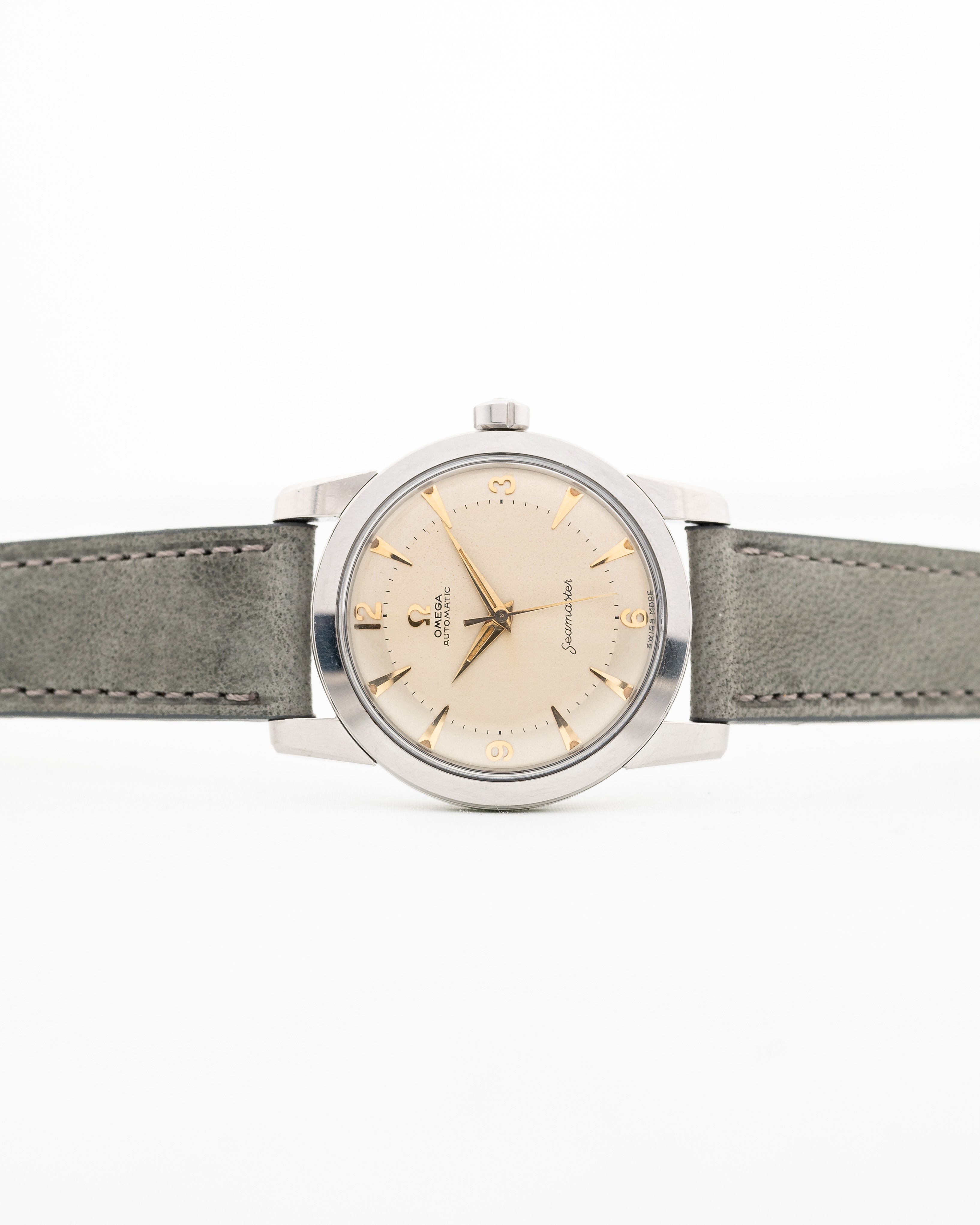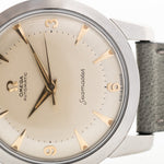 Hier sehen Sie eine faszinierende Seamaster von Omega aus dem Jahr 1952. Sie hat ein 34,5 mm großes Edelstahlgehäuse mit geraden Bandanstößen und ein wunderschönes zweifarbiges cremefarbenes/silbernes Zifferblatt mit Dolchindexen und Dauphinezeigern.