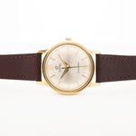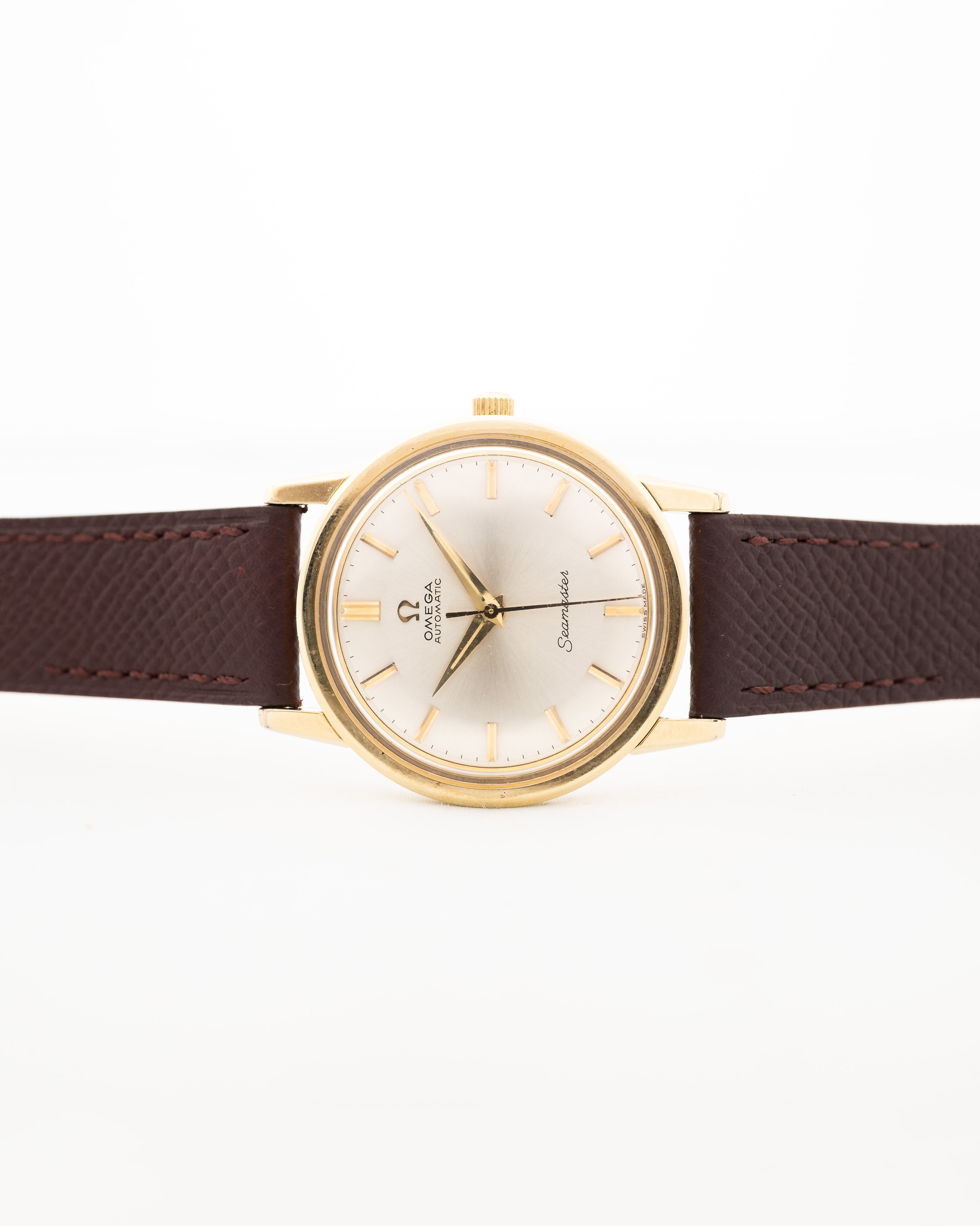 Hier sehen Sie eine faszinierende Seamaster von Omega aus dem Jahr 1962. Sie hat ein 34,5 mm großes, vergoldetes Edelstahlgehäuse mit geraden Bandanstößen und ein wunderschönes, sauberes silbernes Zifferblatt mit Sonnenschliff und Strichindizes und Zeigern.