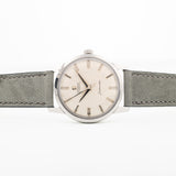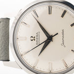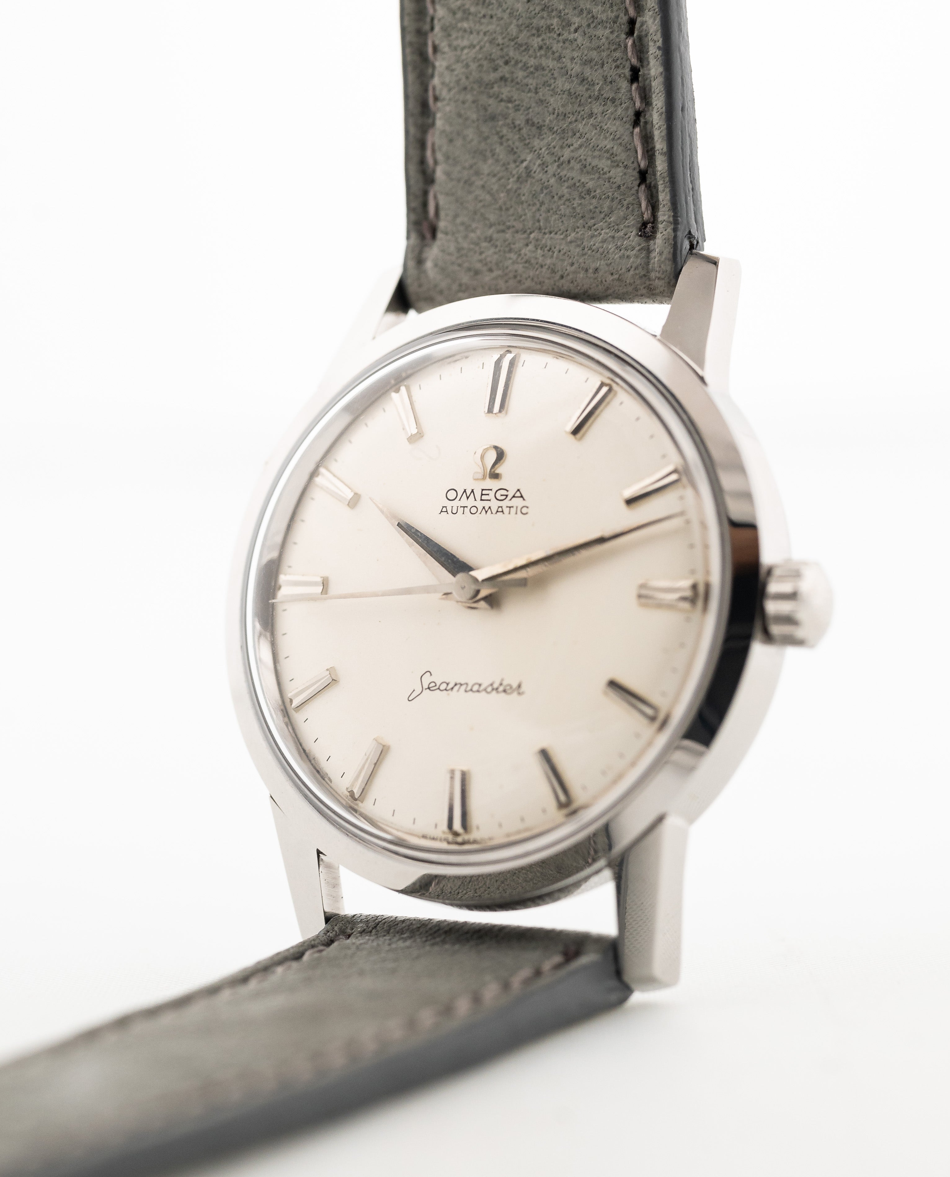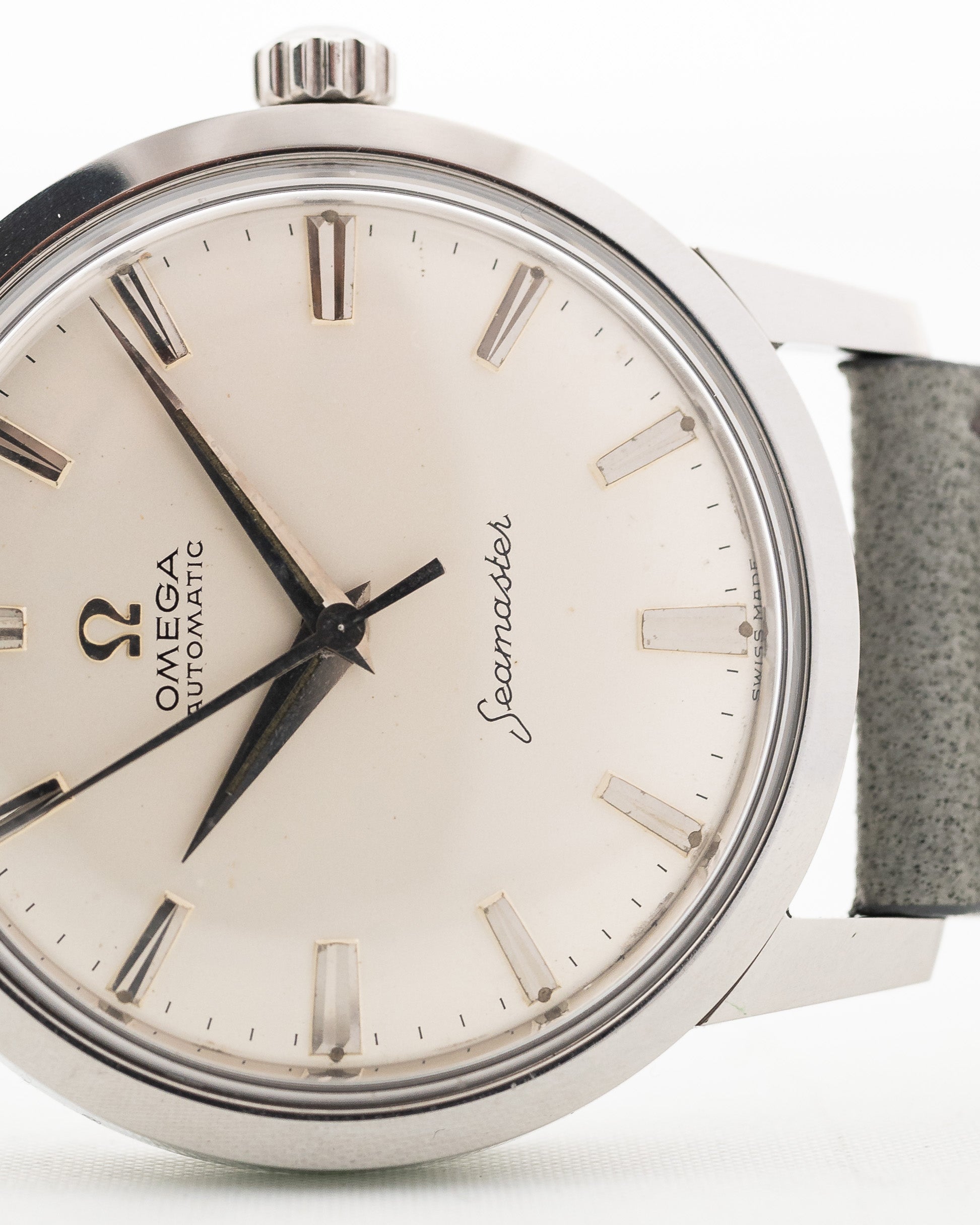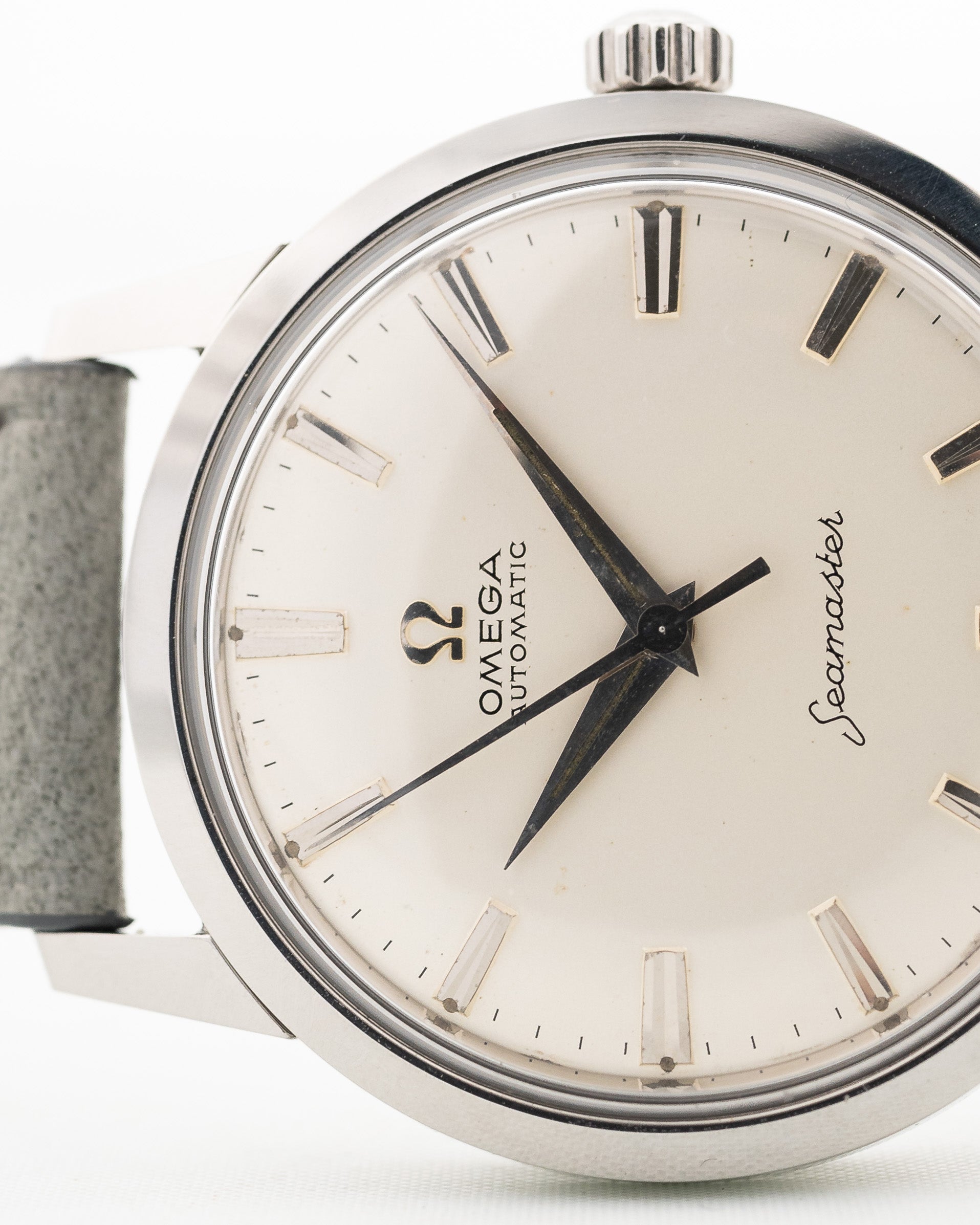 Hier sehen Sie eine faszinierende Seamaster von Omega aus dem Jahr 1962. Sie hat ein 34 mm großes Edelstahlgehäuse mit geraden Bandanstößen und ein schönes, sauberes weißes Zifferblatt mit schönen Stundenmarkierungen und Dauphine-Zeigern.