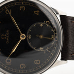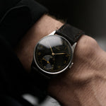 Ausgestattet mit einem 33 mm Stahlgehäuse, geraden Bandanstößen und einem wunderschönen schwarzen Zifferblatt ist diese Uhr wirklich unschlagbar. Das vergoldete Zifferblatt ist wunderschön gealtert und verfügt über arabische Ziffern, eine Sekundenskala und Spritzenzeiger, die diese Uhr noch einen Tick eleganter machen.